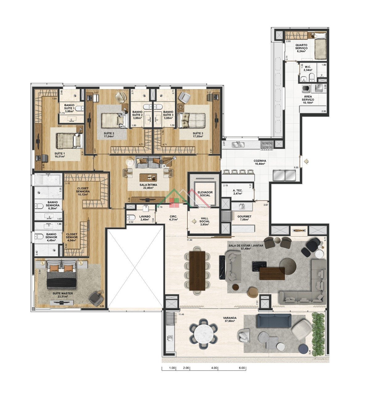 Este apartamento possui 328 m² de área privativa, pé-direito duplo na sala de estar, lareira e varanda com churrasqueira, a Torre 3 do Lake Victoria impressiona pela arquitetura interna, amplitude dos espaços e exclusividades pensadas para o bem-estar dentro de casa. Área íntima com family room e mais quatro suítes, sendo a master com closet e banheiros individualizados para o Sr. e a Sra..