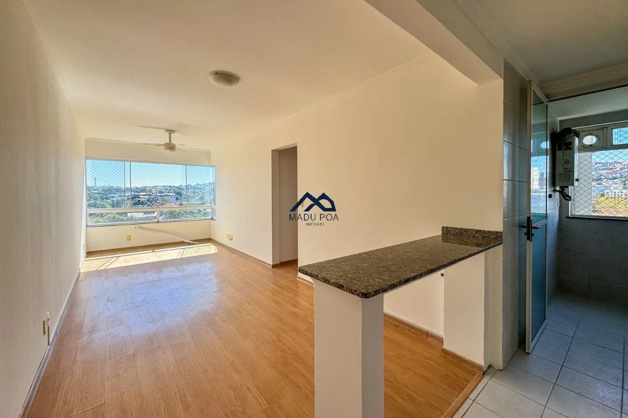Living amplo para dois ambientes, cozinha americana com móveis sob medida, área de serviço, três dormitórios, sendo dois deles com móveis sob medida, closet, banheiro social. Uma vaga de garagem.