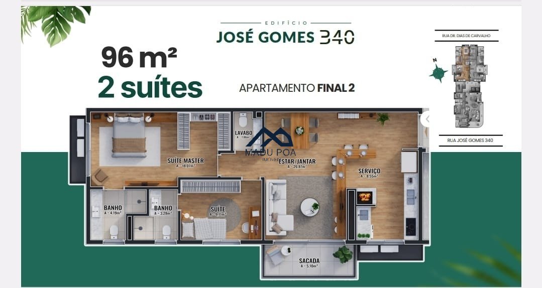 Apartamento com duas suítes, 96m², lavabo, Cozinha com churrasqueira, sacada e duas vagas de garagem.