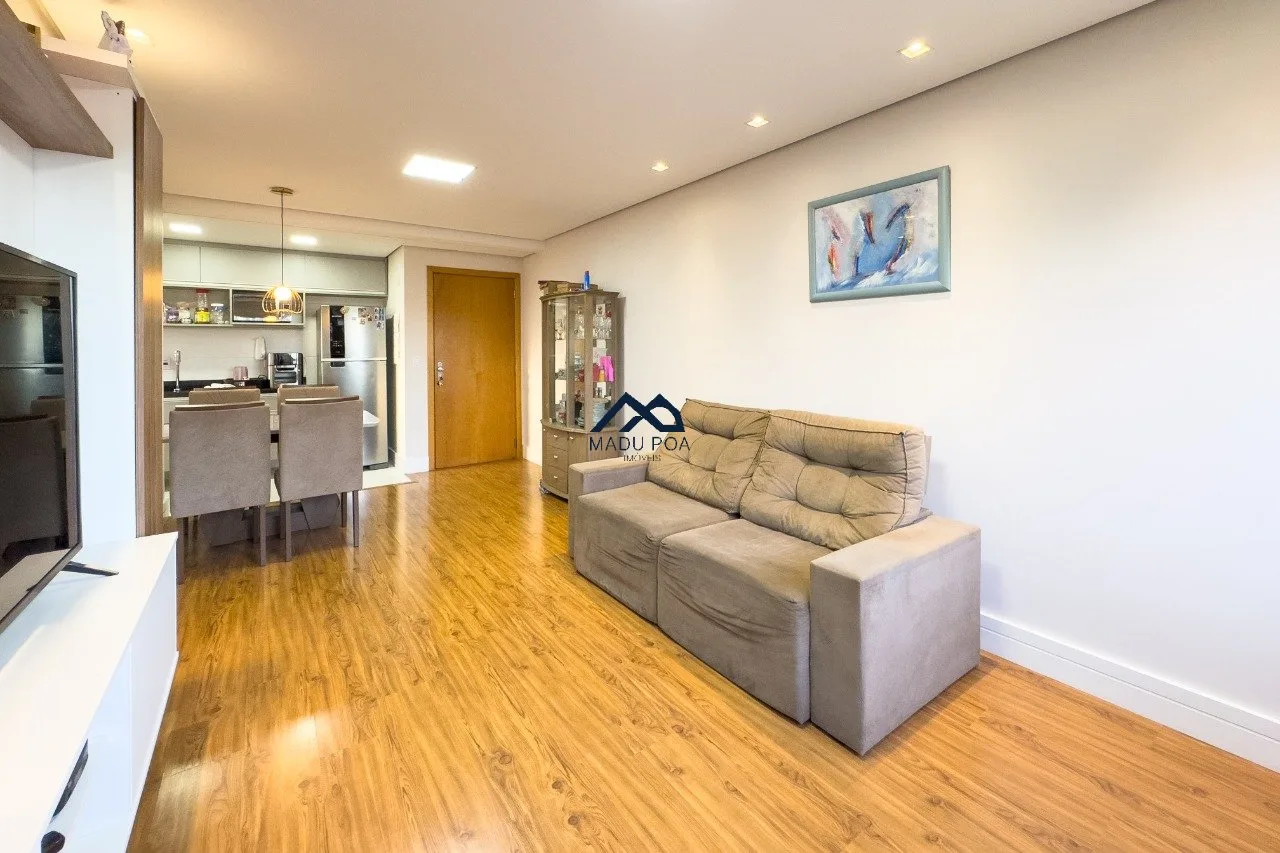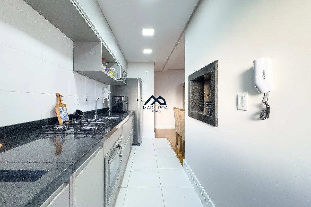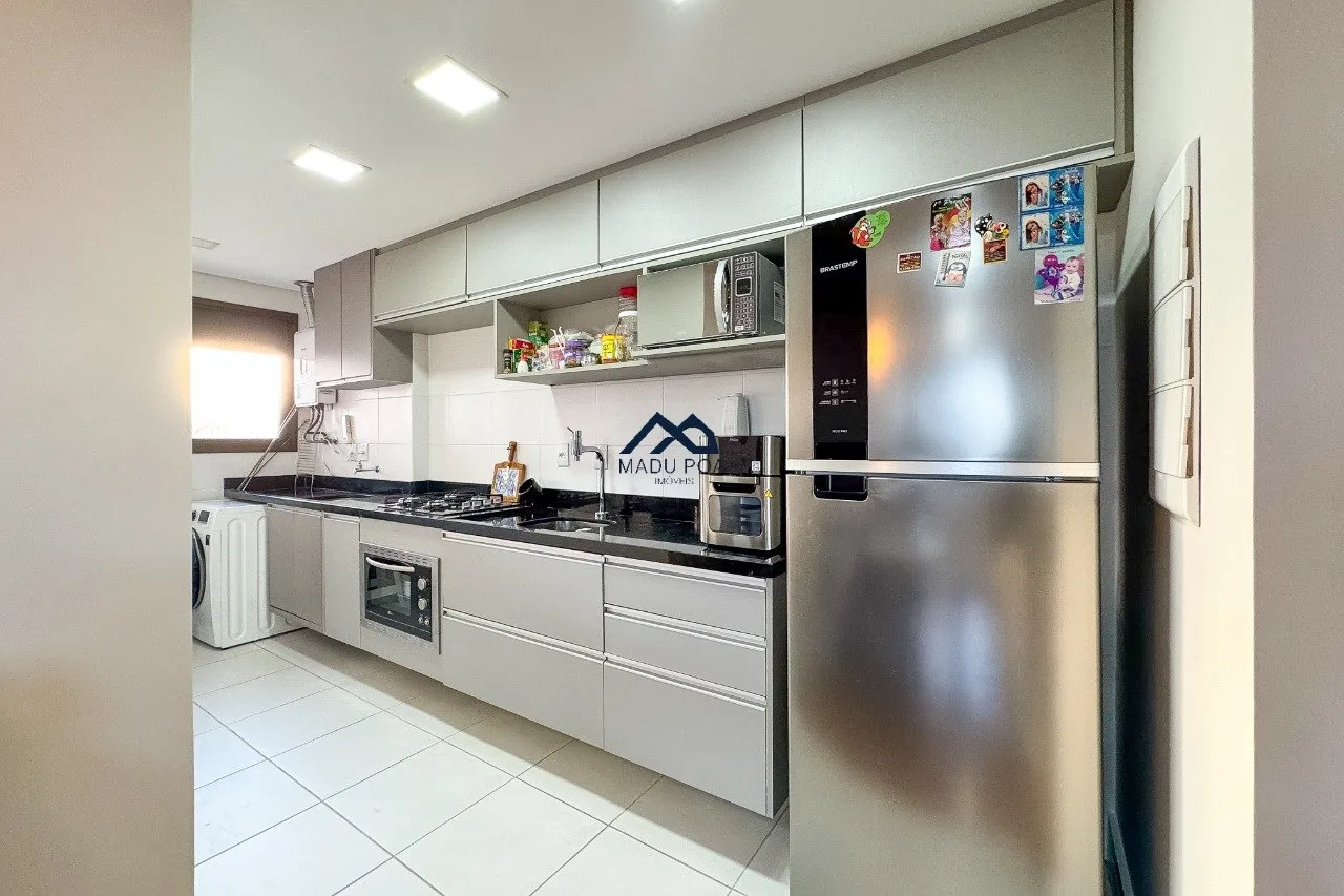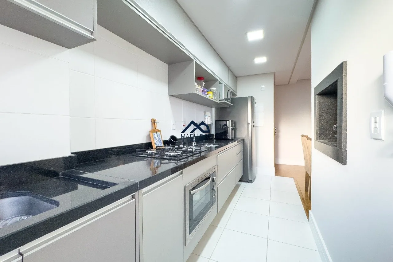 Living para dois ambientes, cozinha com móveis sob medida, churrasqueira e lavanderia.