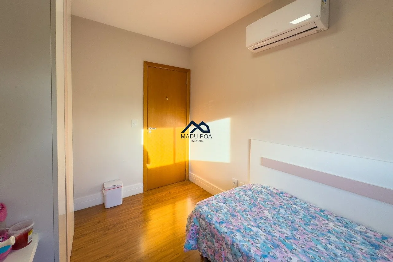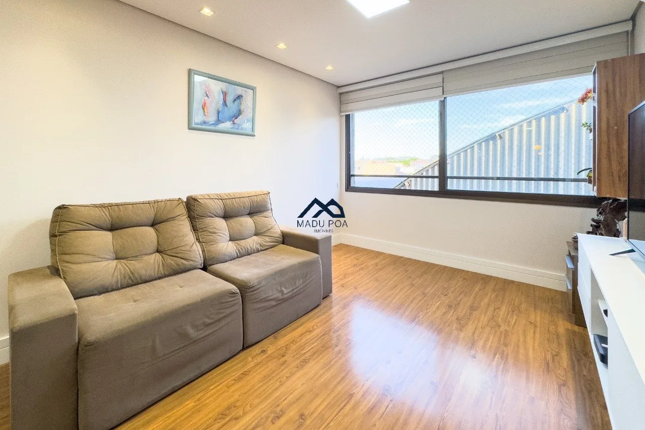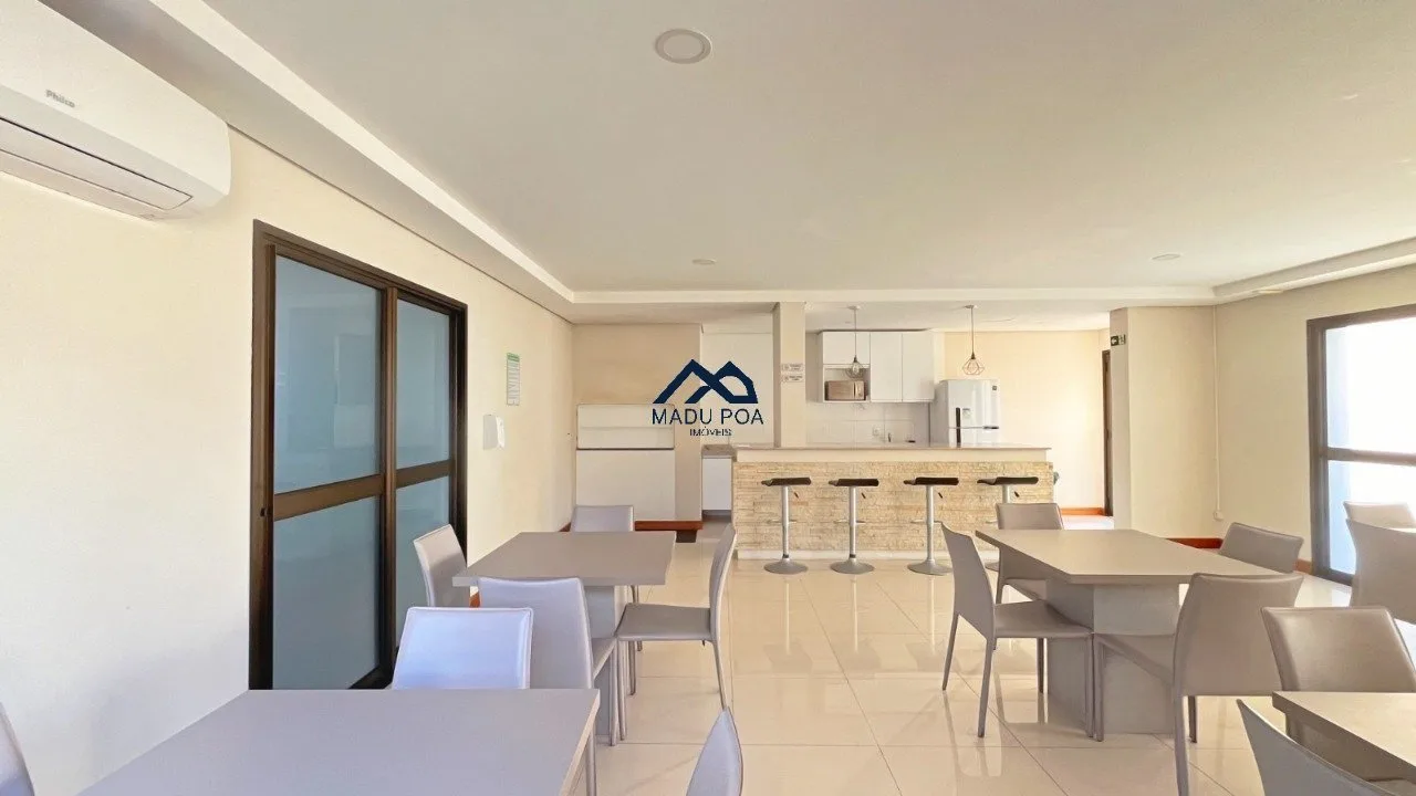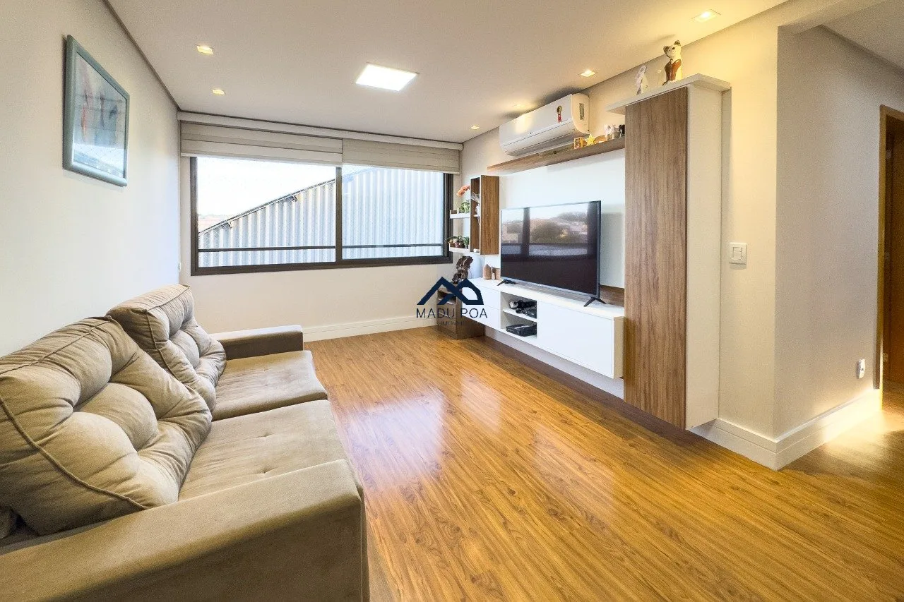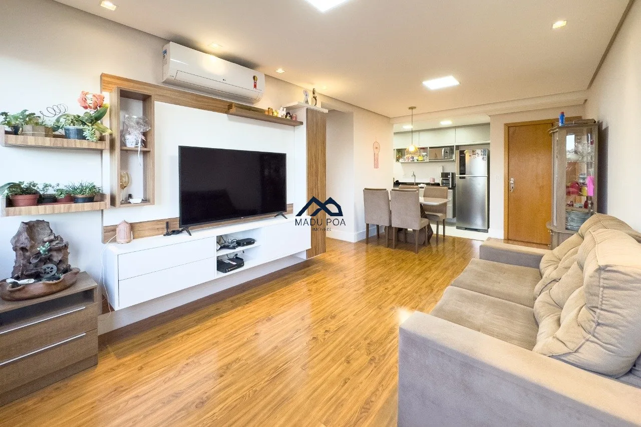 Living para dois ambientes, cozinha com móveis sob medida, churrasqueira e lavanderia.