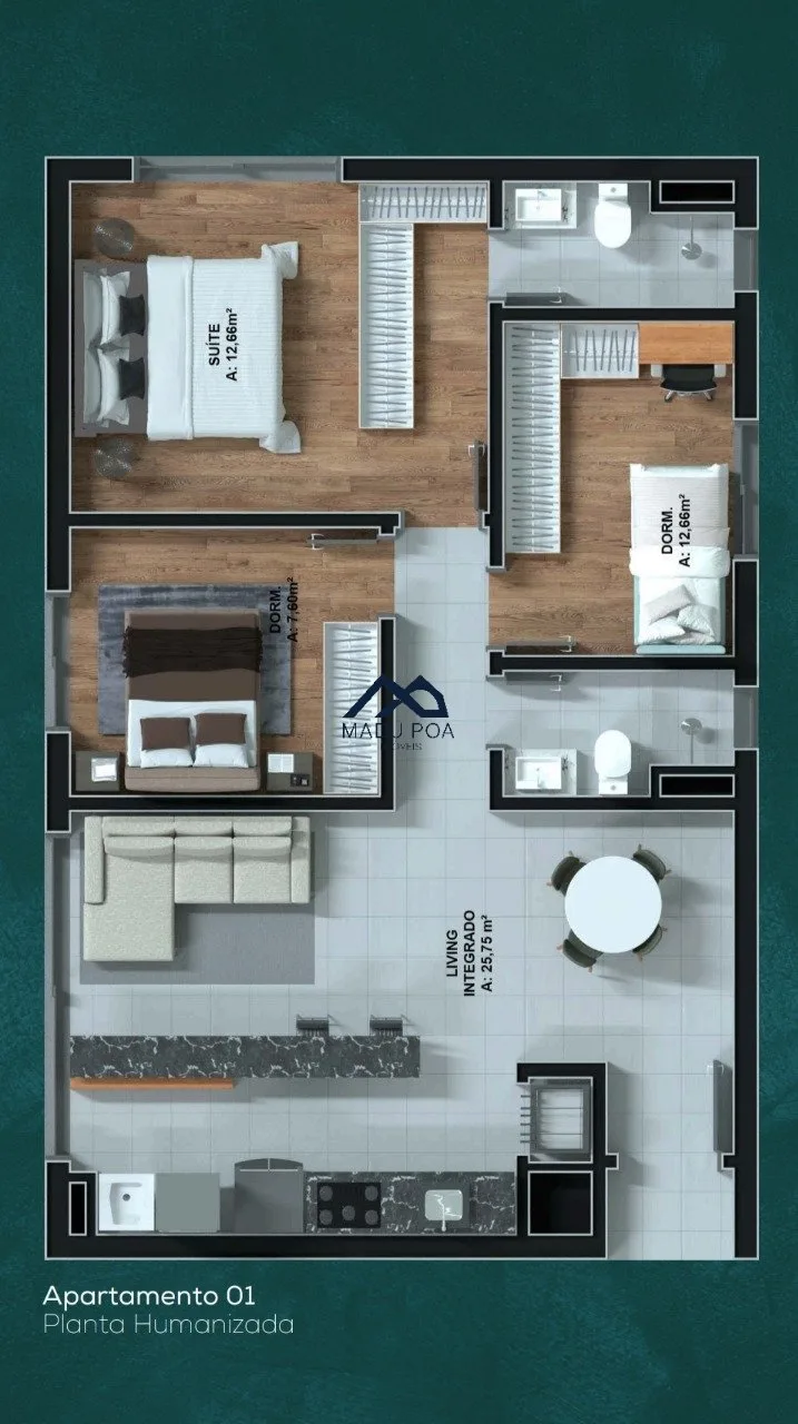 Apartamento Tipo: Três dormitórios com suíte, com 71m²,.Living copa cozinha com churrasqueira.