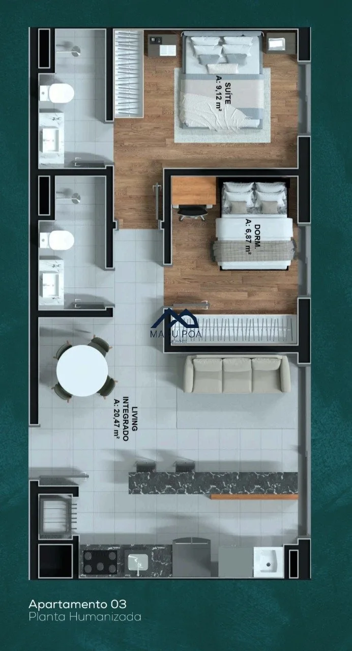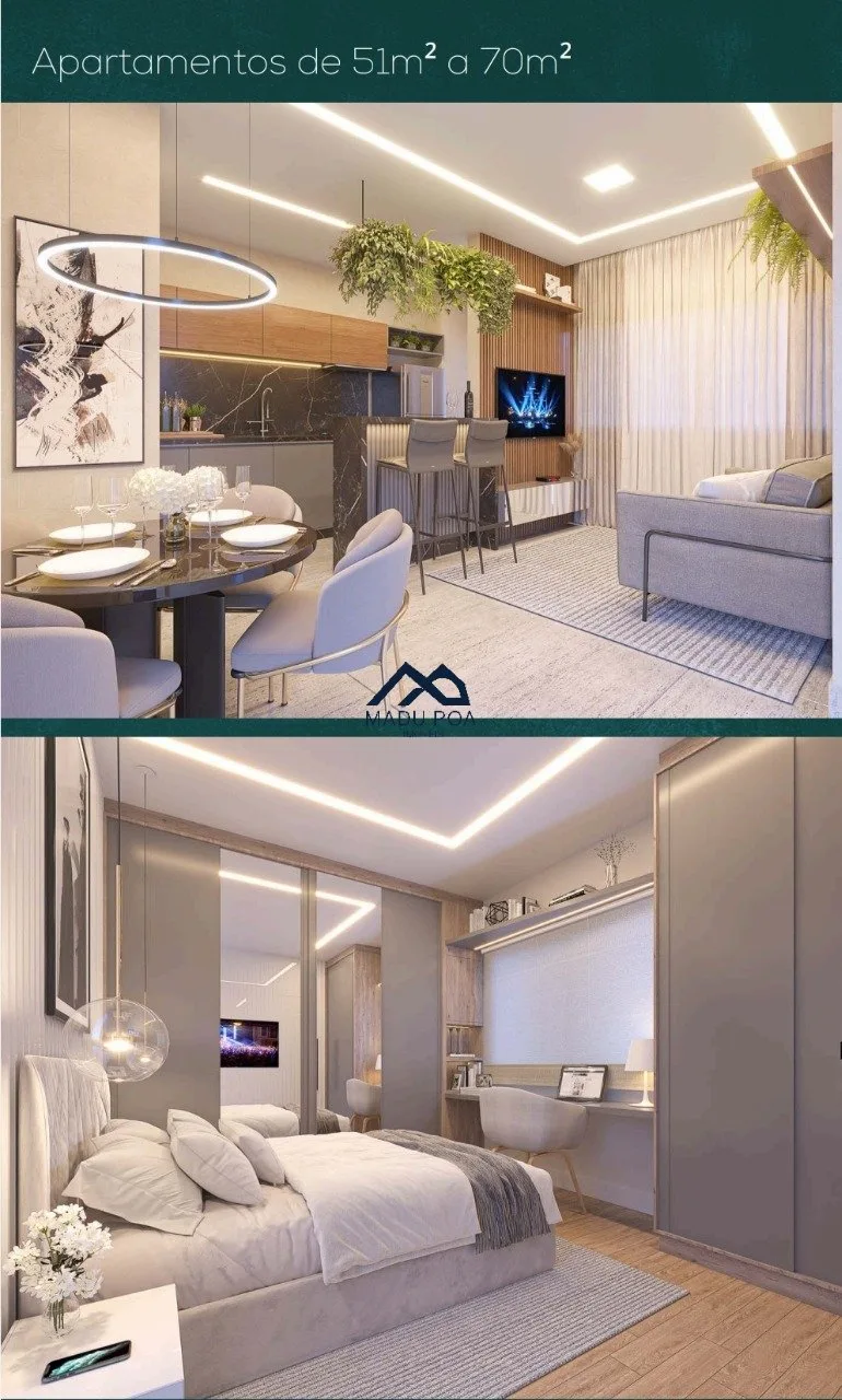Apartamento Tipo: Dois dormitórios com 70m², copa cozinha com churrasqueira.