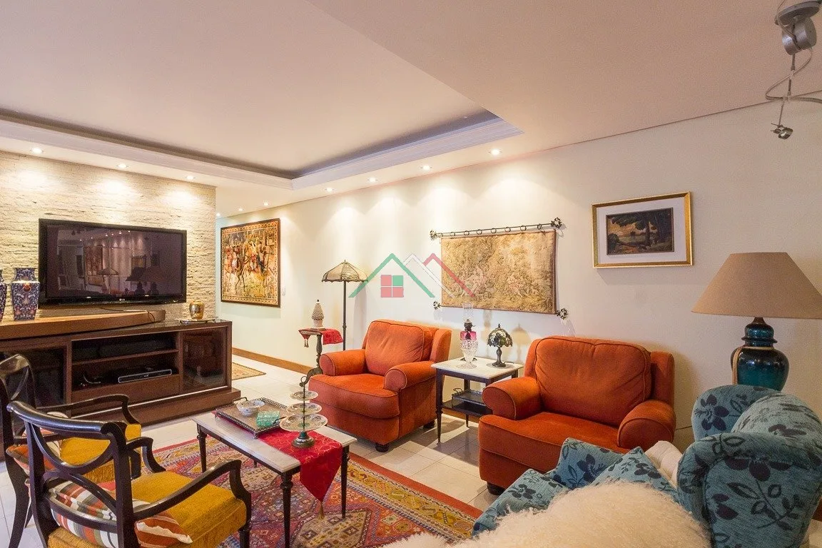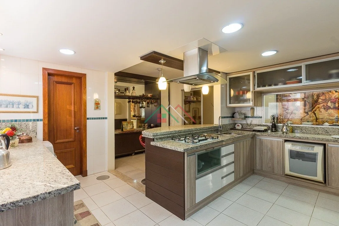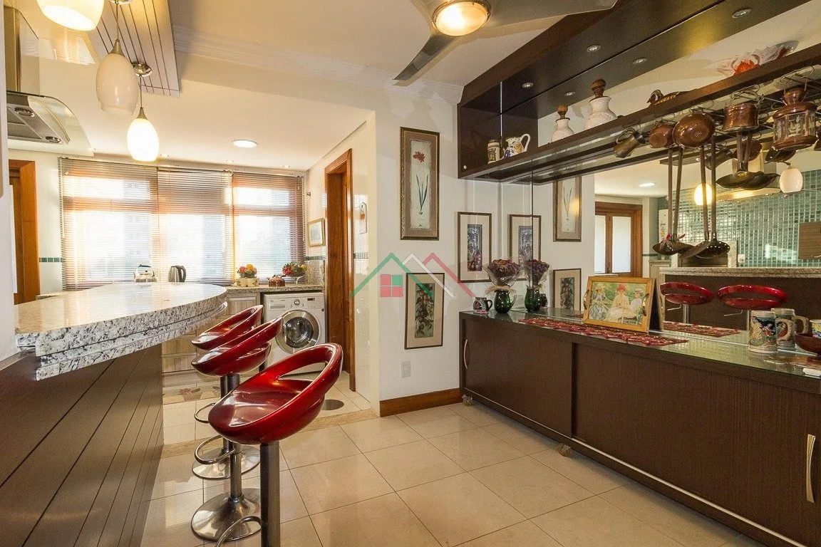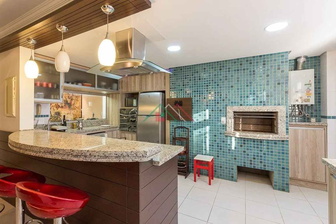 Living para três ambientes com lareira, lavabo, copa cozinha com churrasqueira e móveis planejados, dependência de empregada, gabinete. São três dormitórios, um deles suíte com closet e sacada.