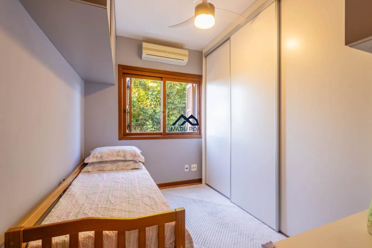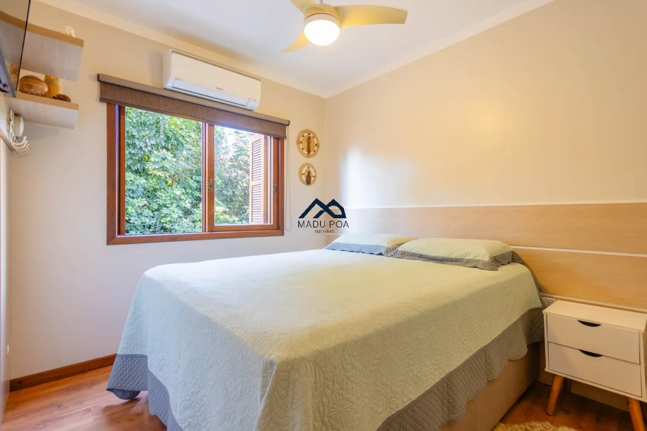 São dois dormitórios, sendo uma suíte e banheiro social. Ficam os ares condicionados e fechadura eletrônica.
