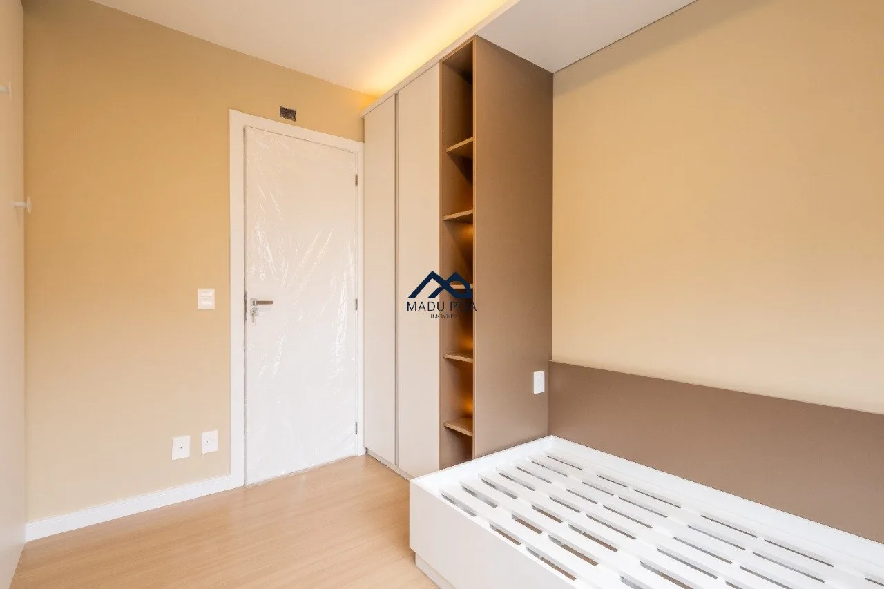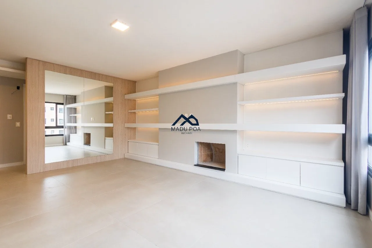 Living para dois ambientes com churrasqueira, cozinha americana, dois dormitórios sendo uma suíte.