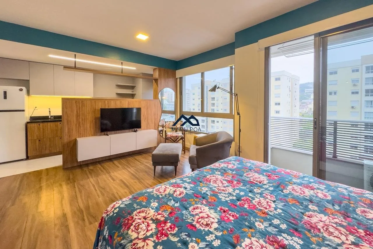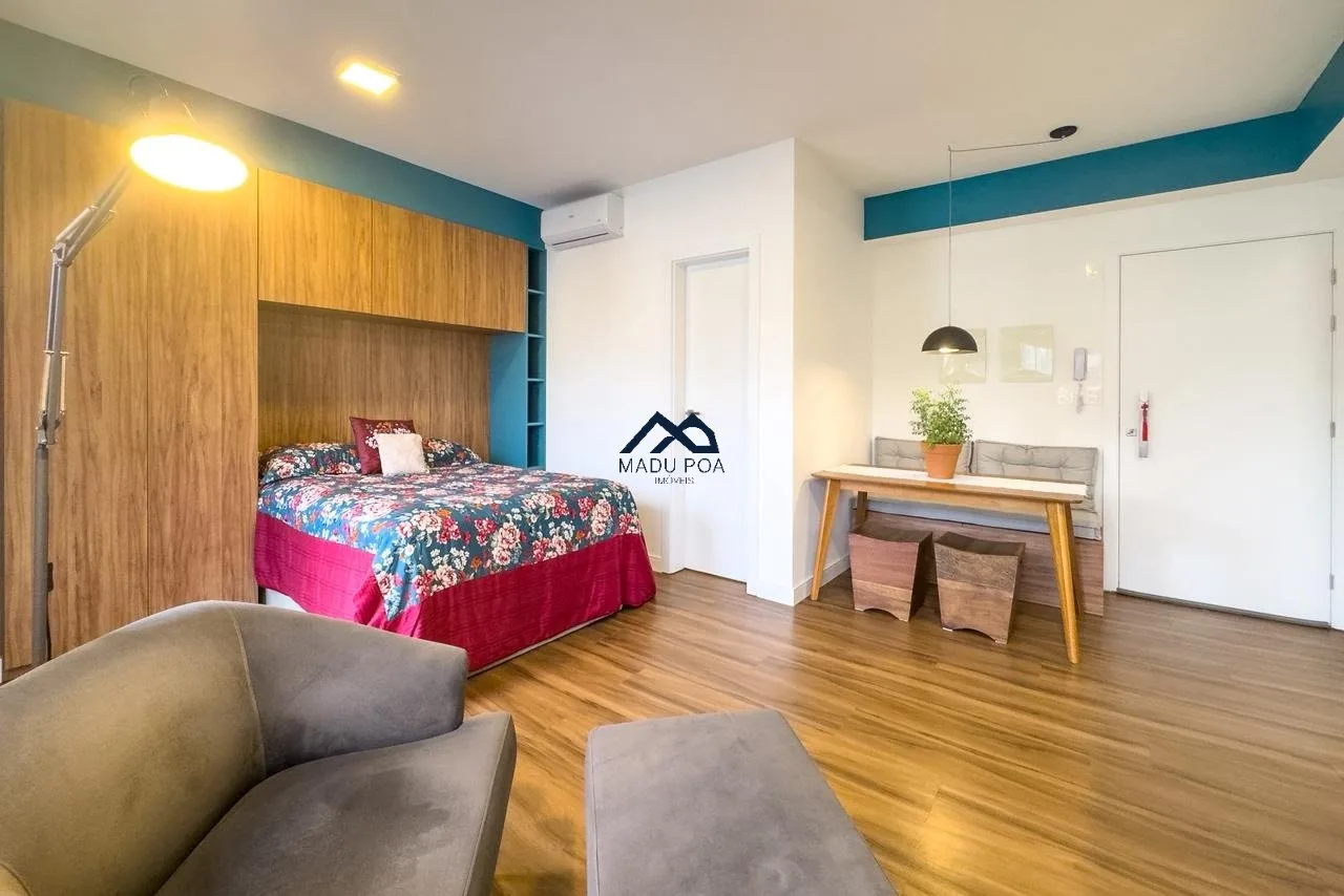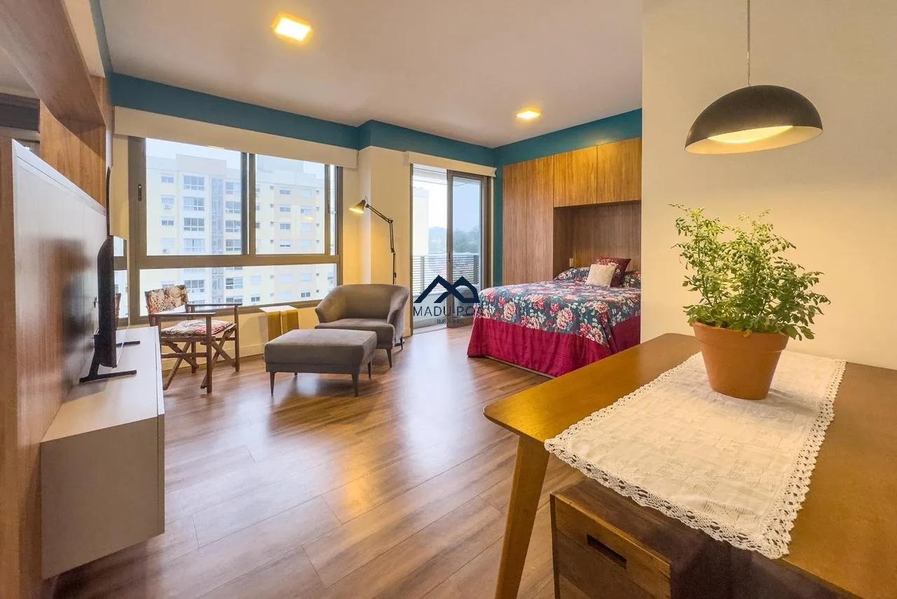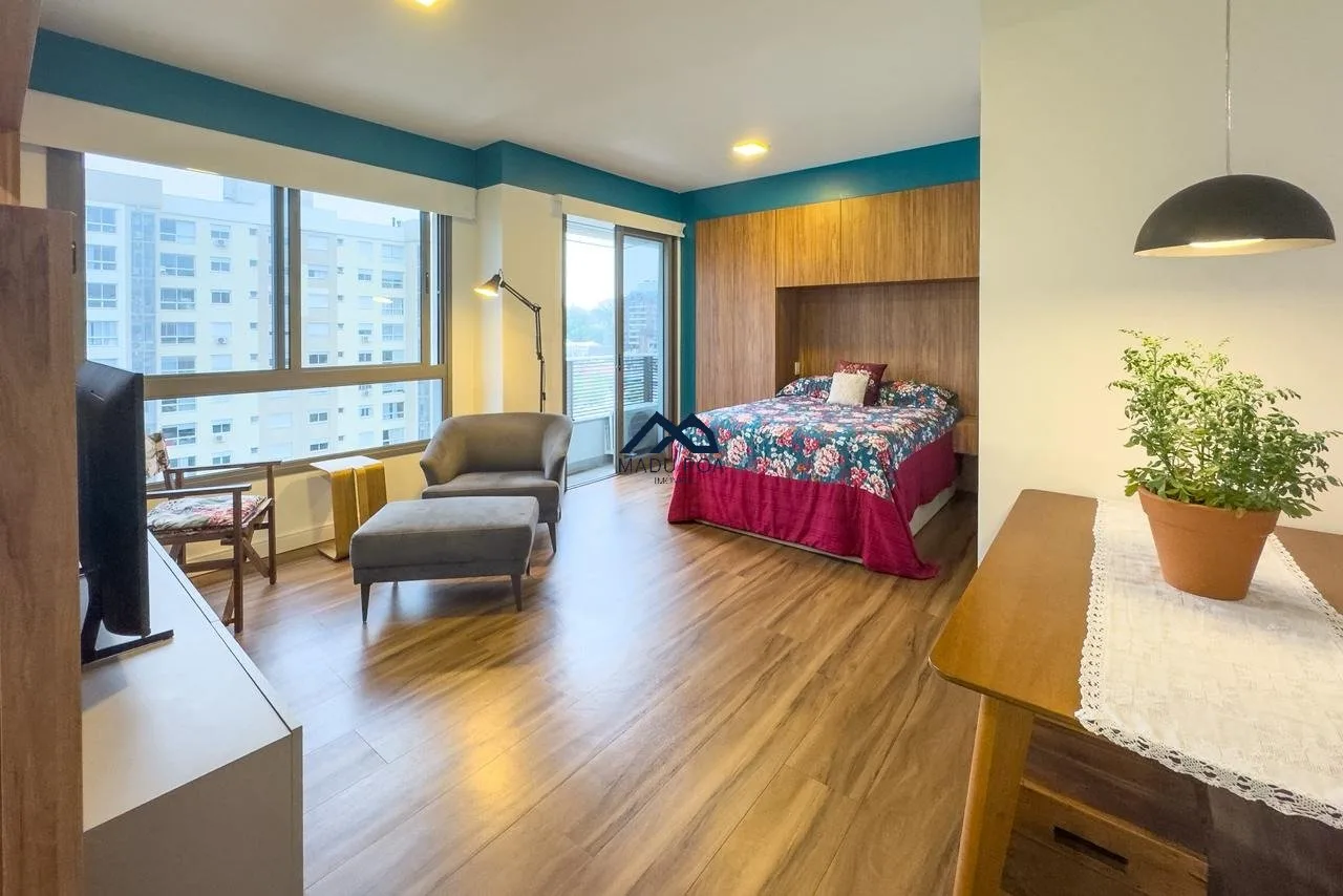 Apartamento à venda com 01 dormitório, tipo estúdio, 40,47m² de área privativa, living, churrasqueira, cozinha e uma vaga de garagem coberta e escriturada.