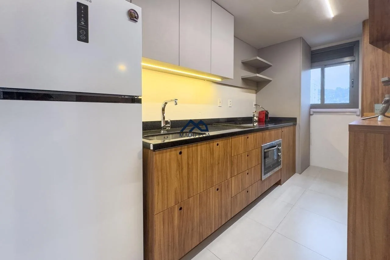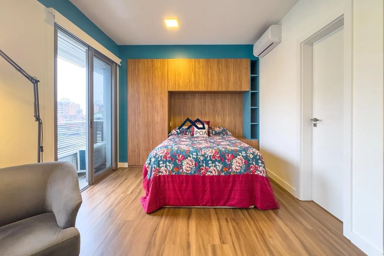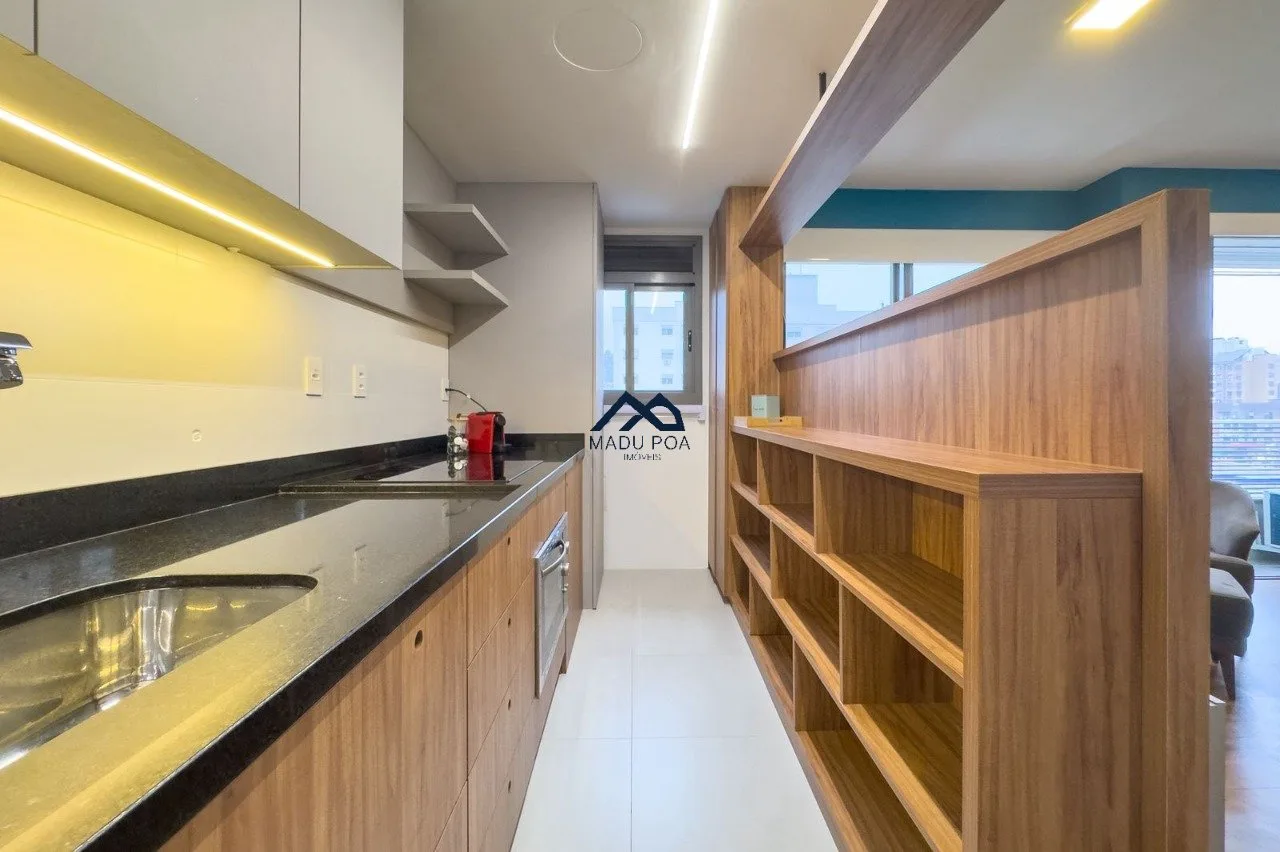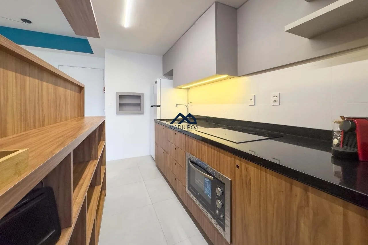 Apartamento à venda com 01 dormitório, tipo estúdio, 40,47m² de área privativa, living, churrasqueira, cozinha e uma vaga de garagem coberta e escriturada.