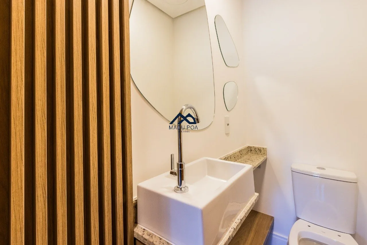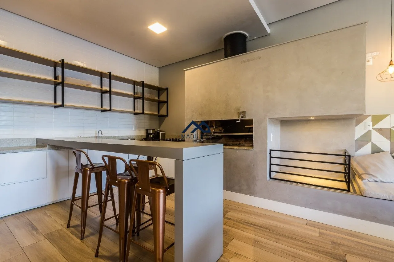 Living para dois ambientes, cozinha com churrasqueira, área de serviço. Duas suítes, sendo uma com closet. Duas vagas de garagem.