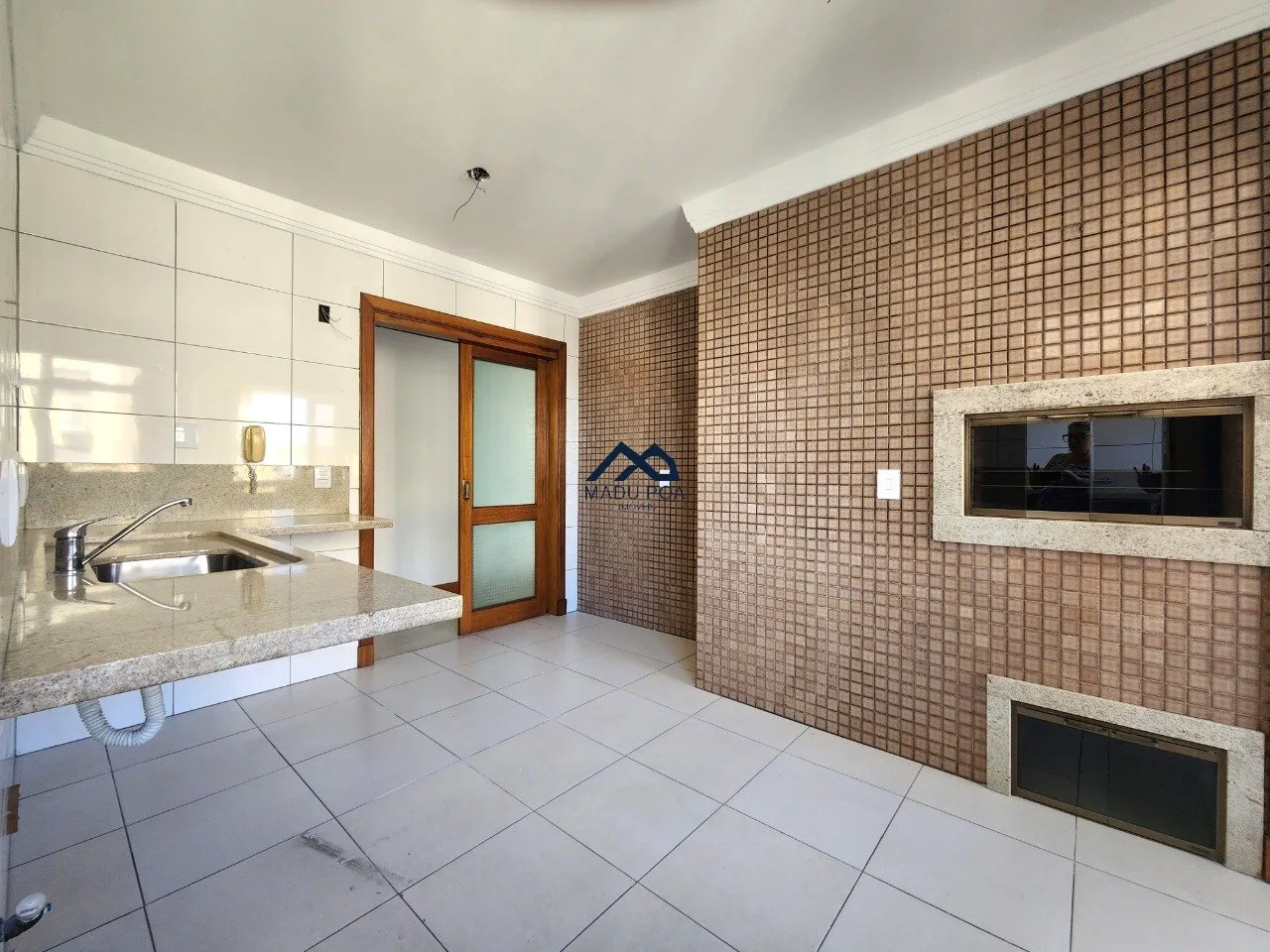 Living para dois ambientes, lavabo, cozinha, churrasqueira com bancada e área de serviço separada.