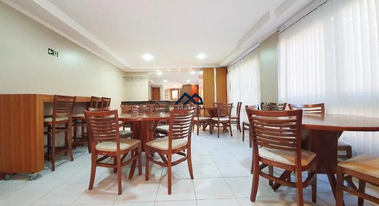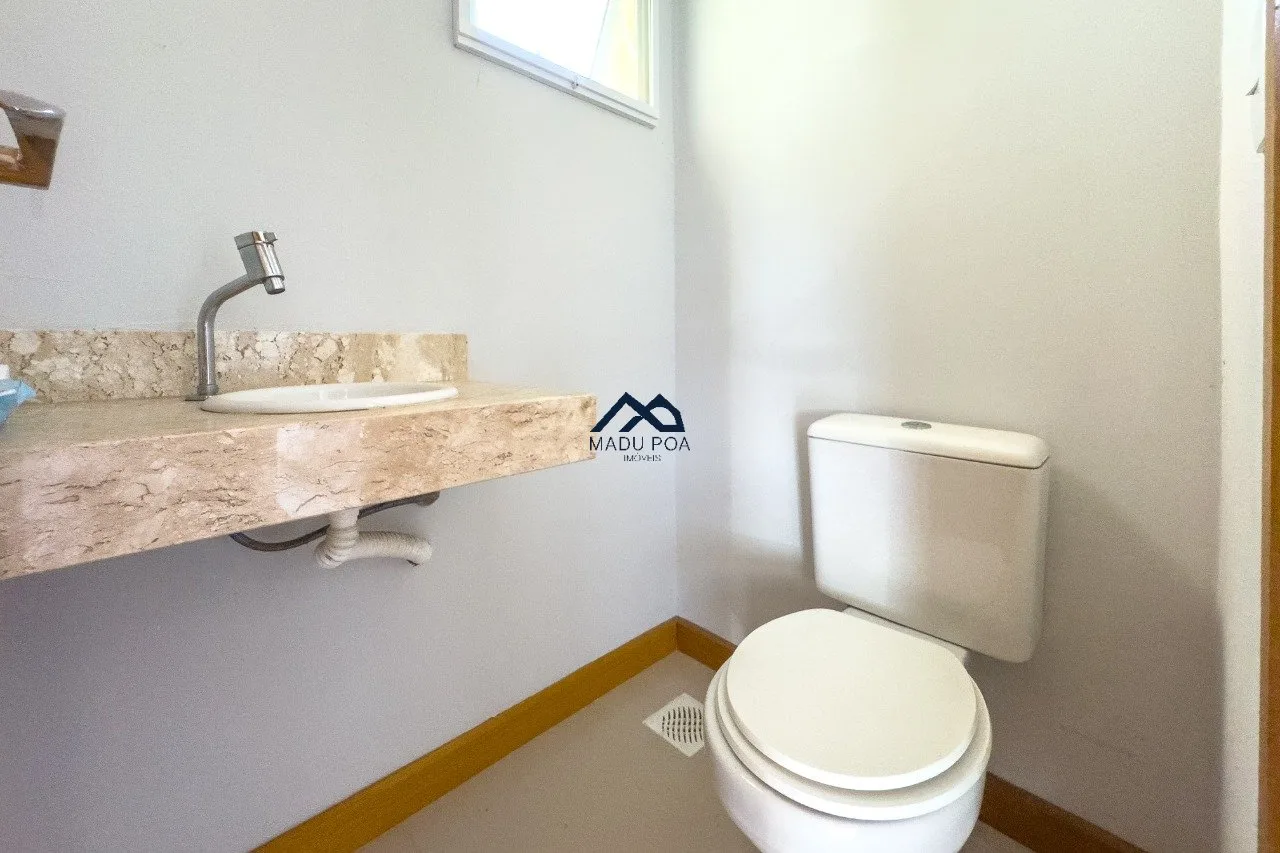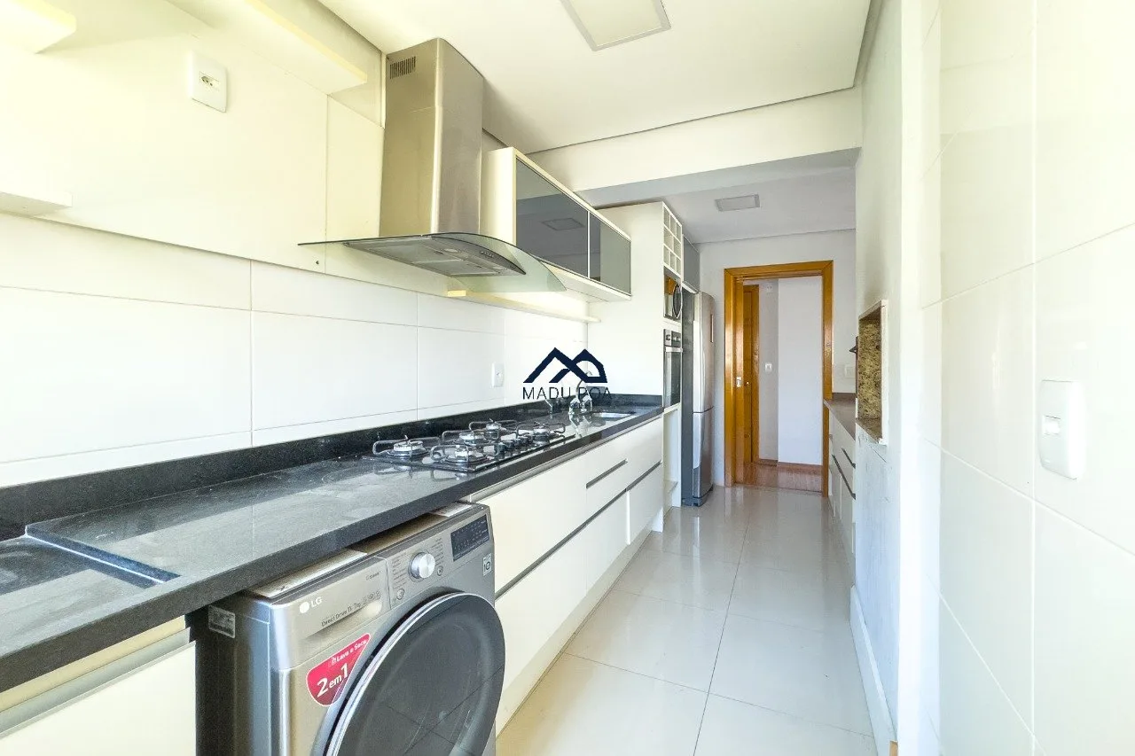 Living para dois ambientes com lareira ecológica, lavabo, cozinha planejada com churrasqueira e área de serviço.