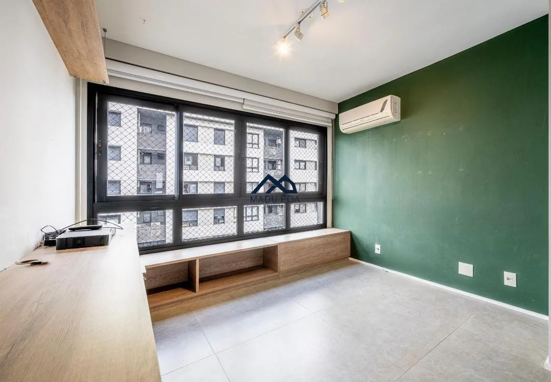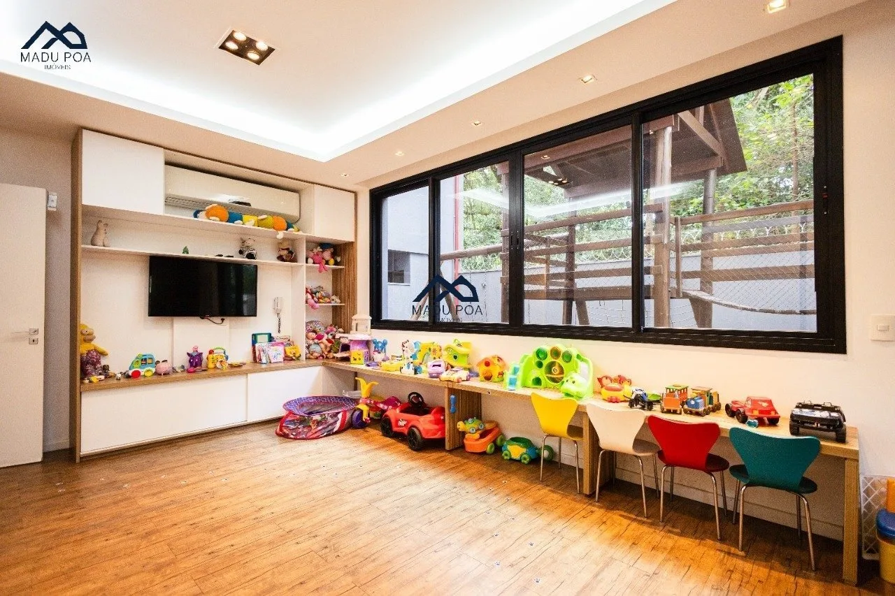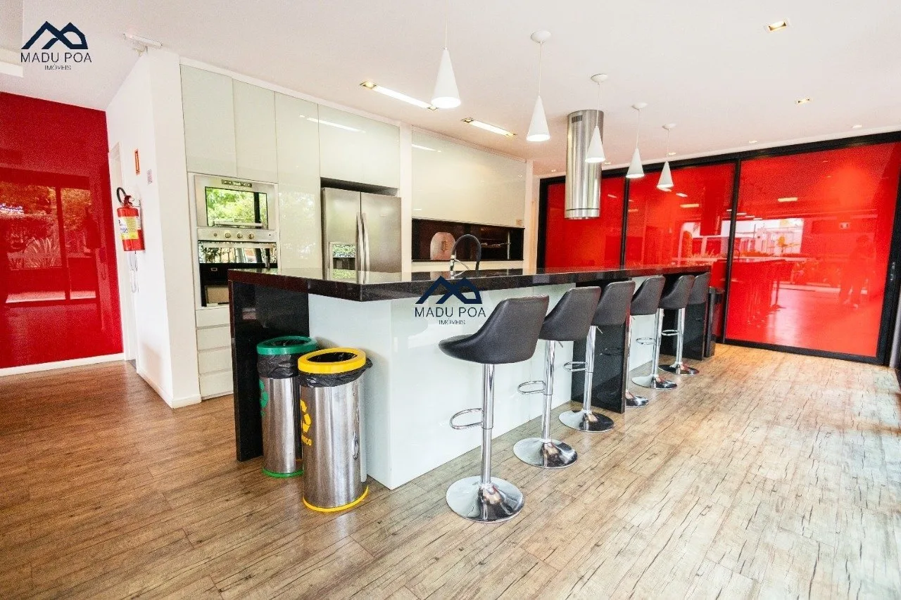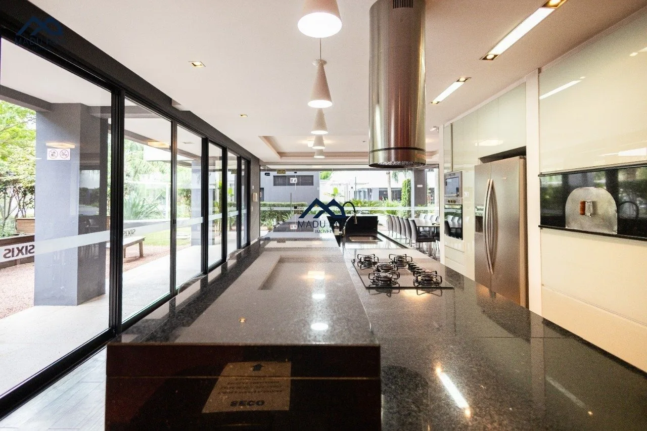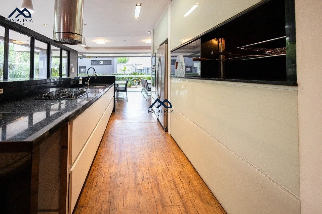 Living amplo para dois ambientes, cozinha americana com móveis sob medida e churrasqueira, área de serviço separada.