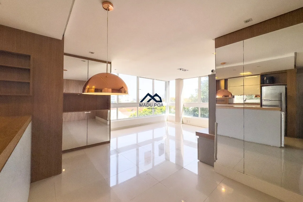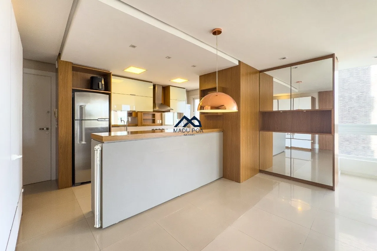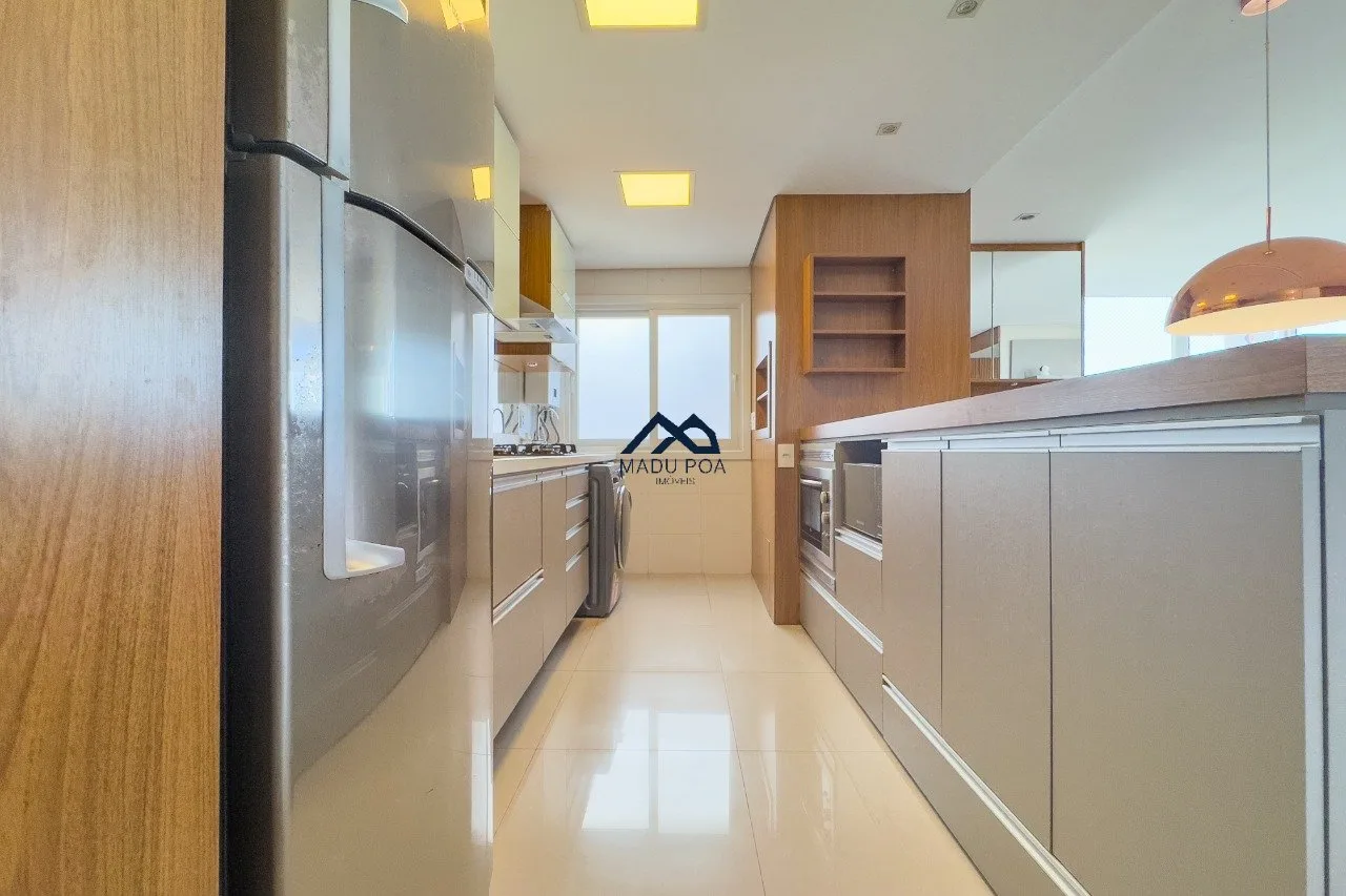 Living para dois ambientes com móveis sob medida, cozinha americana com moveis e alguns eletros. São três dormitórios sendo uma suíte.