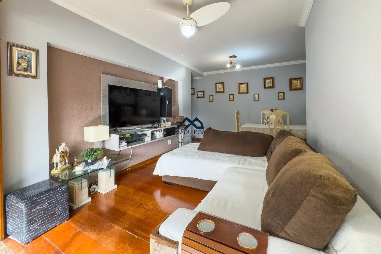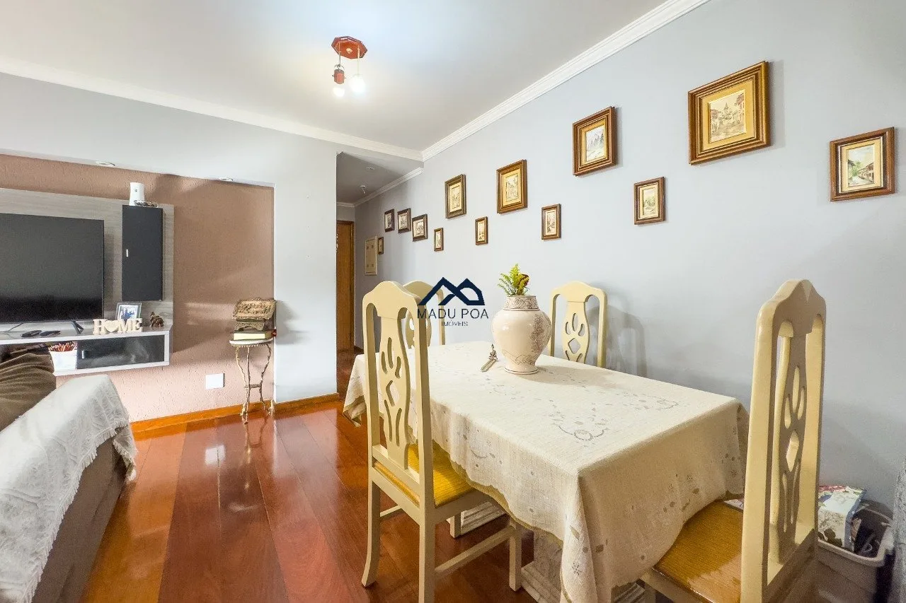 Living para dois ambientes com sacada, churrasqueira, copa cozinha com área de serviço integrados. Dois dormitórios, sendo uma suíte, duas vagas de garagem cobrtas.