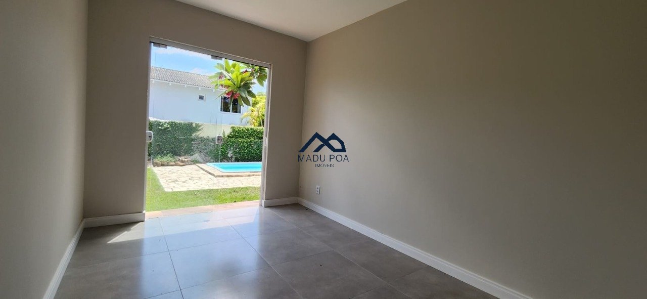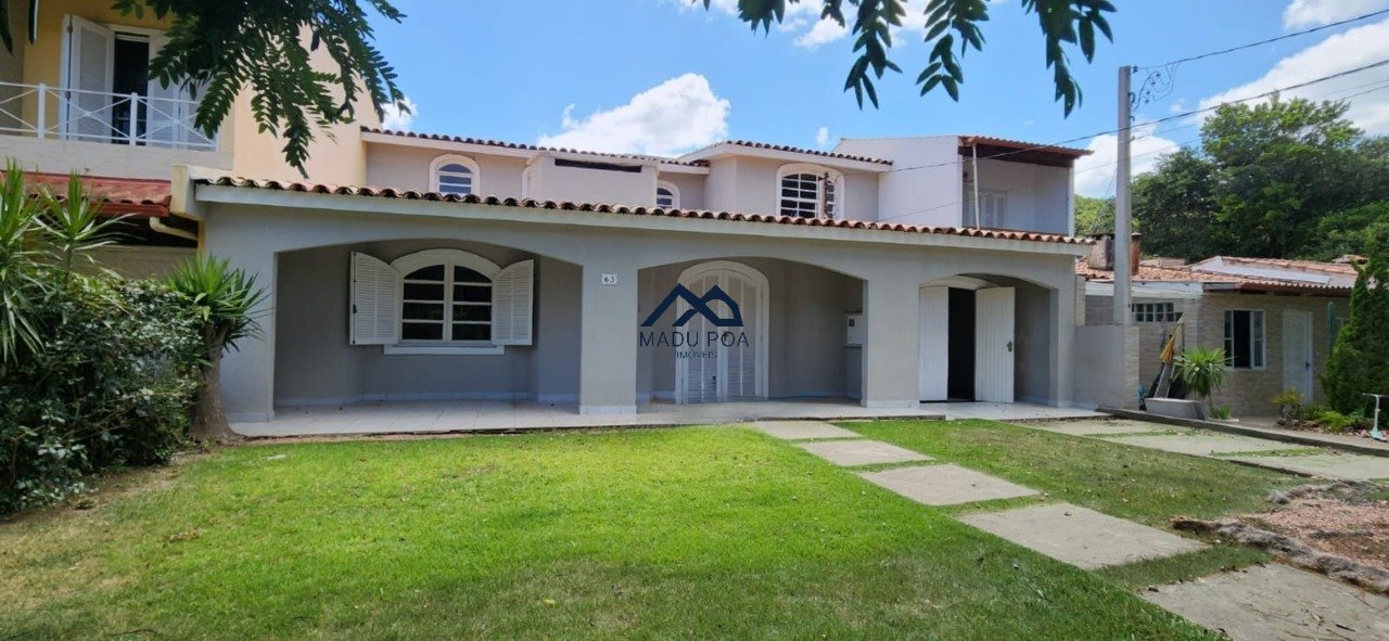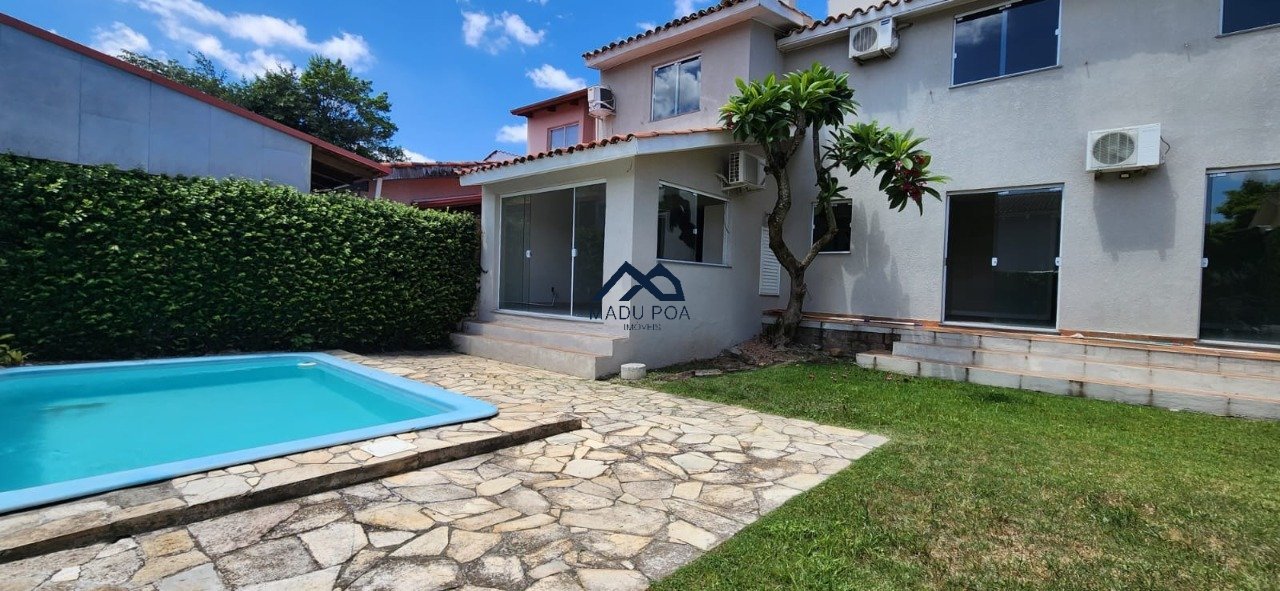 Casa à venda em condomínio arborizado em Ipanema, living com lareira, cozinha com armários, lavabo e lavanderia. Quatro dormitórios, sendo dois no primeiro pavimento, um terceiro dormitório e uma suíte com closet no segundo andar. Pátio com piscina e churrasqueira, seis banheiros e garagem coberta para quatro carros.