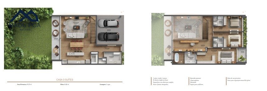 Casas de alto padrão em condomínio fechado, com pátio privativo, 03 à 04 suítes, com metragens que variam de 219 à 261m² de área privativa, em terreno de 7.000m², sendo 3.000m² de área verde.