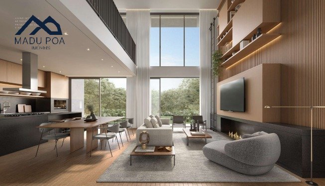 Arquitetura contemporânea, moderna, com linhas atuais e elegantes, conceito aberto ampliando a sensação do espaço dos ambientes, aberturas amplas, living de 42m² com pé direito duplo, estar e jantar integrados, bancada gourmet, varanda, espera para calefator e 02 vagas de garagem cobertas.