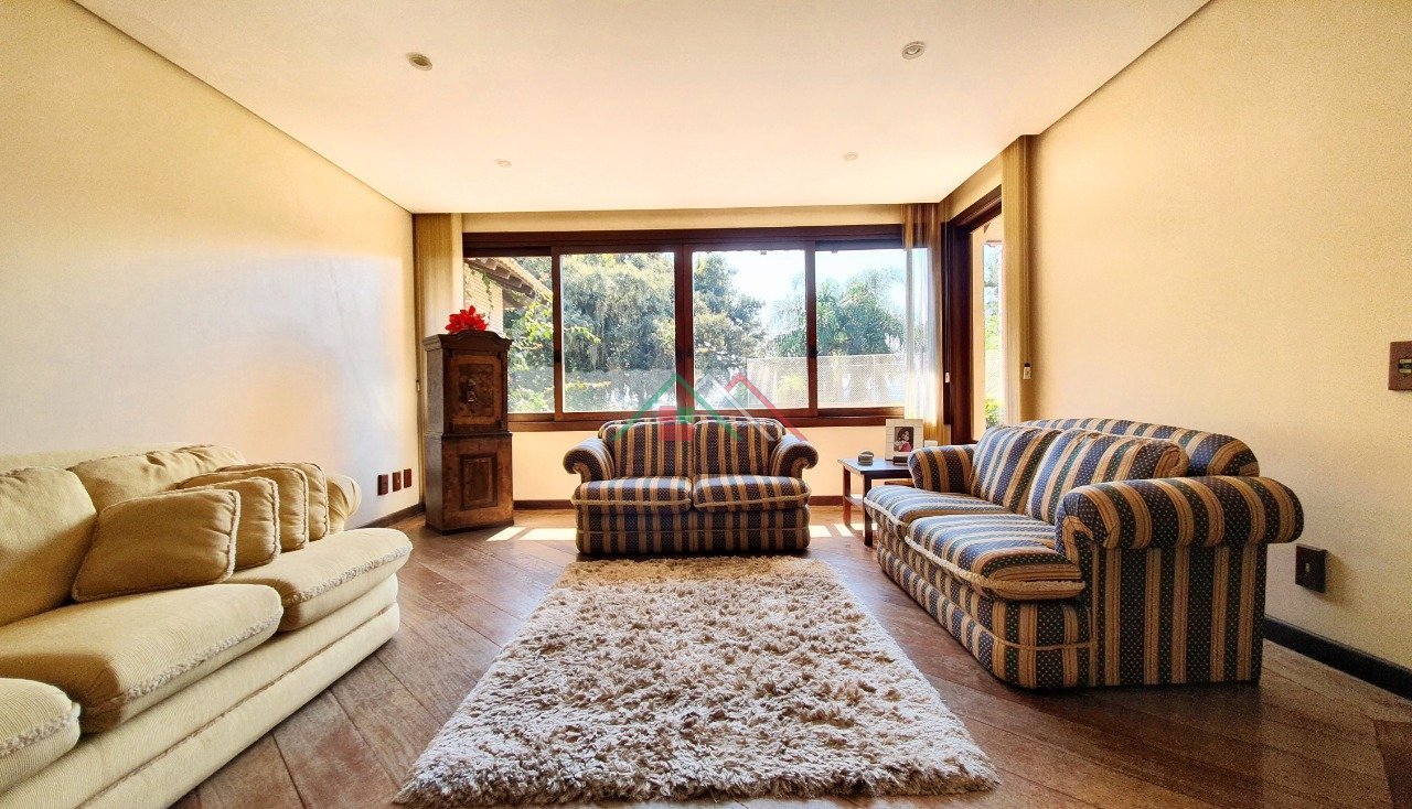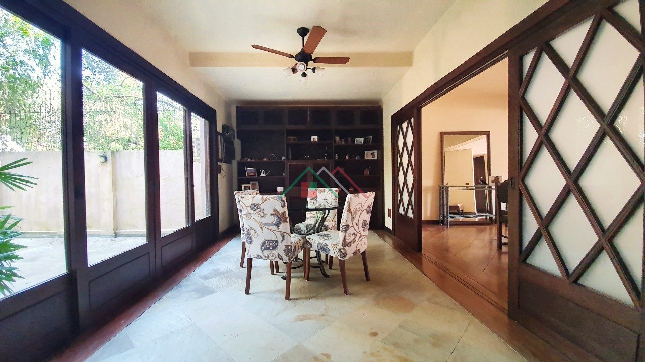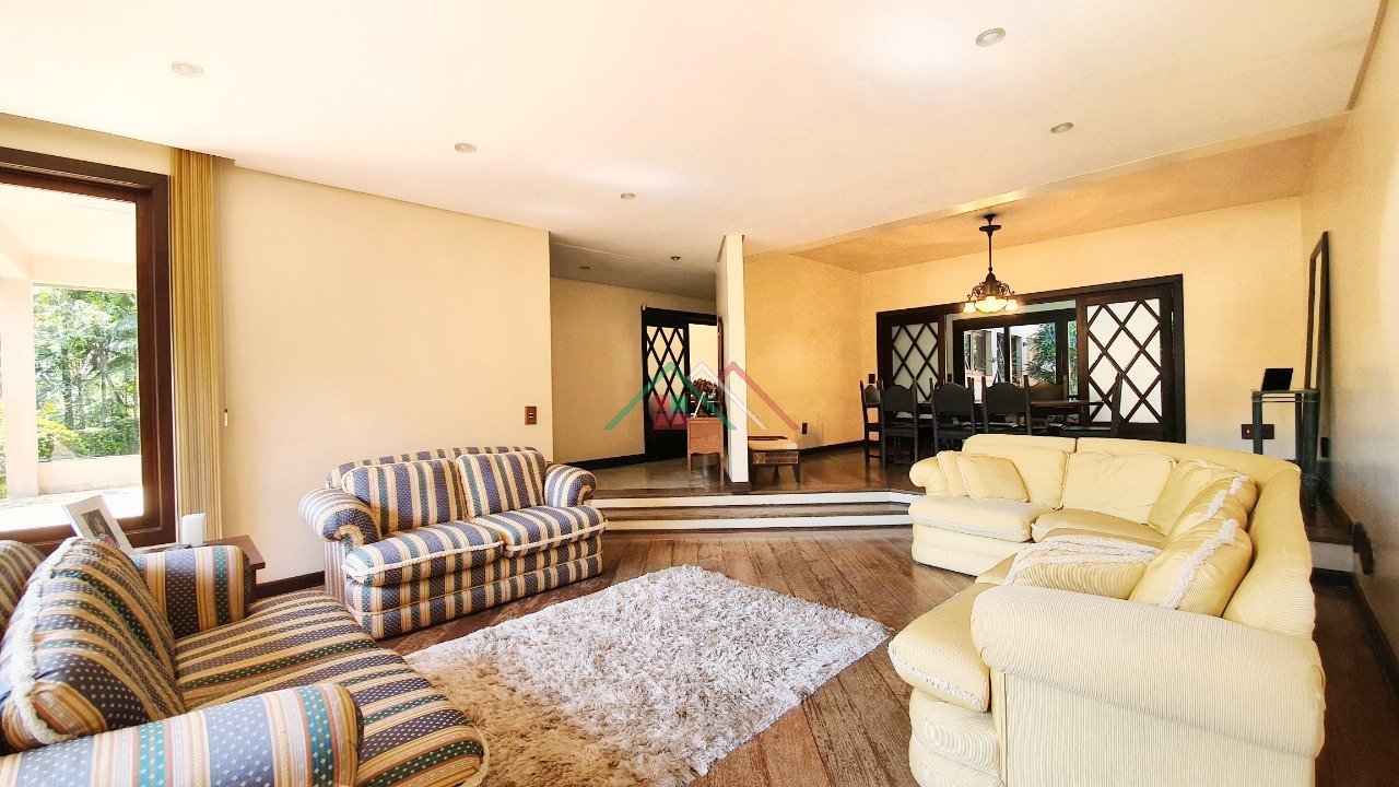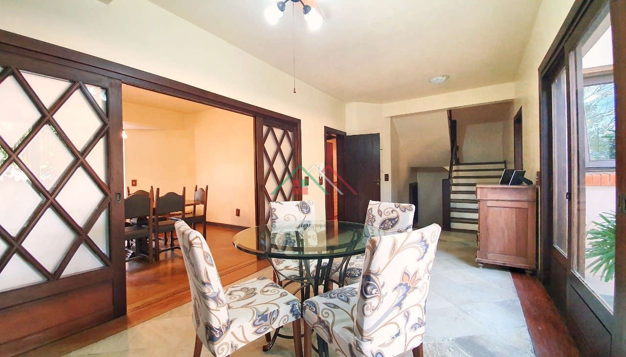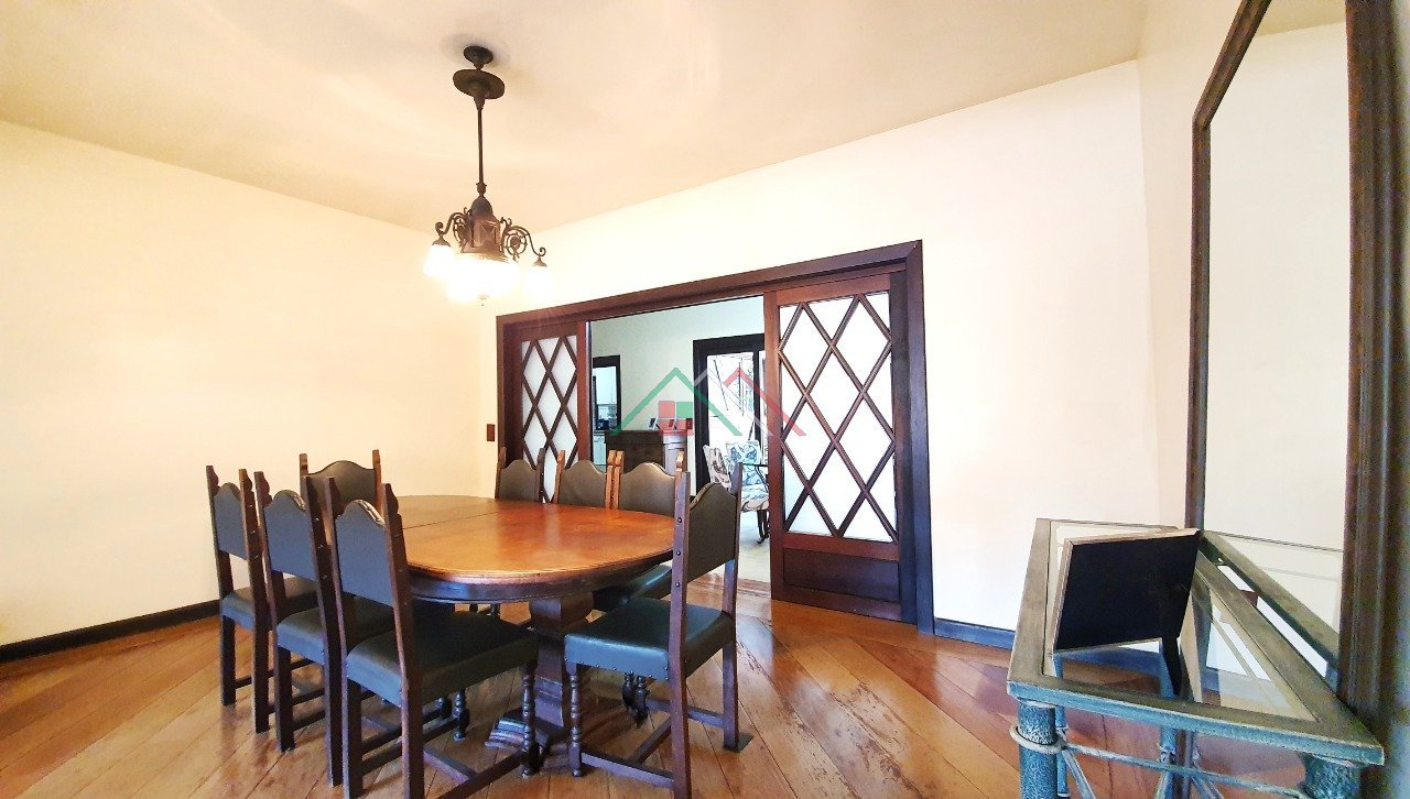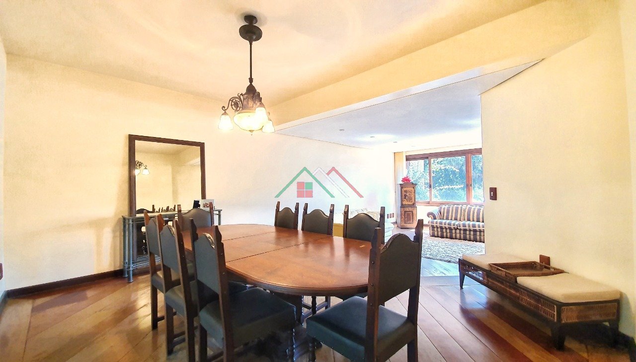 Primeiro piso: Sala de estar com lareira e 1 sala ampla com 3 ambientes, lavabo, copa/cozinha, área de serviço, dependência completa de empregada e pátio. No subsolo ampla garagem para 6 carros cobertos, espaço gourmet com churrasqueira, banheiro auxiliar, depósito.