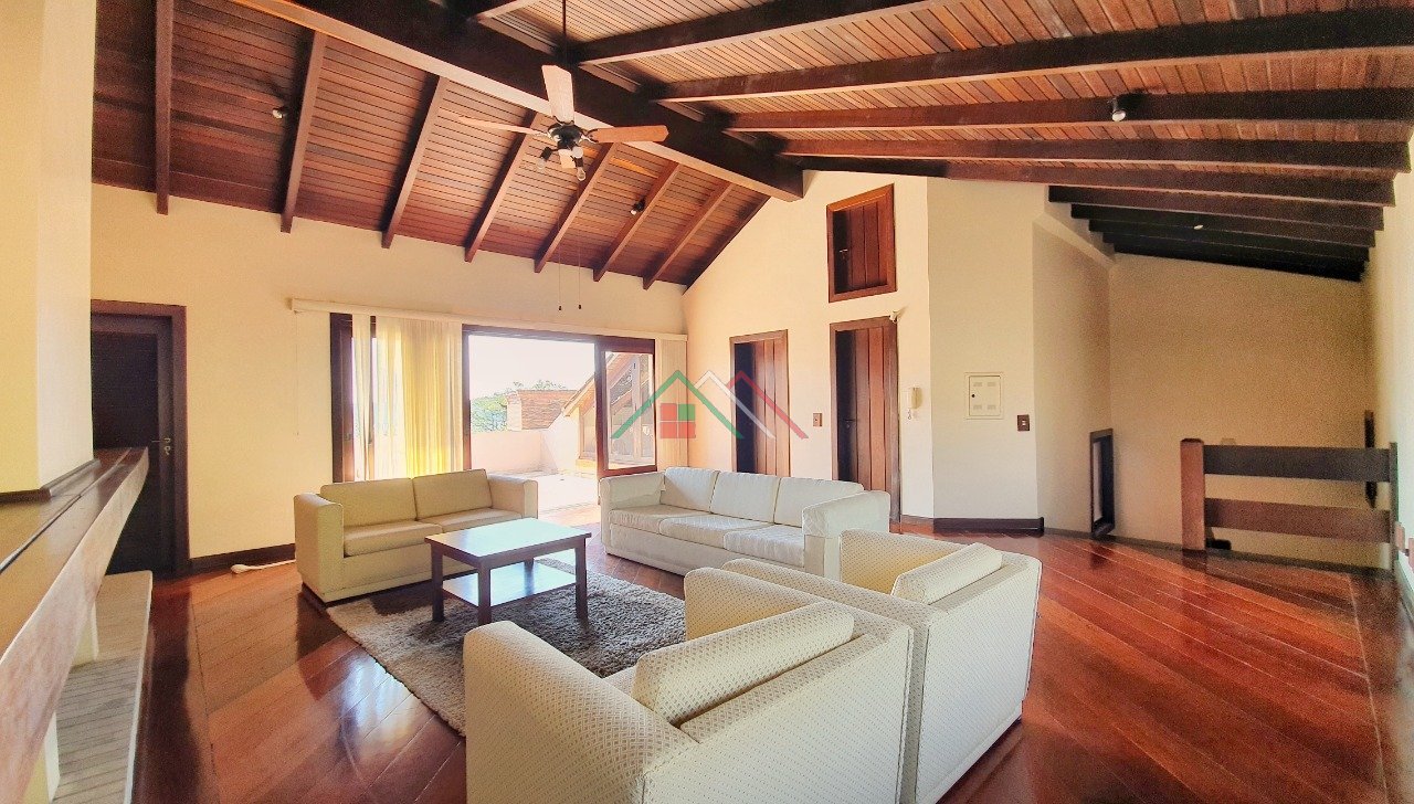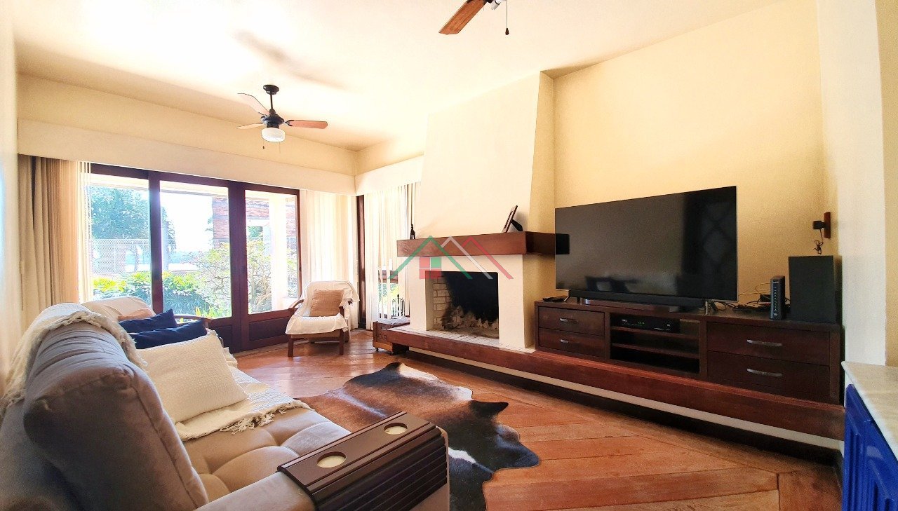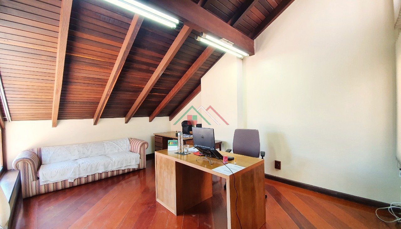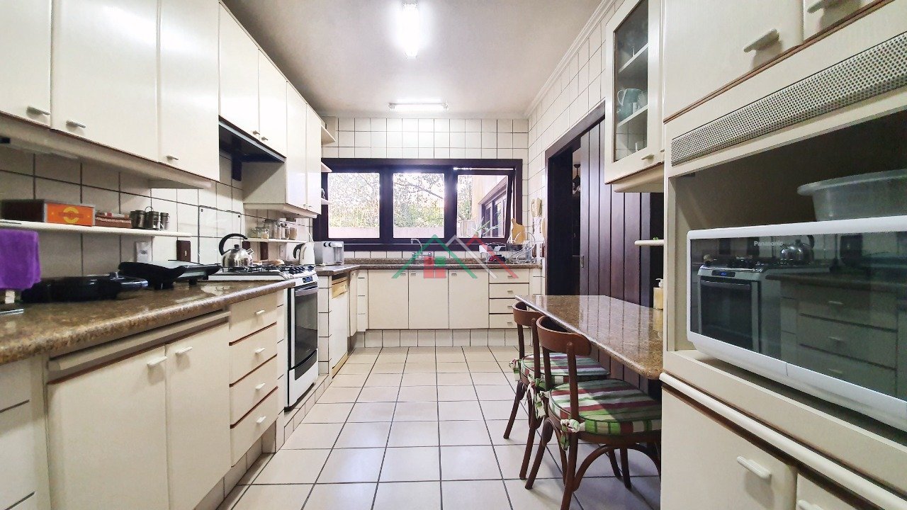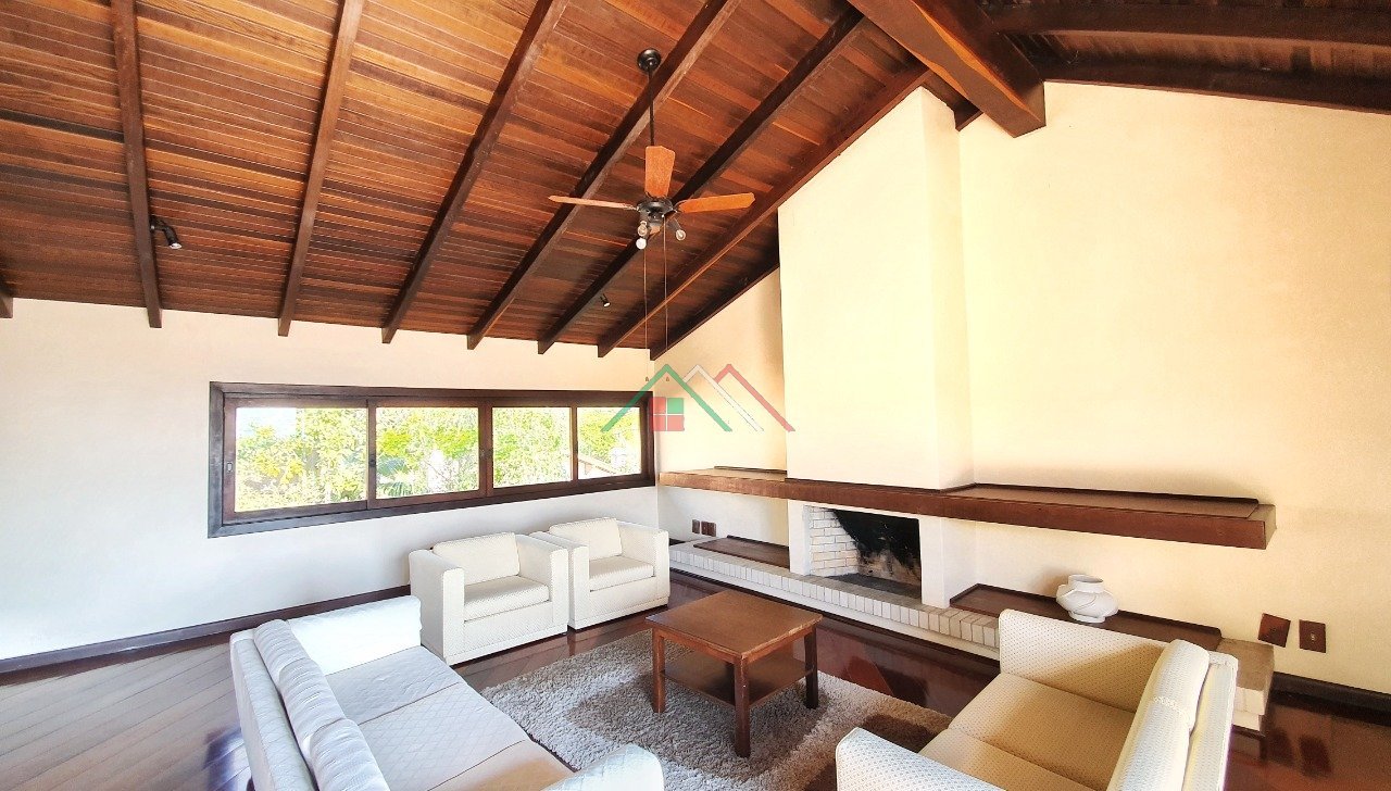 Primeiro piso: Sala de estar com lareira e 1 sala ampla com 3 ambientes, lavabo, copa/cozinha, área de serviço, dependência completa de empregada e pátio. No subsolo ampla garagem para 6 carros cobertos, espaço gourmet com churrasqueira, banheiro auxiliar, depósito.