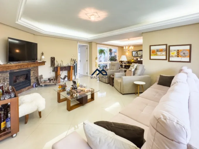 Living para três ambientes com lareira, sacada com vista para o guaíba, cozinha integrada, pátio com churrasqueira, lavabo. Garagem coberta para quatro carros, depósito e espaço para dispensa ou gabinete.