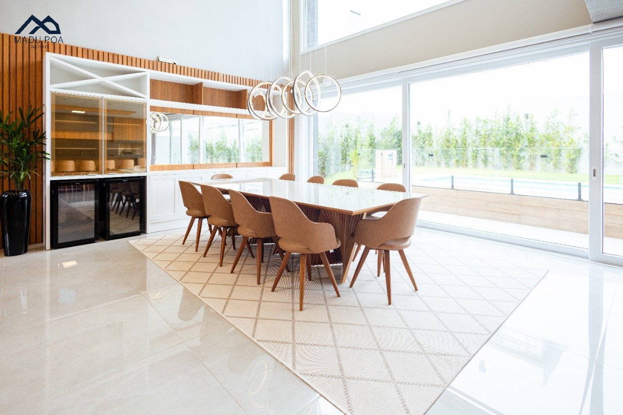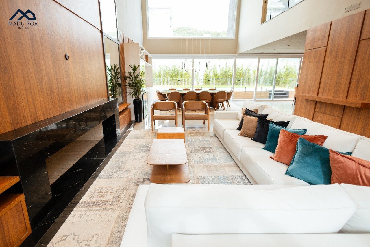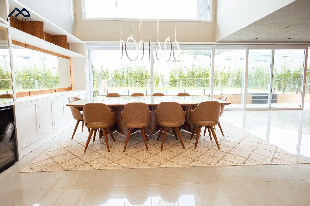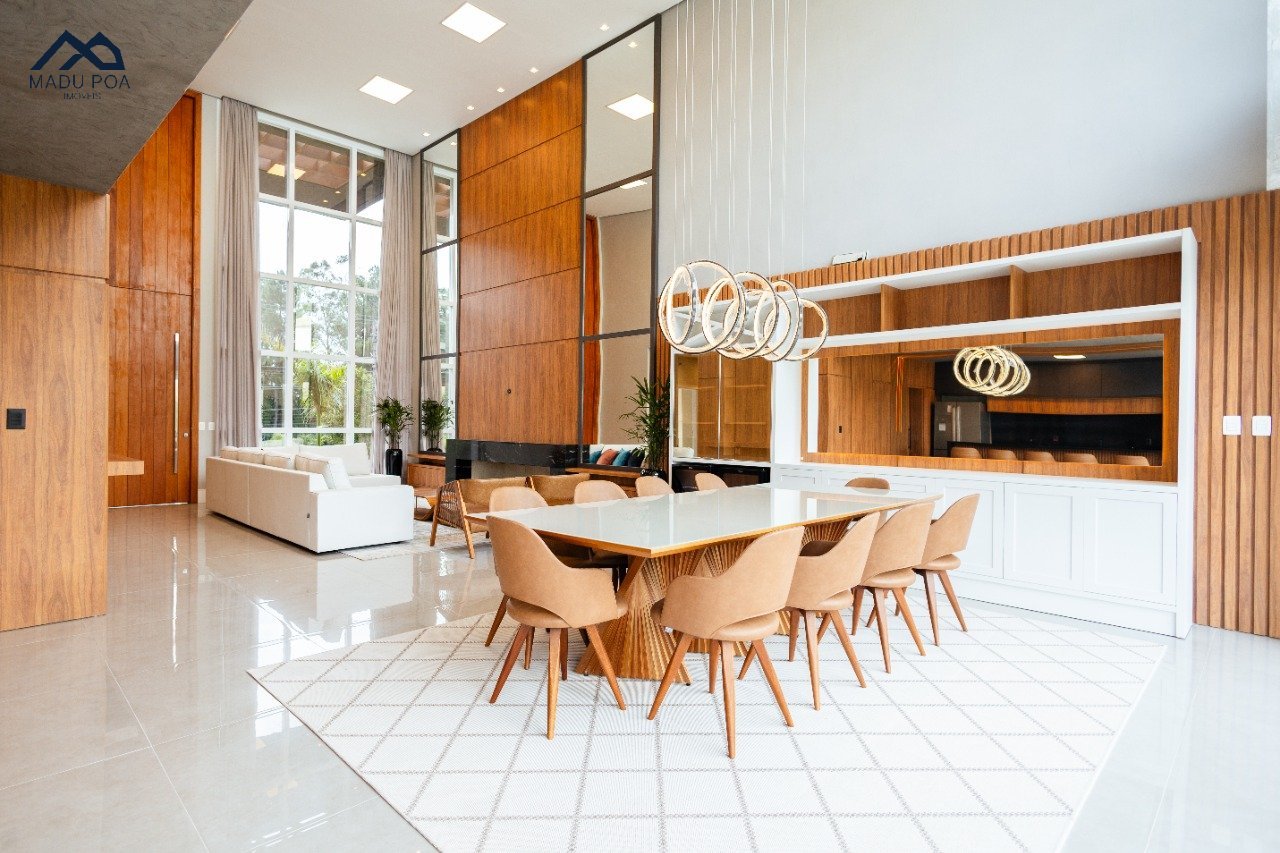 1º Pavimento: Living para dois ambientes com lareira, com pé direito duplo, suíte, lavabo, sala de jantar com porta balcão ampla com abertura total para o pátio com piscina, cozinha gourmet com churrasqueira e paella, ilha com cooktop, área de serviço e despensa.