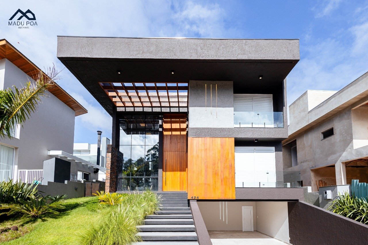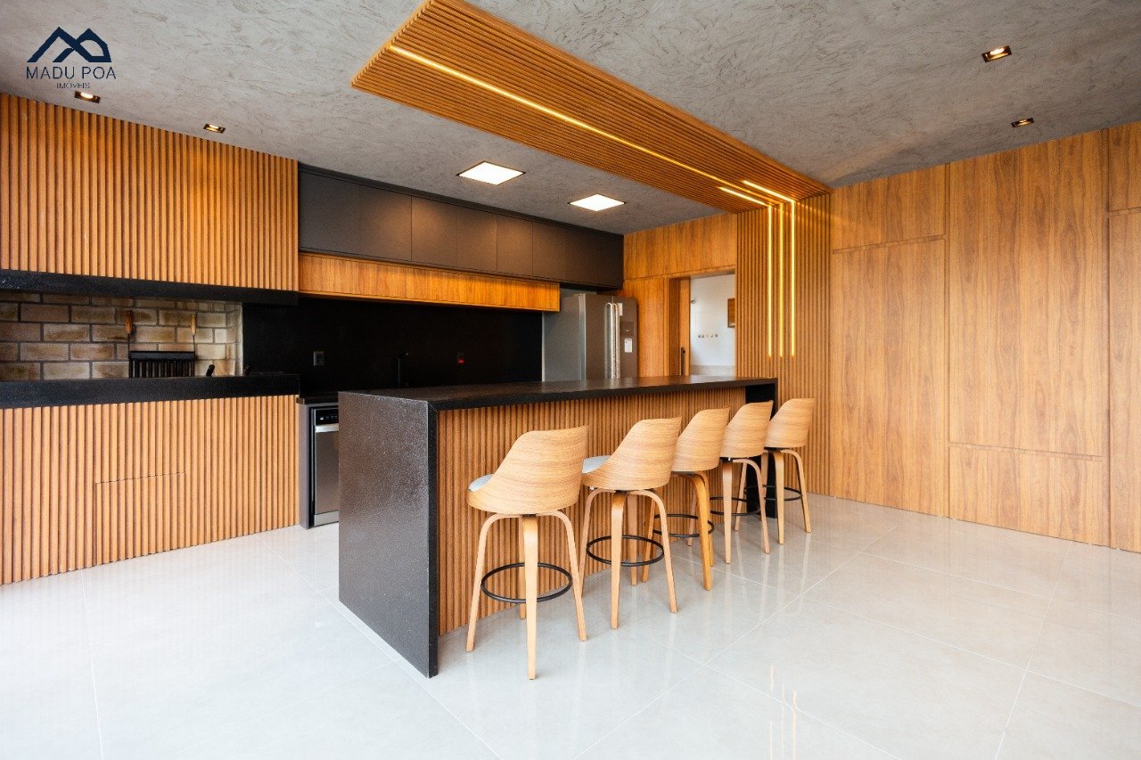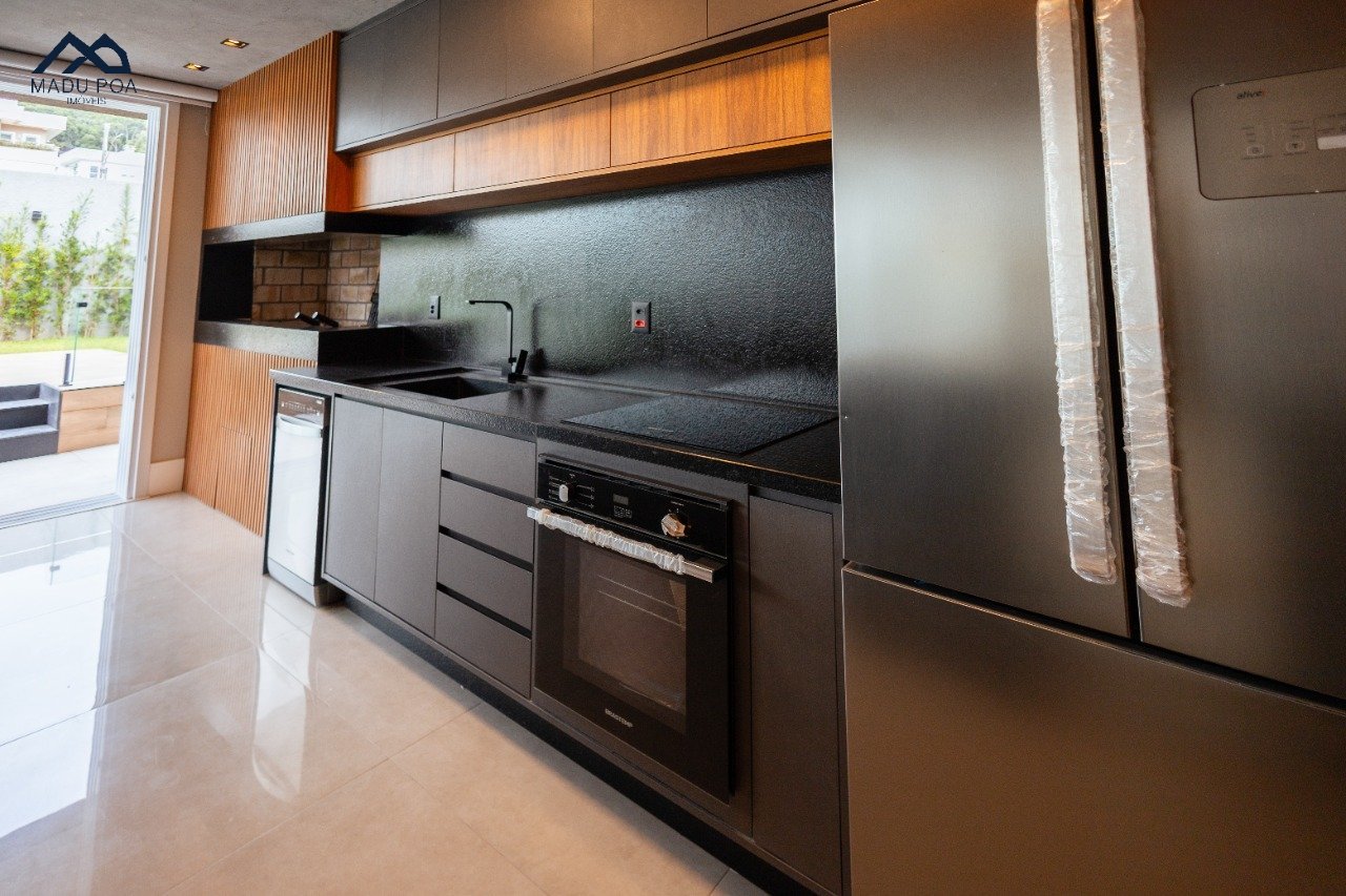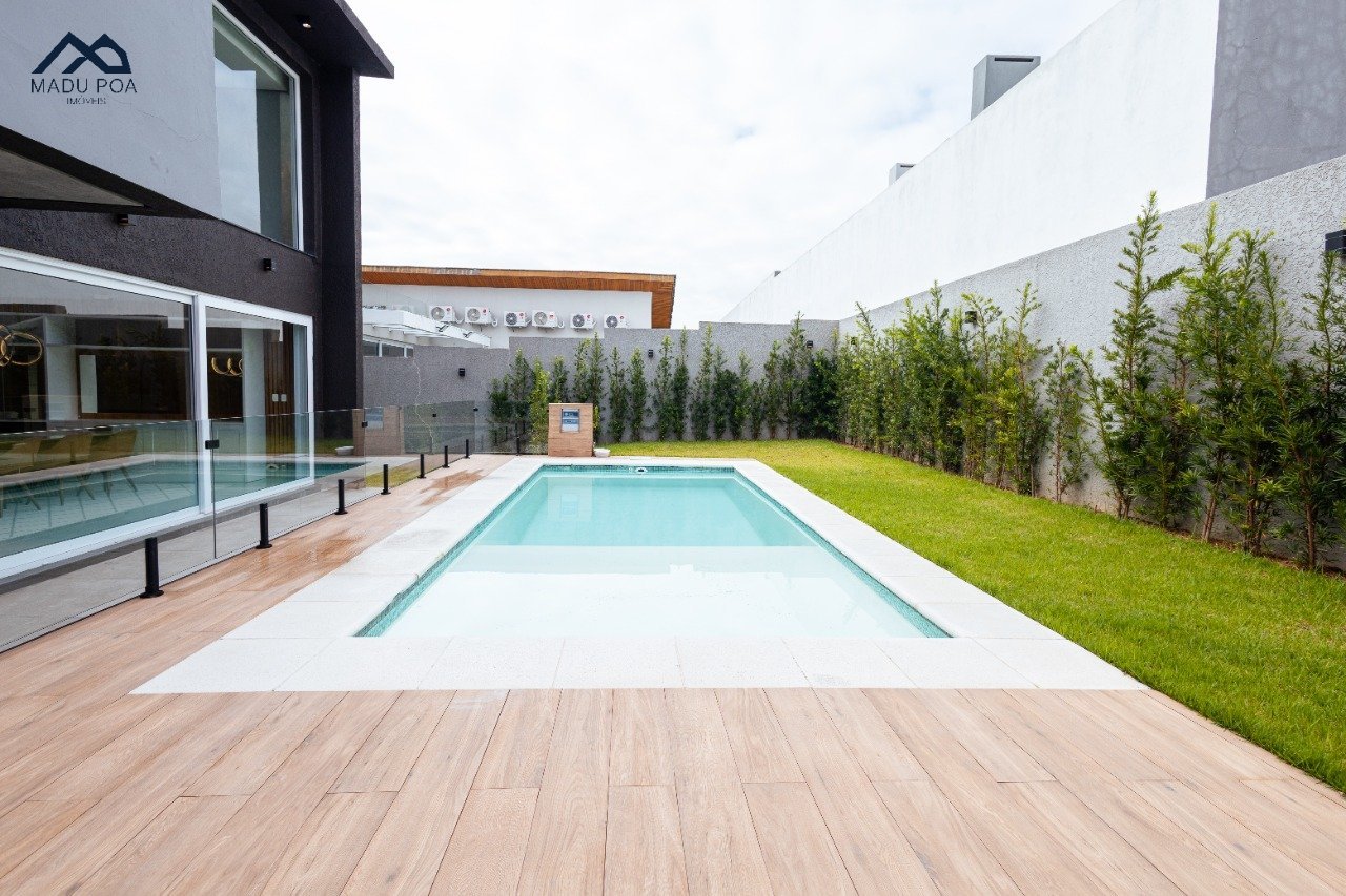 1º Pavimento: Living para dois ambientes com lareira, com pé direito duplo, suíte, lavabo, sala de jantar com porta balcão ampla com abertura total para o pátio com piscina, cozinha gourmet com churrasqueira e paella, ilha com cooktop, área de serviço e despensa.