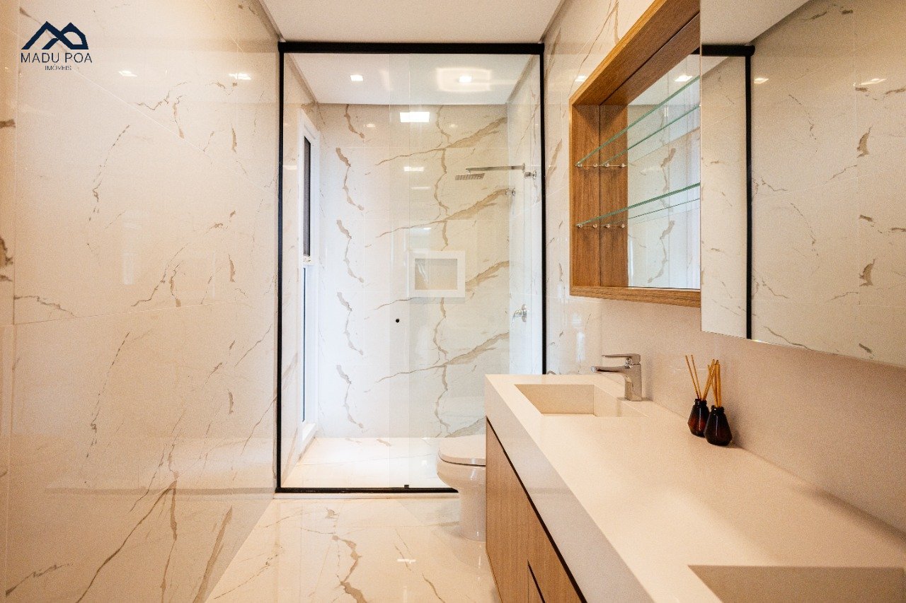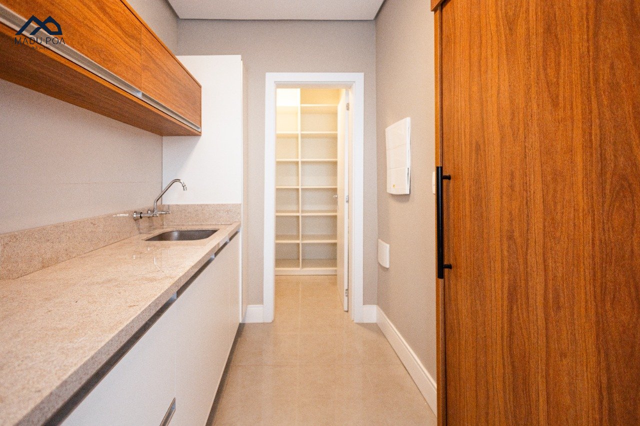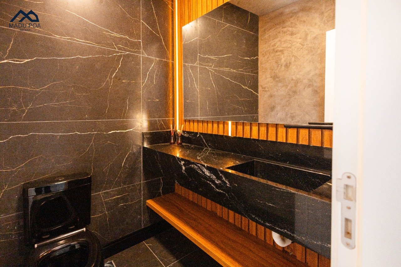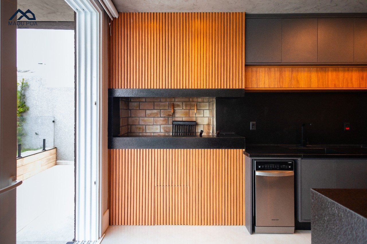 1º Pavimento: Living para dois ambientes com lareira, com pé direito duplo, suíte, lavabo, sala de jantar com porta balcão ampla com abertura total para o pátio com piscina, cozinha gourmet com churrasqueira e paella, ilha com cooktop, área de serviço e despensa.