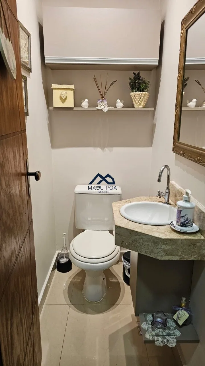 II – Móveis planejados do lavabo: armário aéreo sobre bacia sanitária e acabamento suspenso abaixo da cuba da pia;