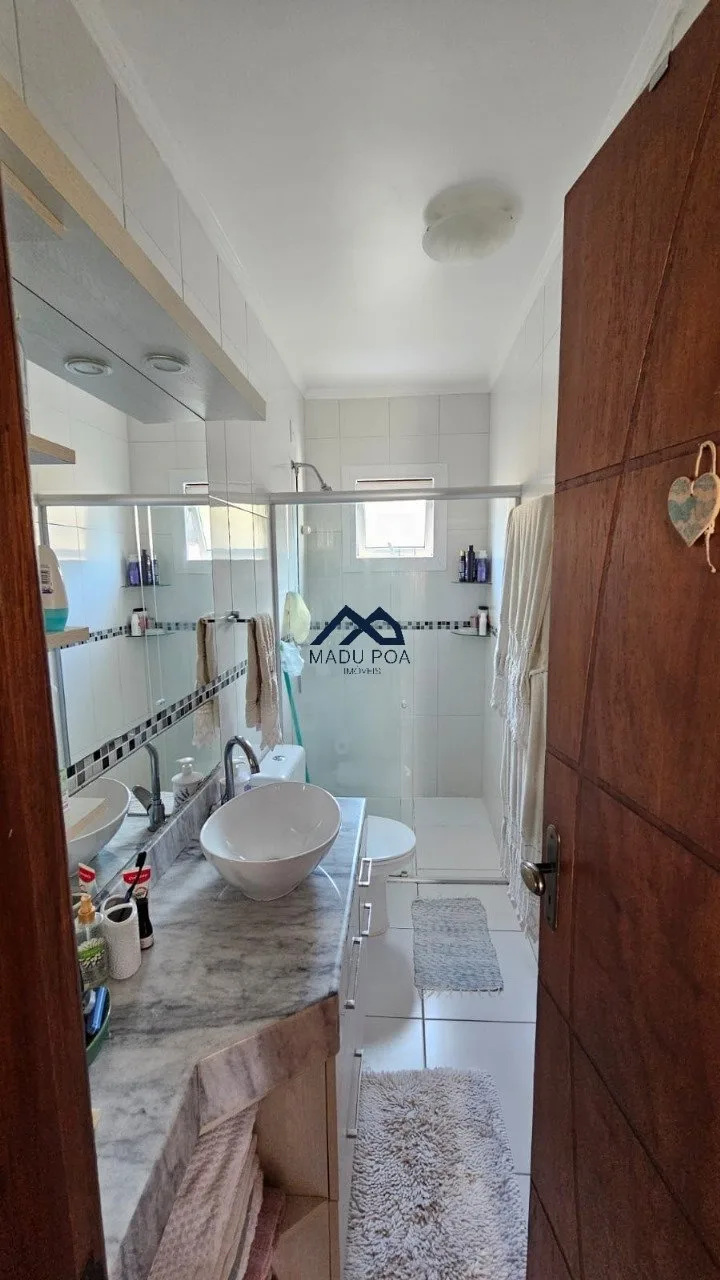 VII – Móvel planejado do banheiro: armário e prateleiras abaixo e acima da pia;