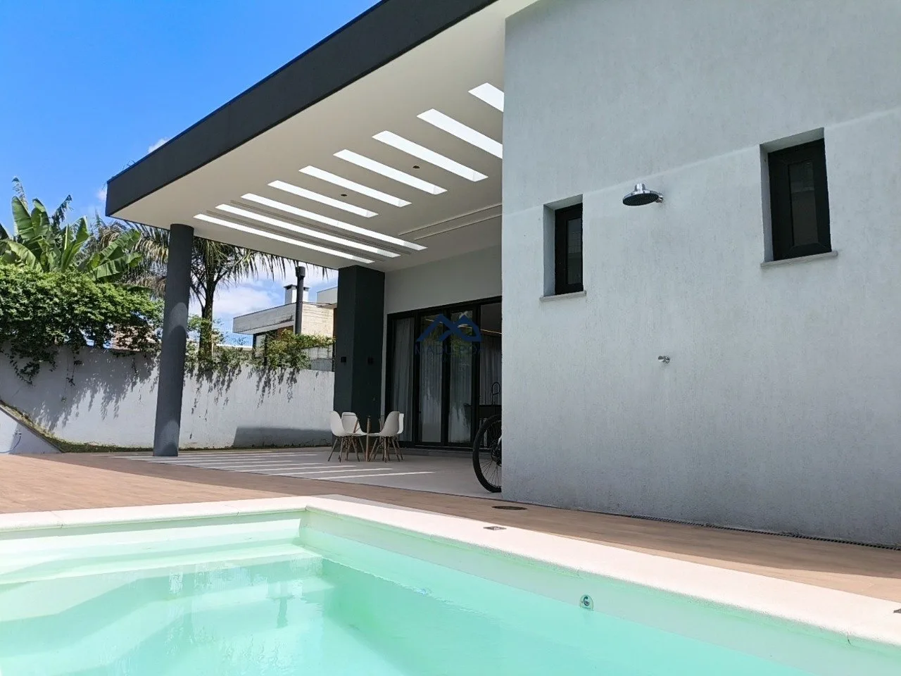 Amplo pátio com piscina, duas entradas de serviço, banheiro auxiliar.