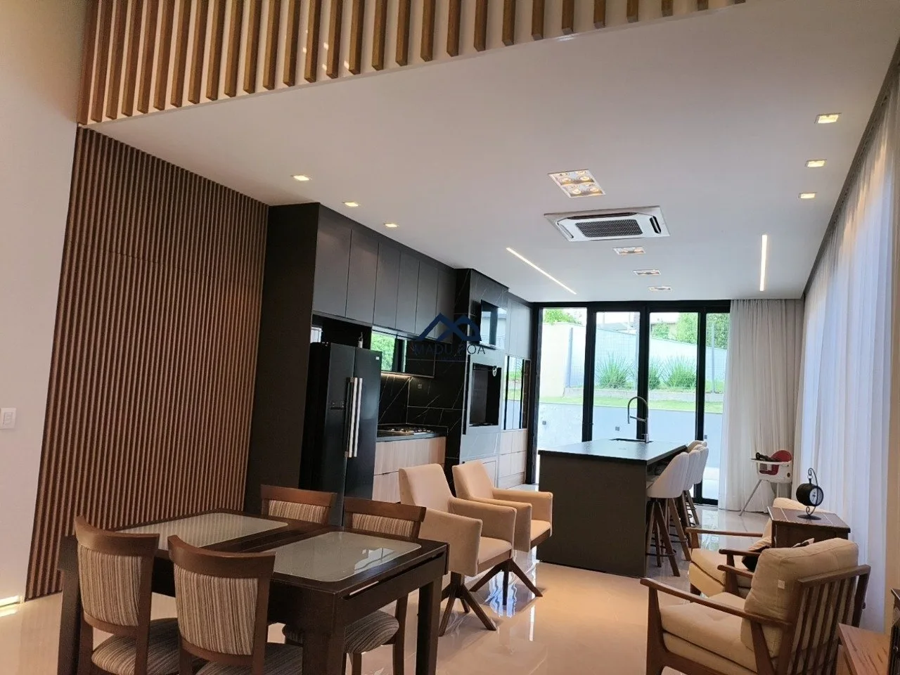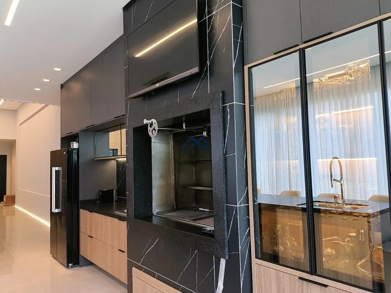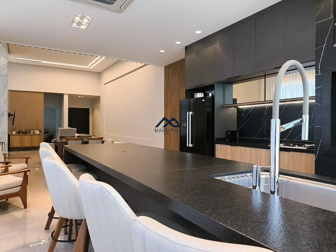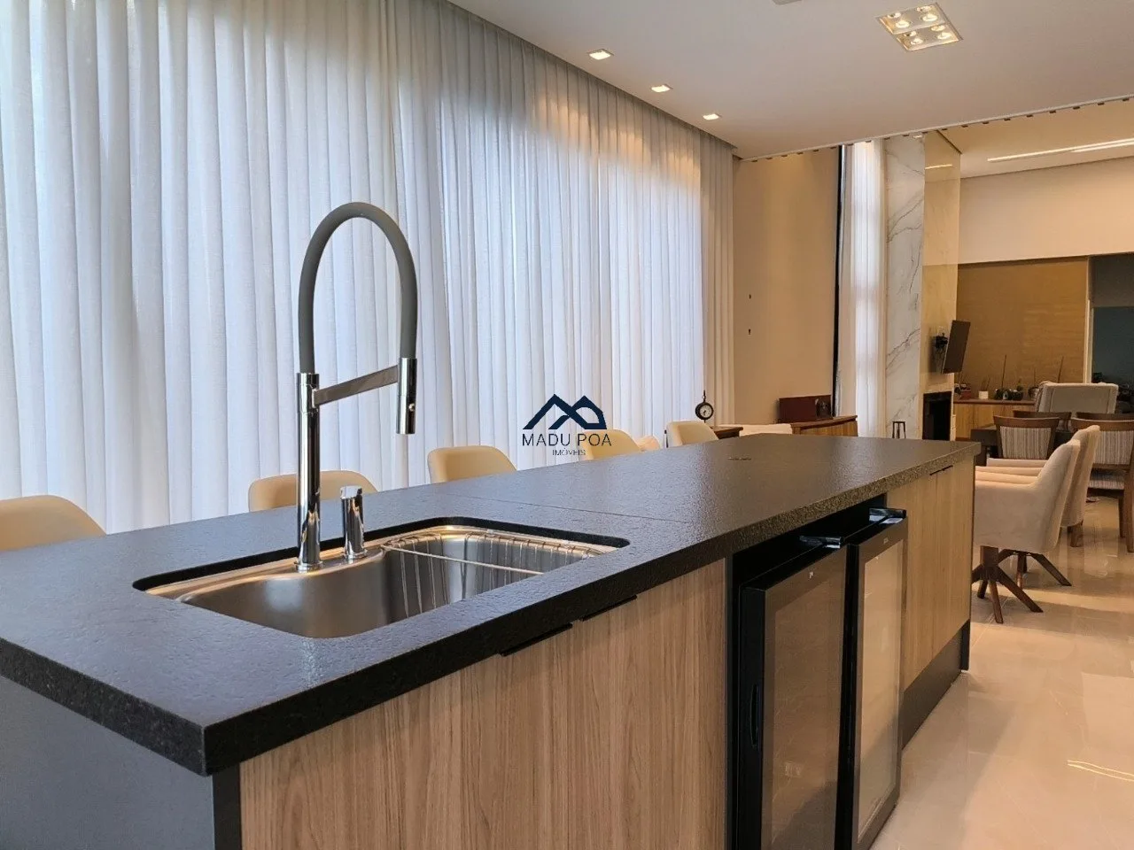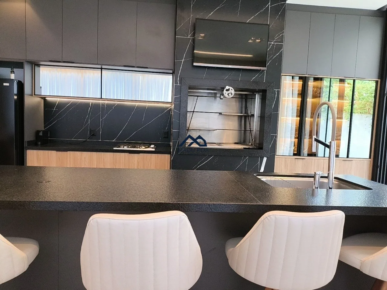 banquetas da bancada, geladeira, cervejeira e adega, cooktop e exaustor.