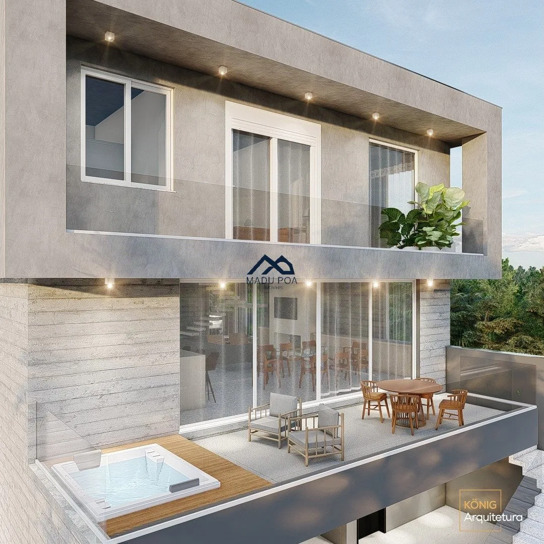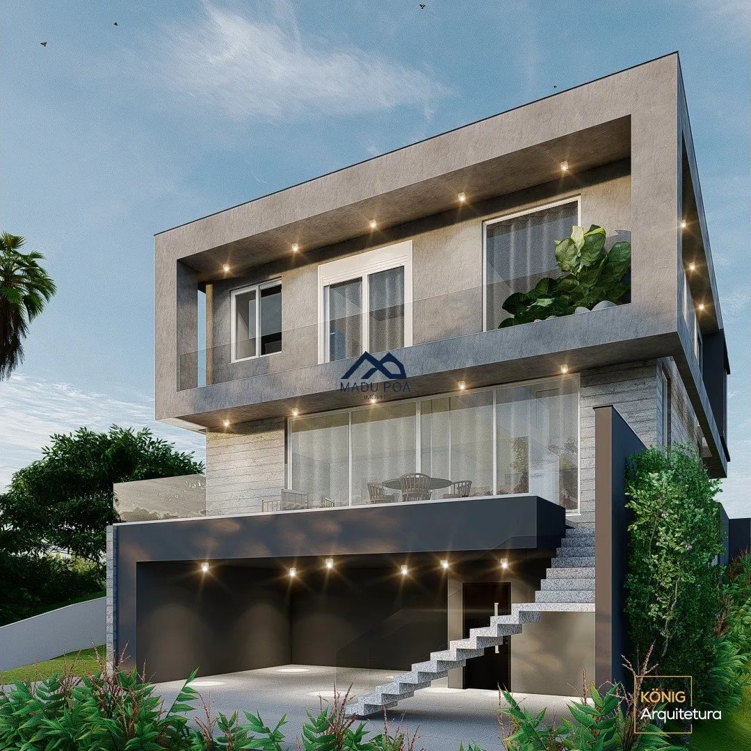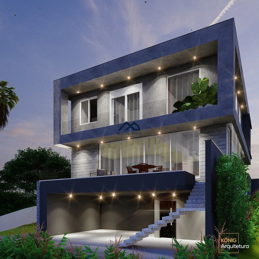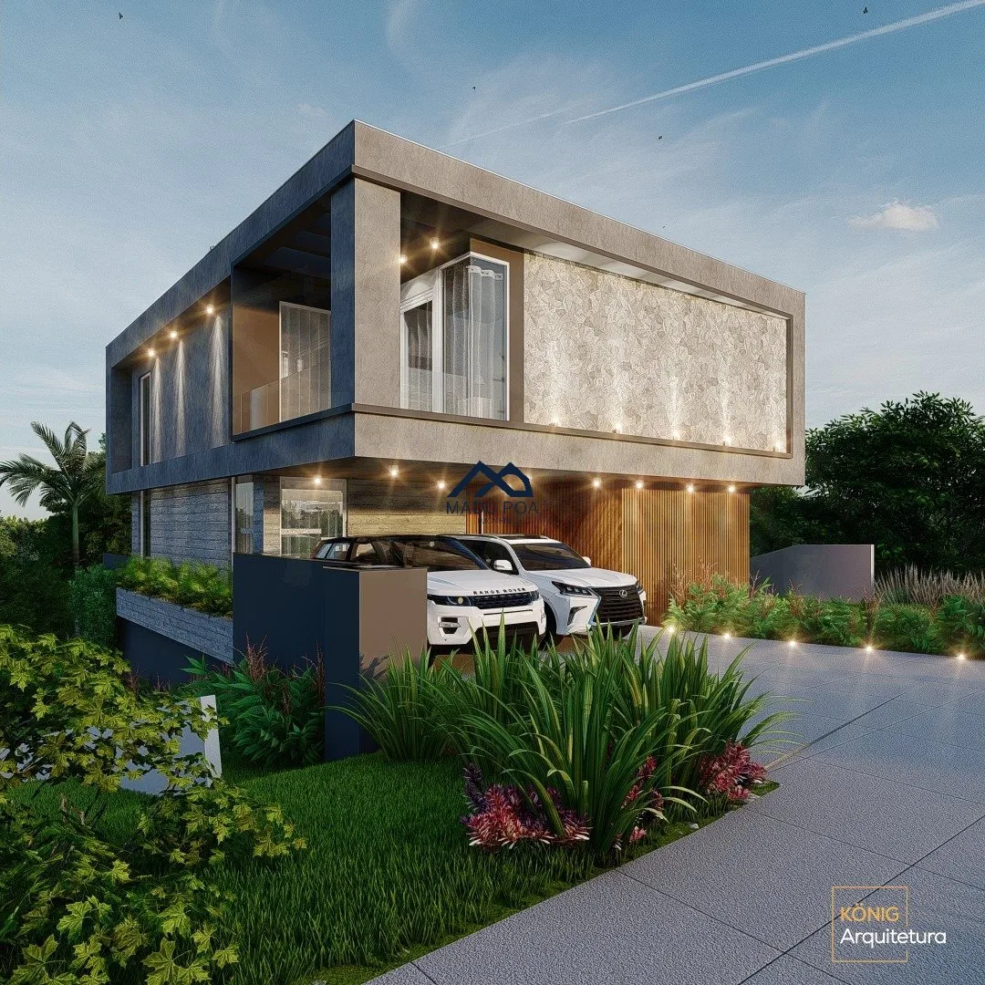 Piso térreo: Sala de estar com lareira, sala de jantar, espaço gourmet com churrasqueira e ilha na cozinha, lavabo, banheiro externo, depósito, despensa e área de serviço. Pátio com espera para piscina. Garagem para 2 carros.