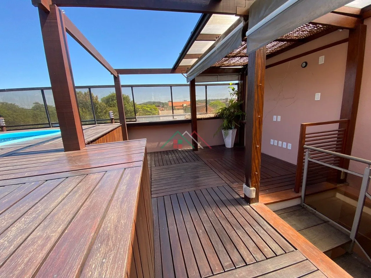Piso térreo: living para 2 ambientes com lareira, lavabo, copa/cozinha com despensa, pátio com espaço gourmet, churrasqueira, depósito, banheiro auxiliar, lavanderia, garagem coberta para 2 carros e 1 descoberta. Acesso ao terraço com piscina e banheiro completo.