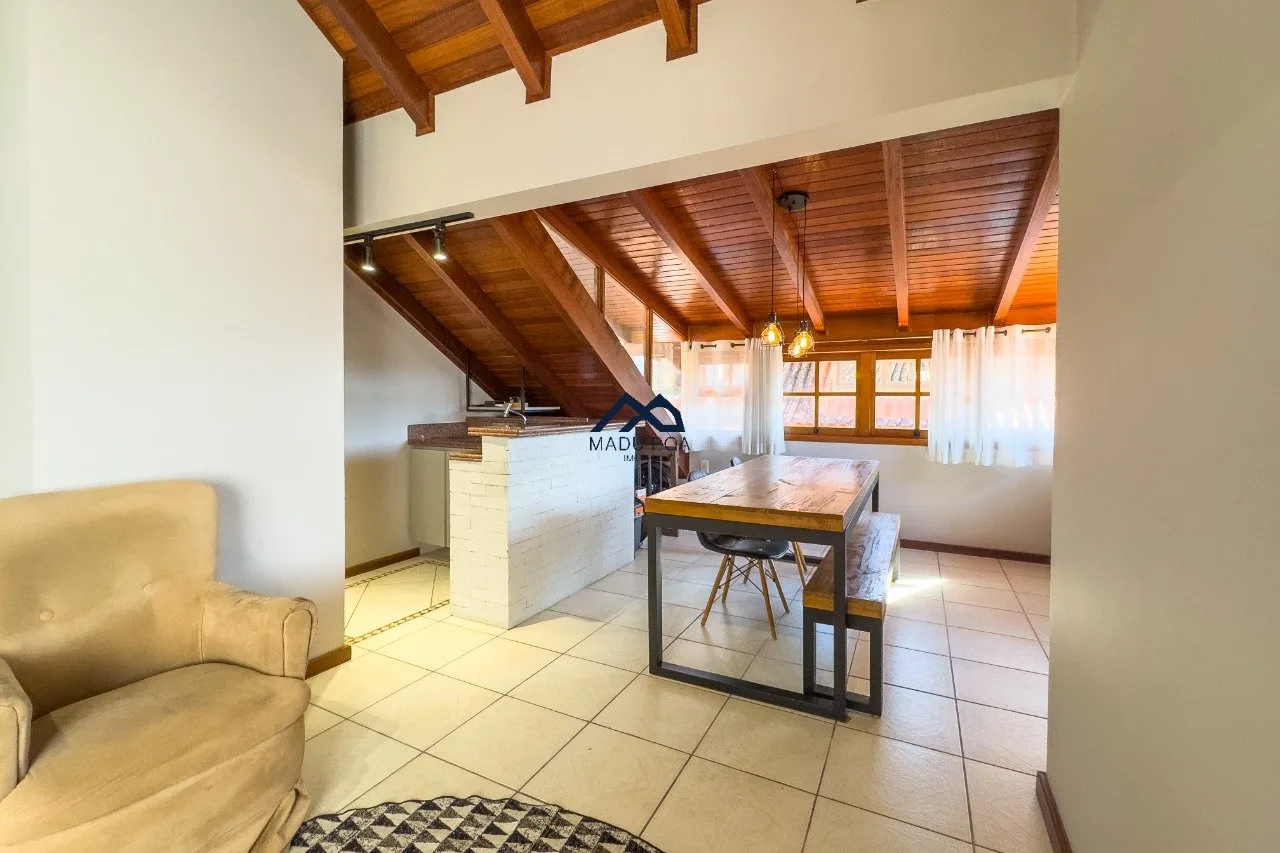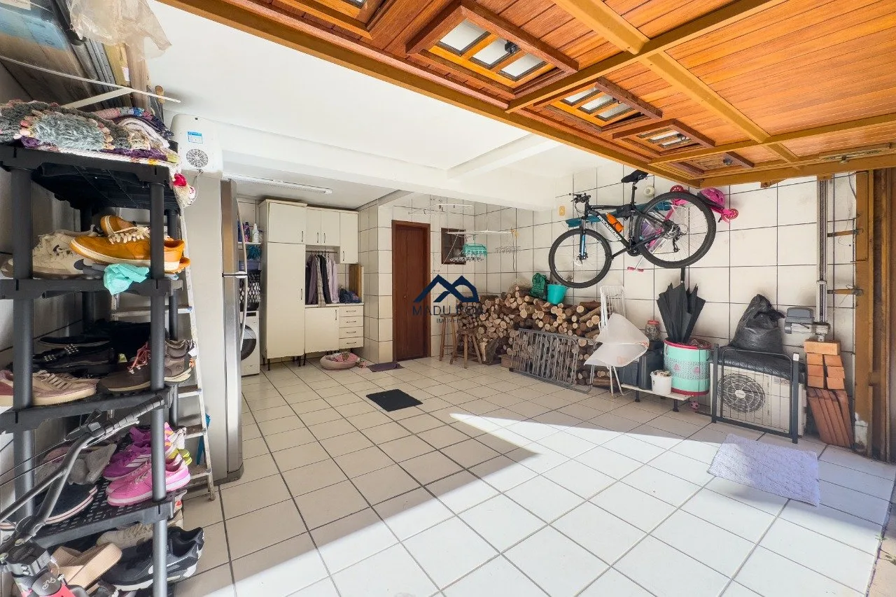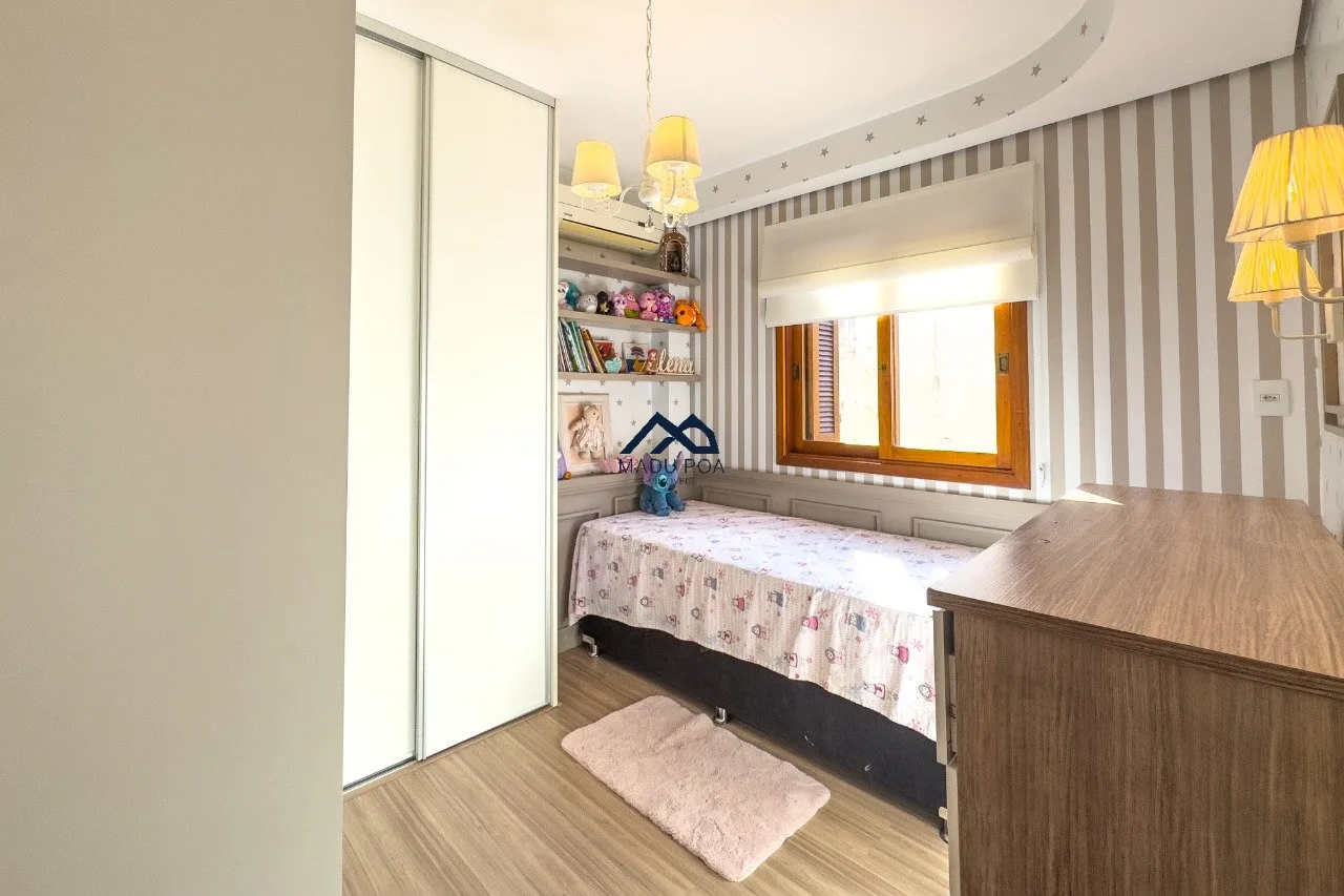 Térreo: living para 2 ambientes com lareira, lavabo, cozinha montada, churrasqueira, jardim de inverno coberto com vidro, lavanderia e garagem fechada para 2 carros.