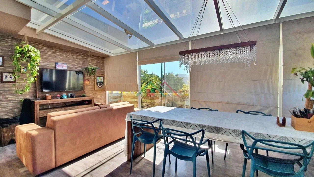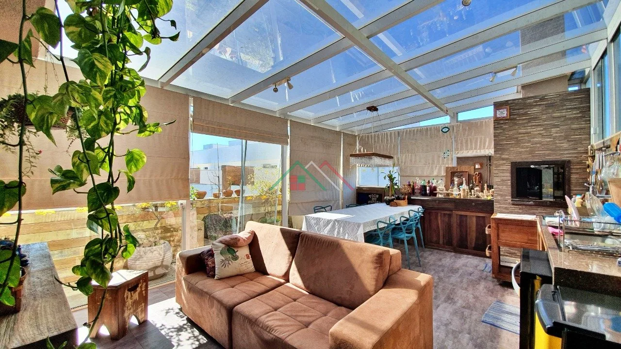 Living amplo com cozinha integrada, lavabo, lavanderia, espaço funcional com banheiro, pátio com área gourmet, churrasqueira com forno para pizza e piscina aquecida.