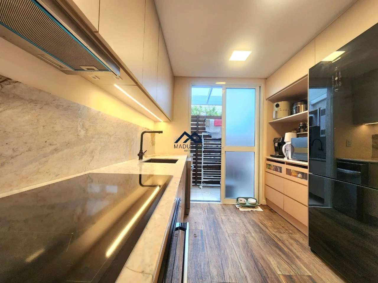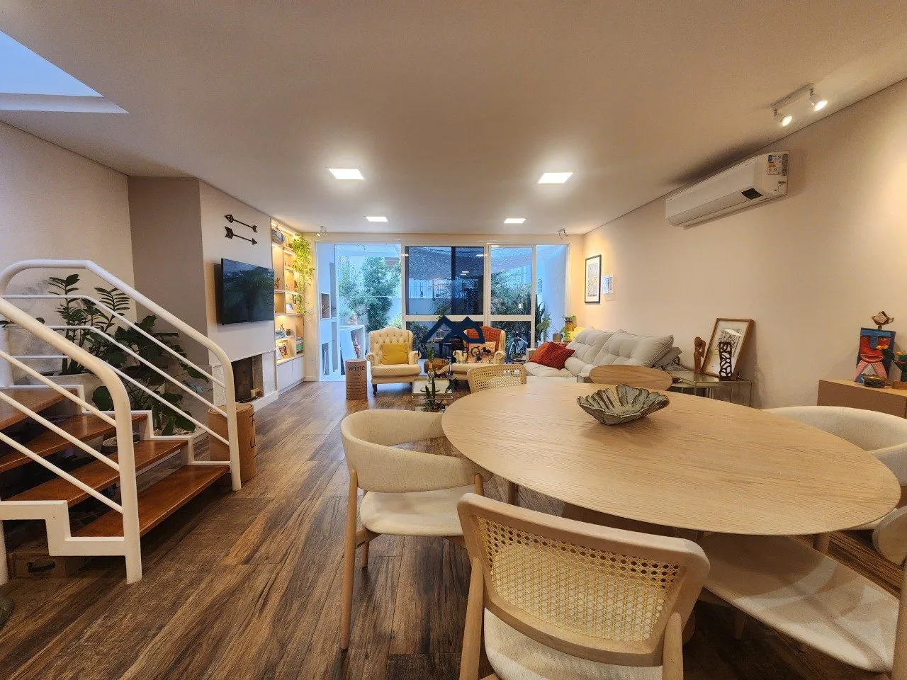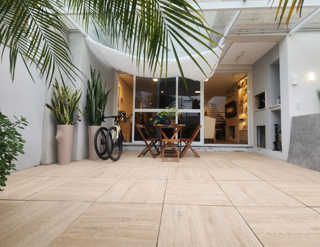 1° Pavimento: Living para dois ambientes integrados a cozinha americana, lavabo, área de serviço independente e pátio privativo com churrasqueira.
