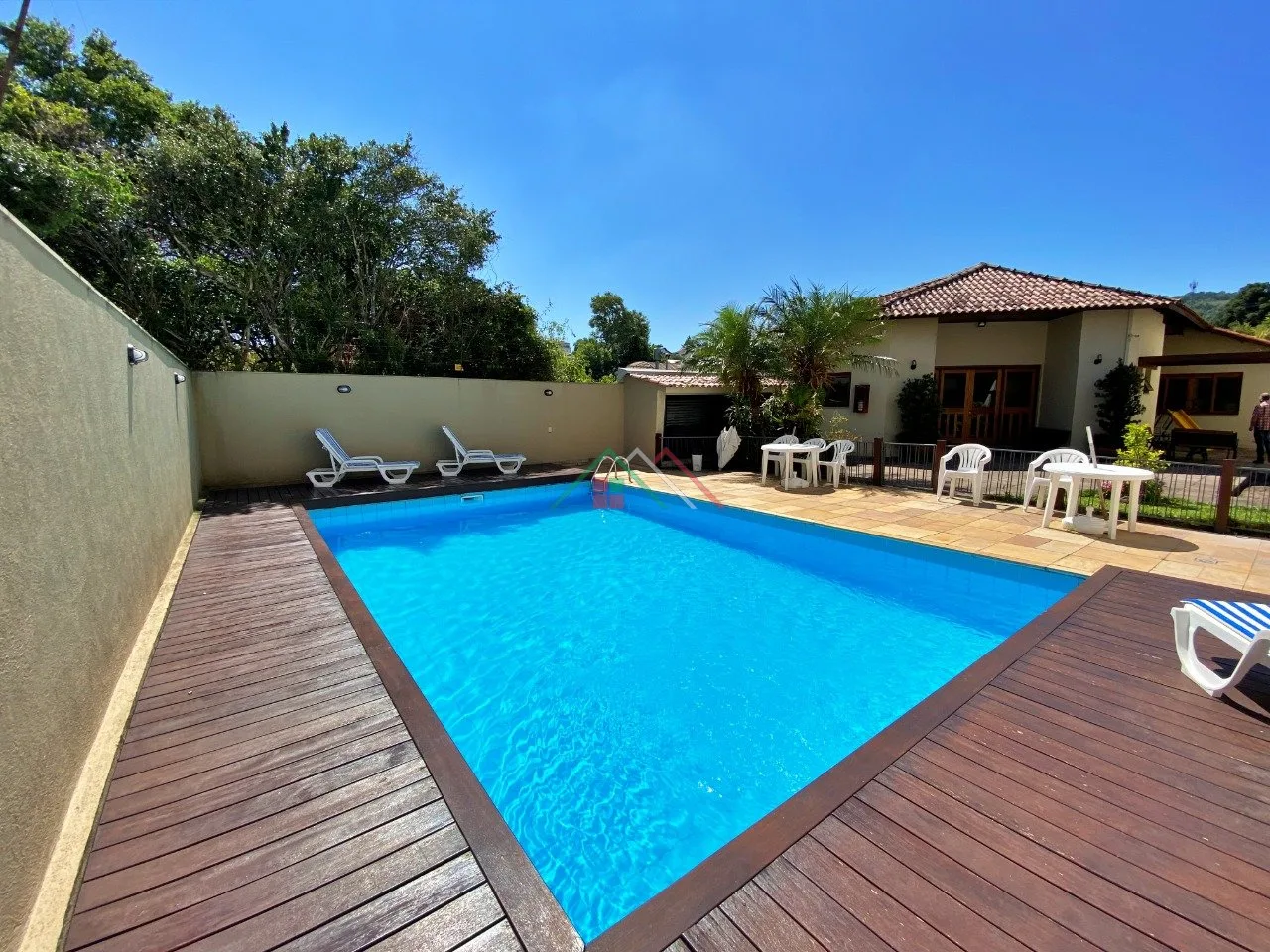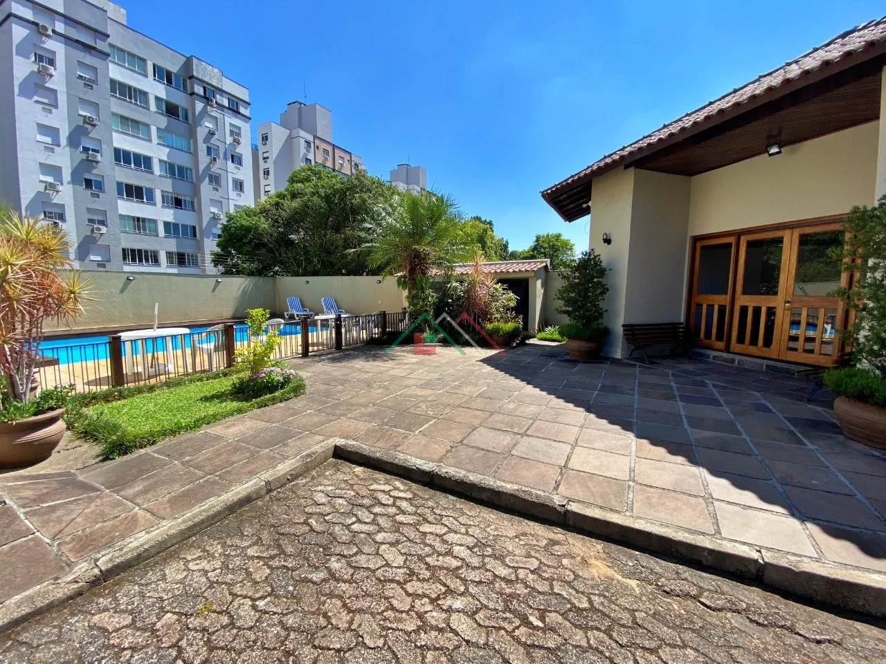 Condomínio com salão de festas, piscina, pequeno playground.