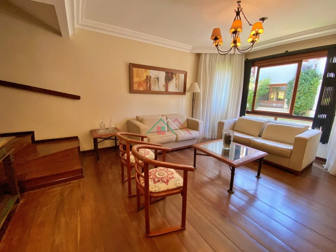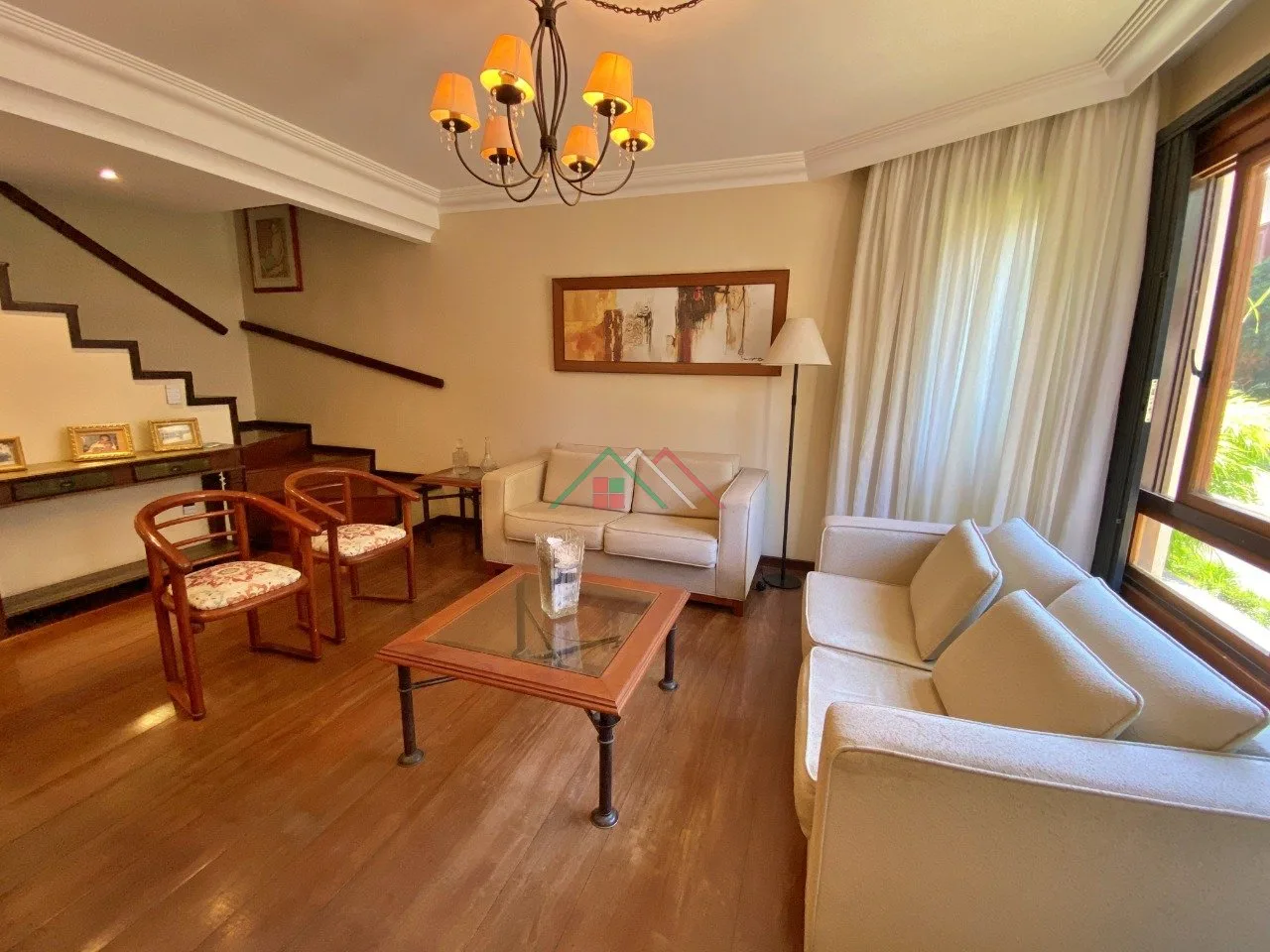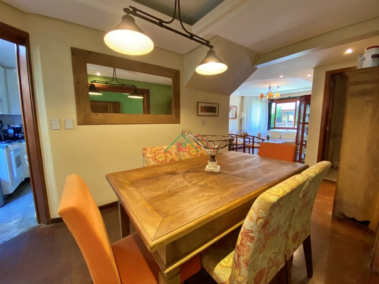 Piso térreo: Living, sala de jantar, lavabo, cozinha mobiliada, lavanderia, garagem com churrasqueira, pequeno pátio, vaga para 2 carros cobertos.
