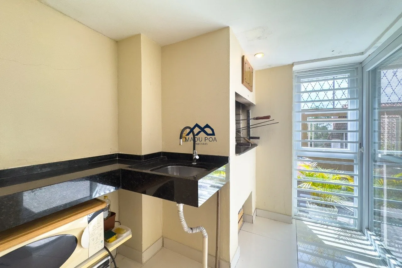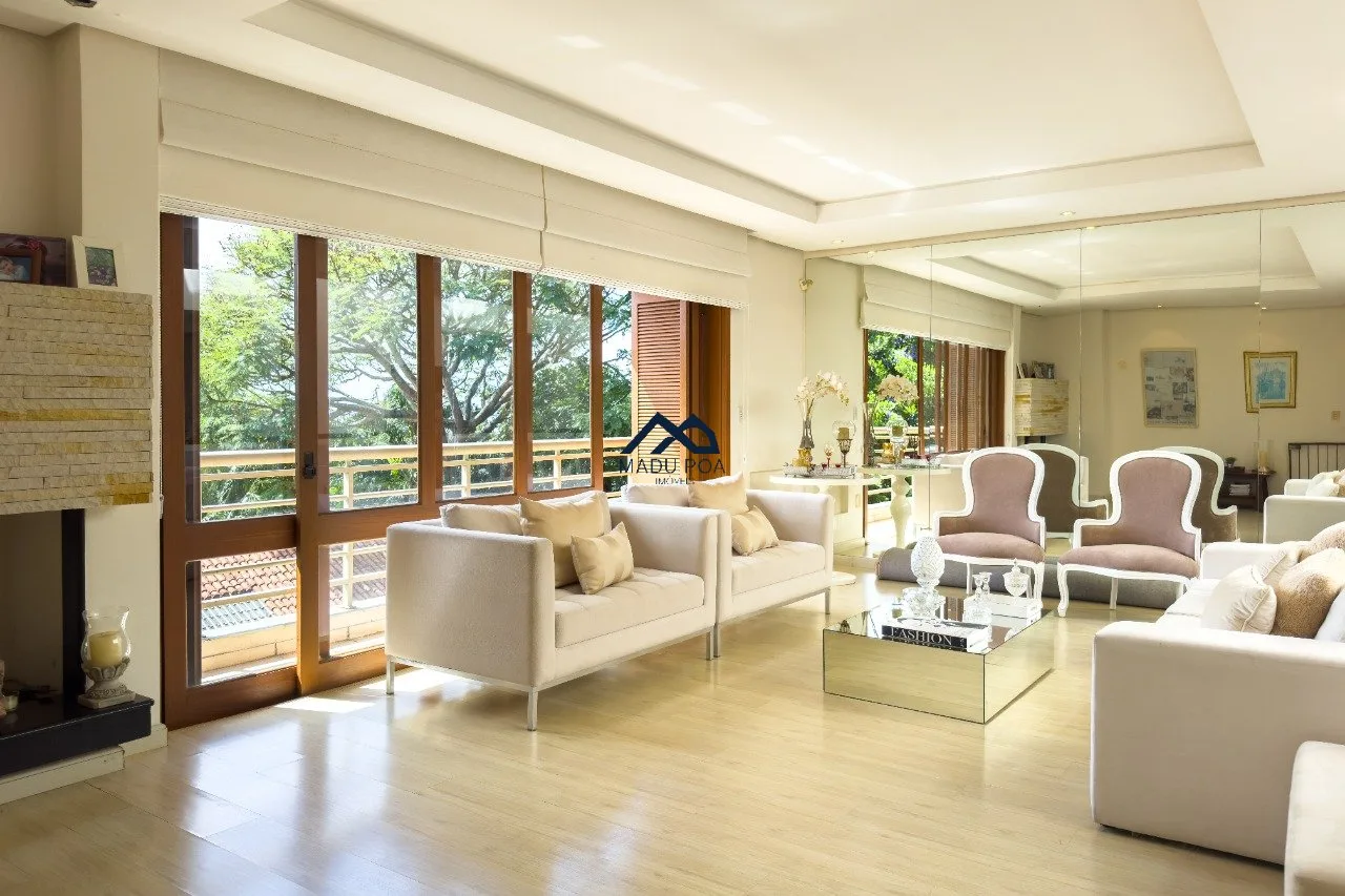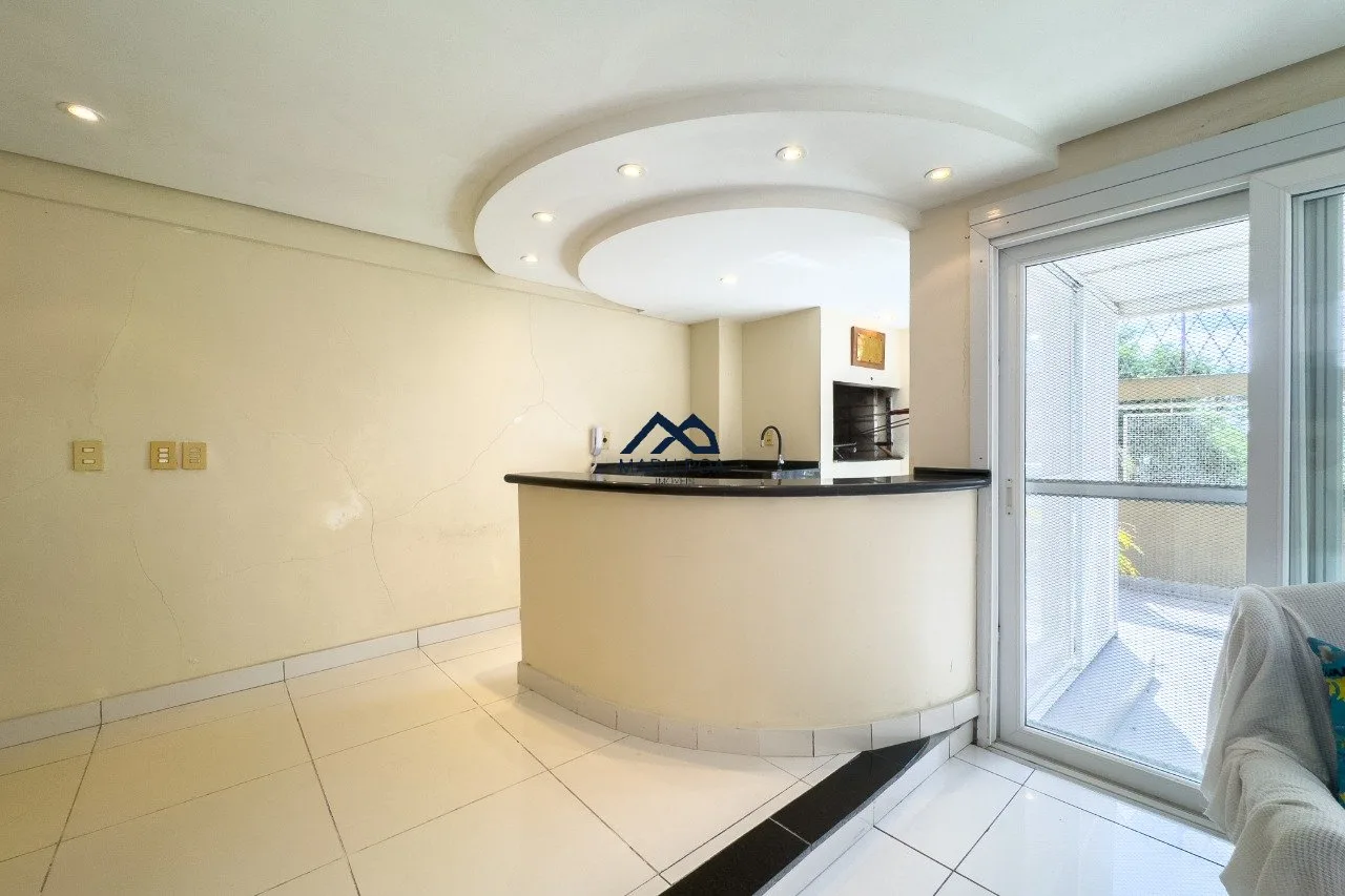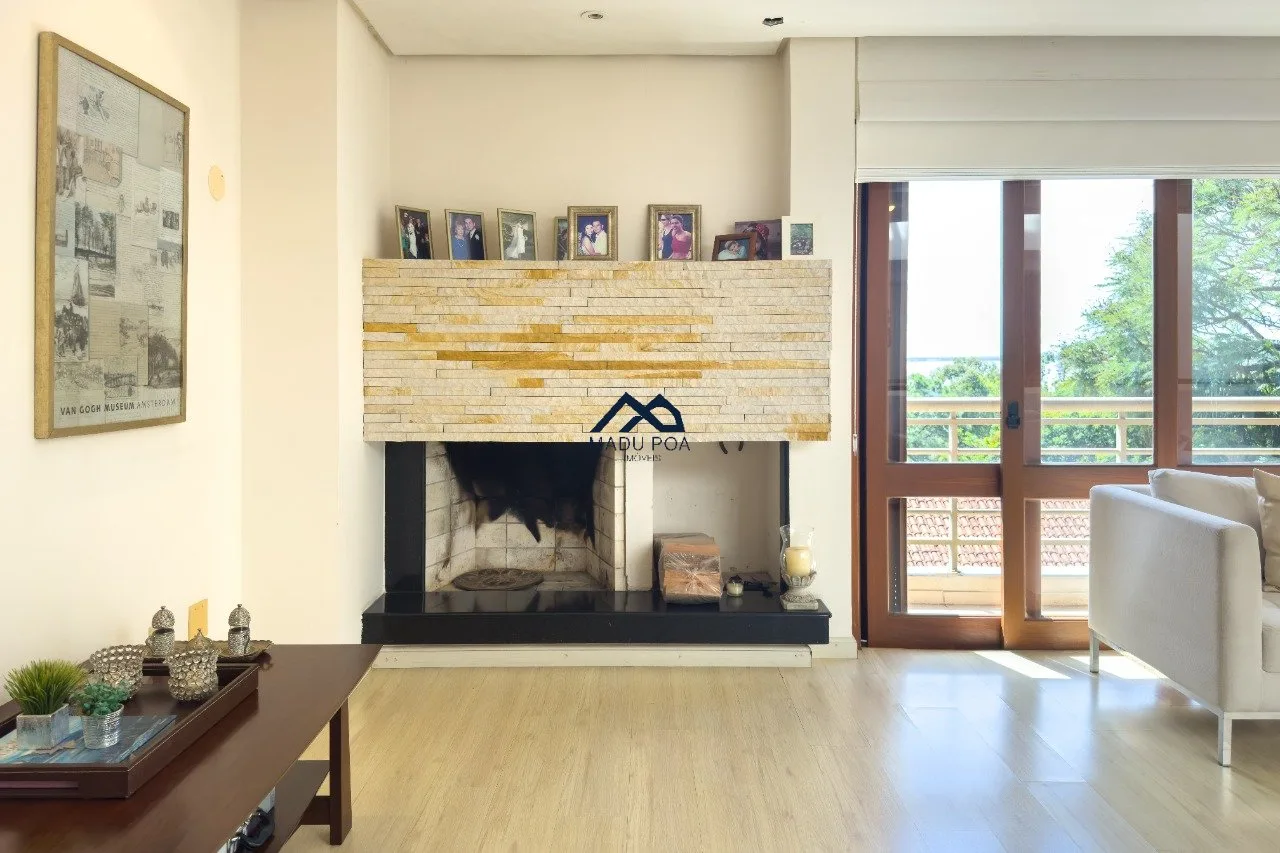 Living amplo com sacada integrada, lareira, lavabo, copa e cozinha planejada, Gabinete , espaço gourmet com churrasqueira pátio e piscina. São três dormitórios, um deles suíte máster. Garagem para dois carros.