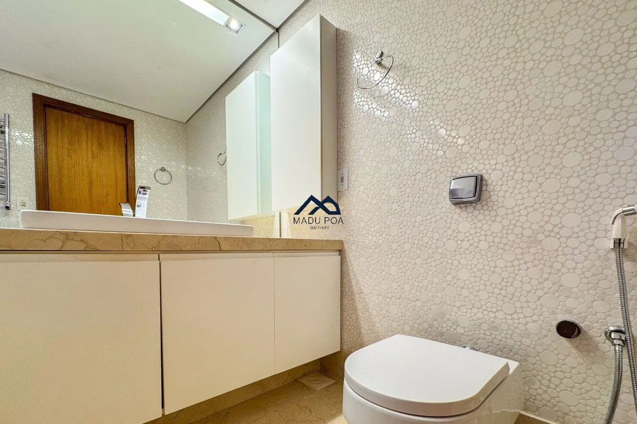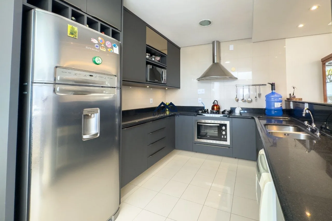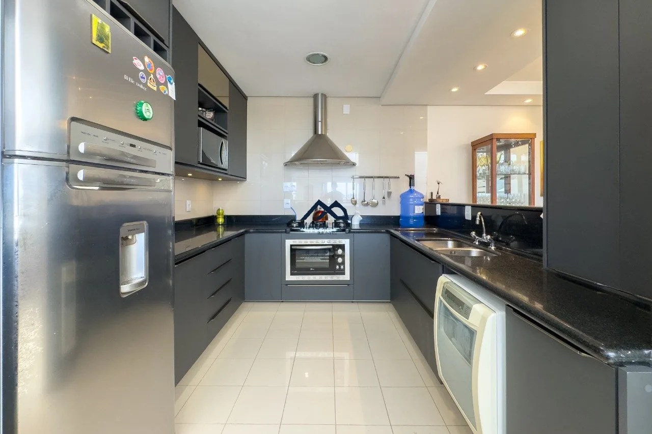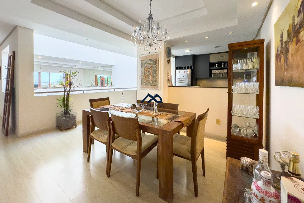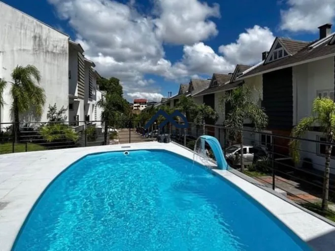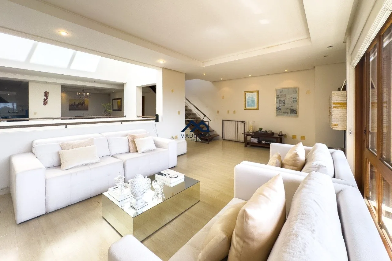 Living amplo com sacada integrada, lareira, lavabo, copa e cozinha planejada, Gabinete , espaço gourmet com churrasqueira pátio e piscina. São três dormitórios, um deles suíte máster. Garagem para dois carros.