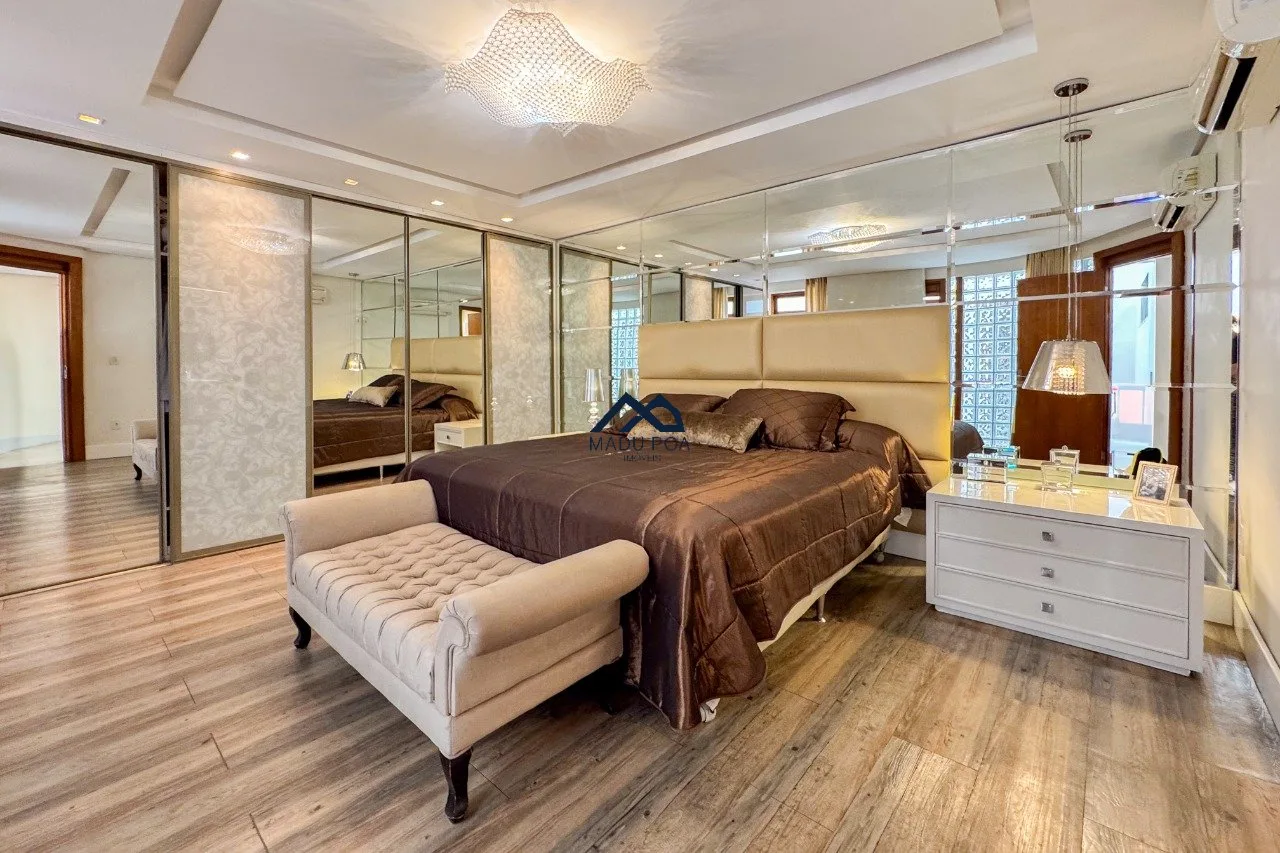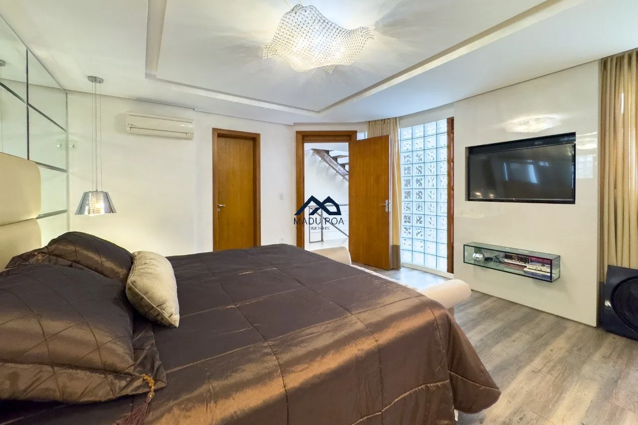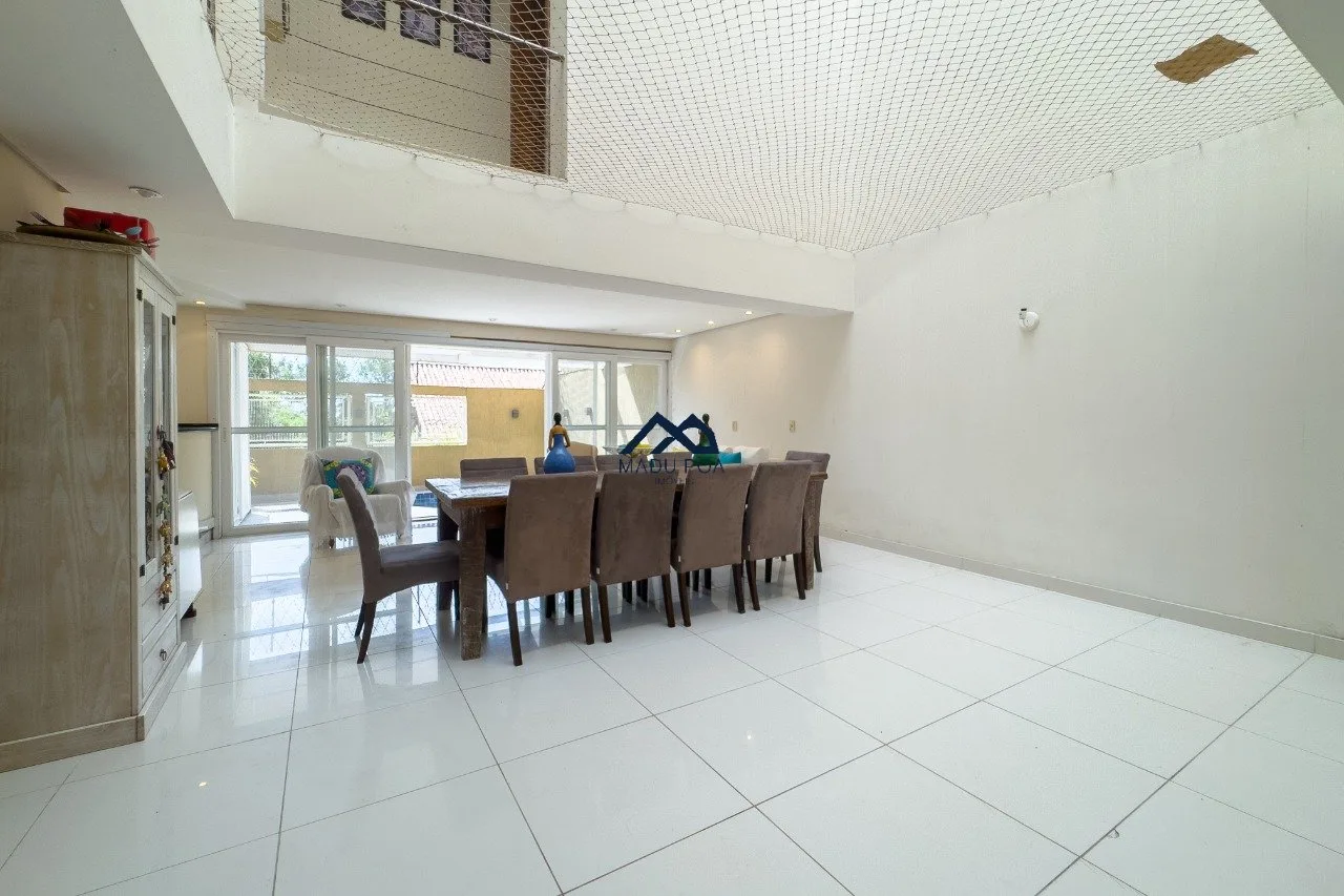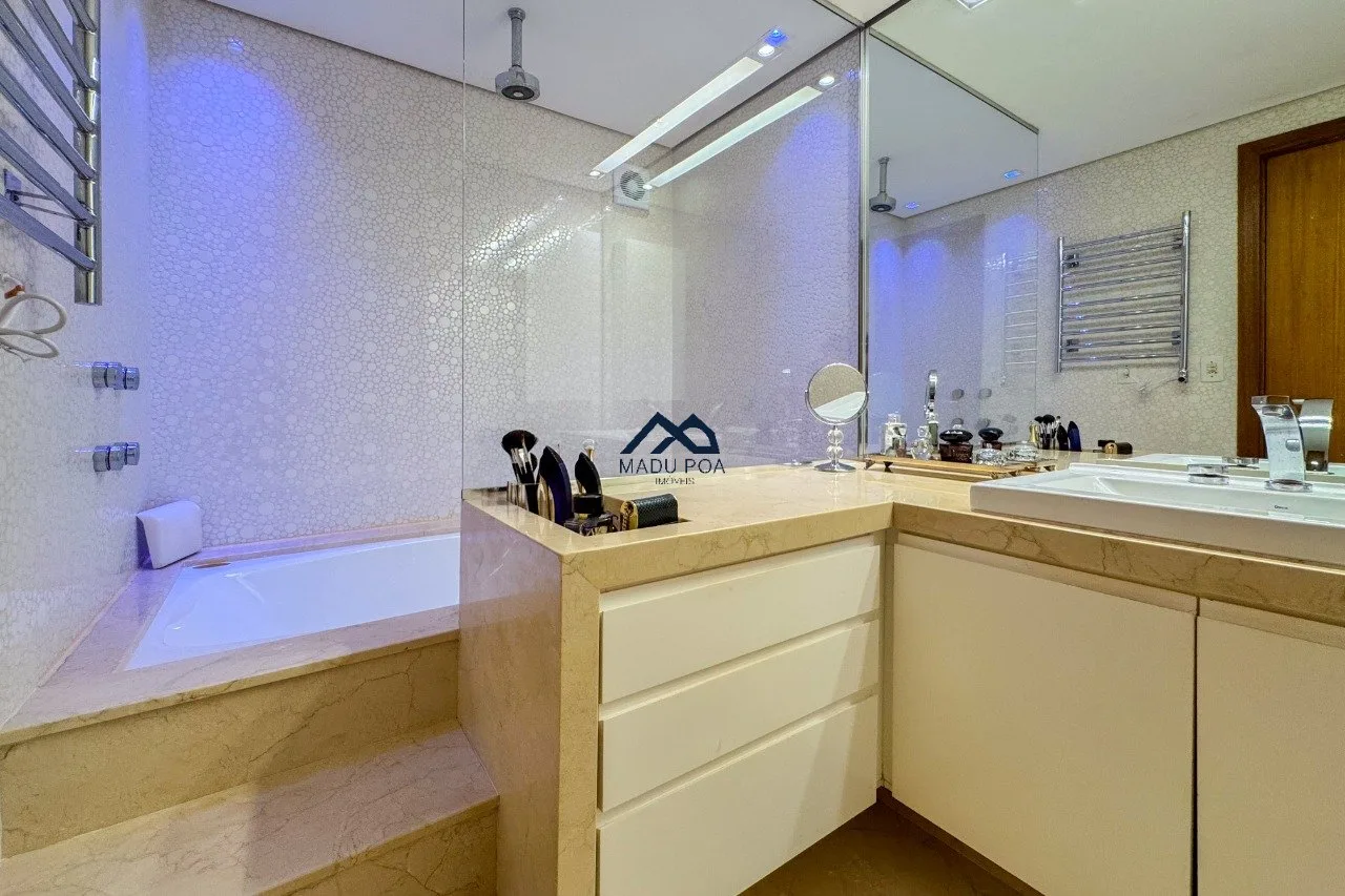 Living amplo com sacada integrada, lareira, lavabo, copa e cozinha planejada, Gabinete , espaço gourmet com churrasqueira pátio e piscina. São três dormitórios, um deles suíte máster. Garagem para dois carros.