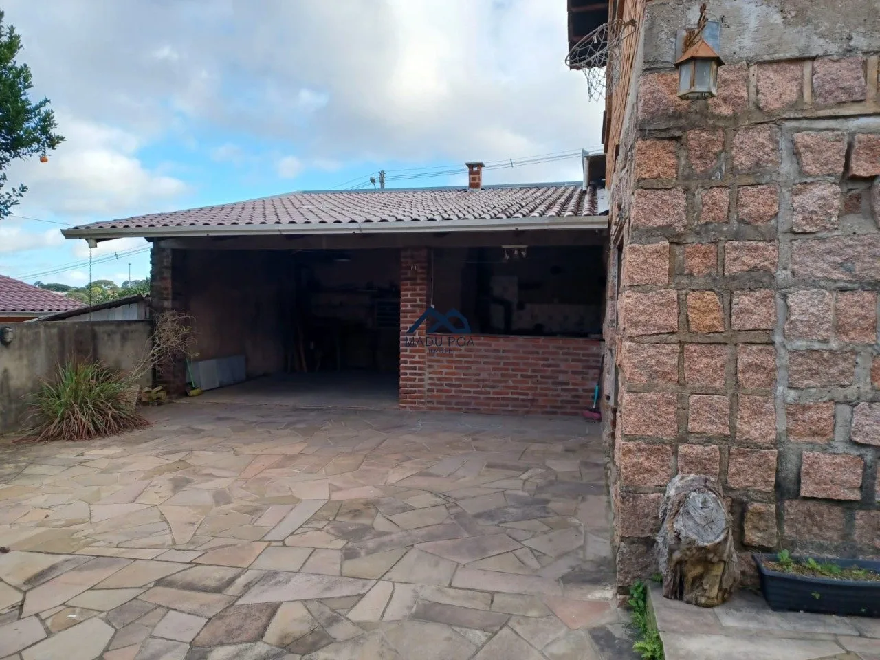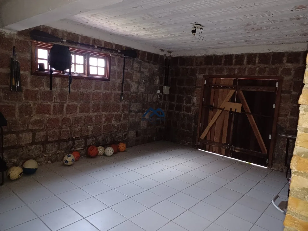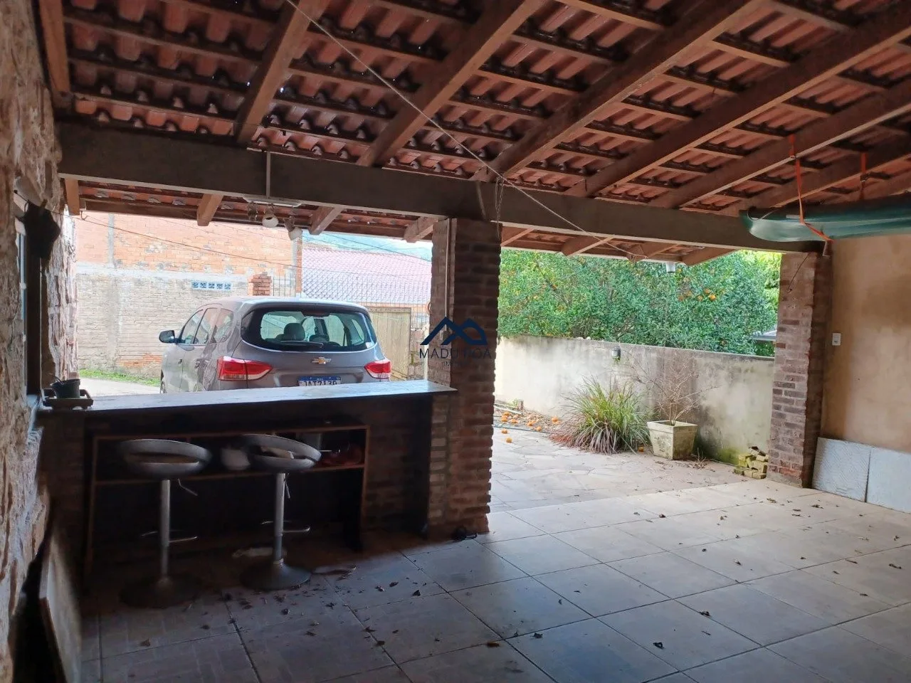 1° Pavimento: Salão de festas com churrasqueira, área de serviço, um banheiro e garagem coberta para dois carros e descoberta para mais e amplo pátio.