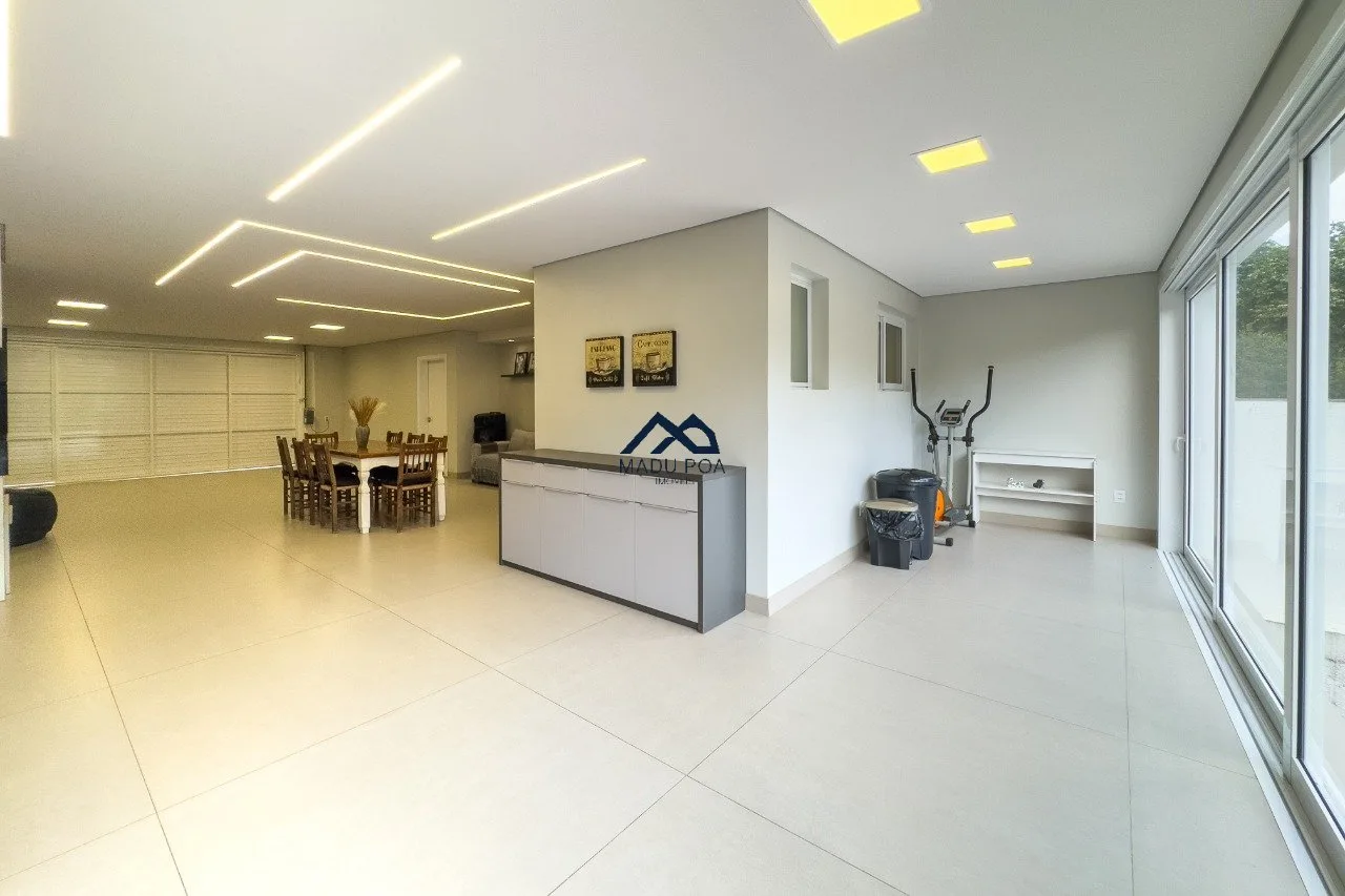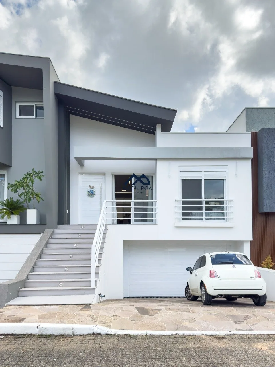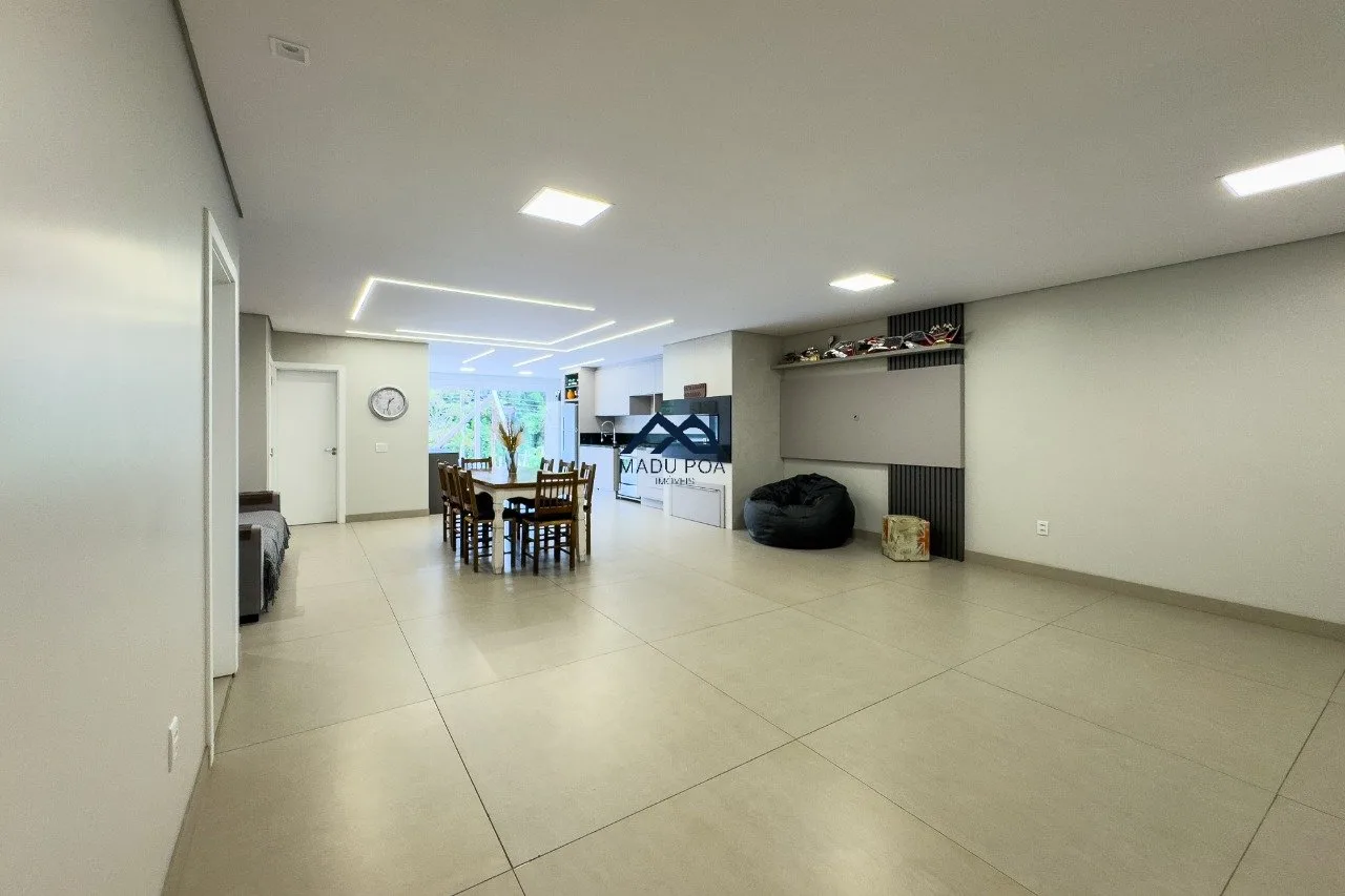Primeiro piso(nível da garagem):Salão de festas, área gourmet, lavanderia, banheiro social, despensa (opção para o terceiro dormitório). Garagem para 3 carros cobertos e espaço para mais dois em frente à casa. Pátio nos fundos com piscina(em construção).