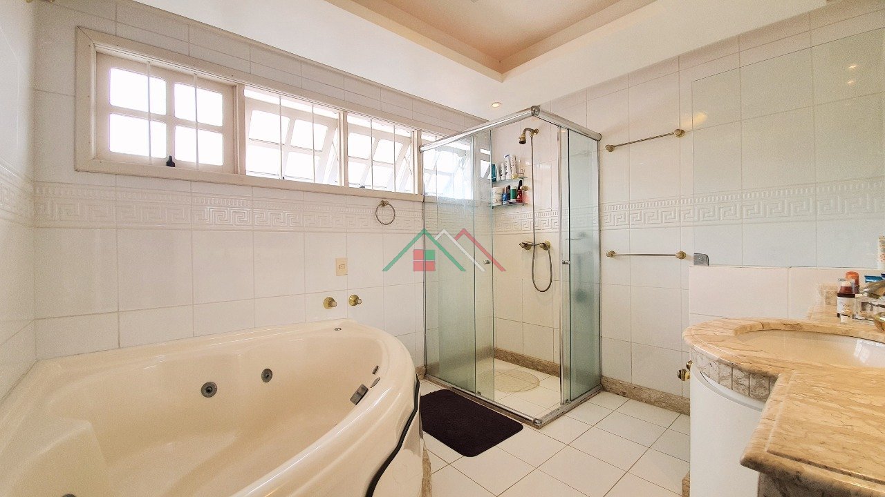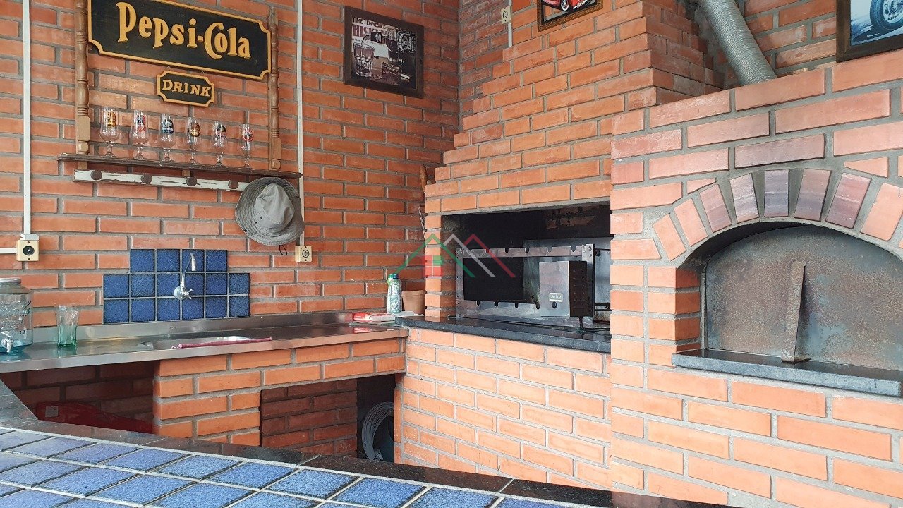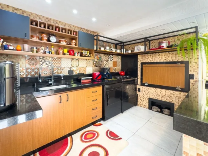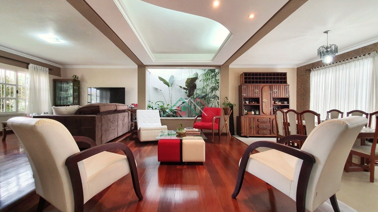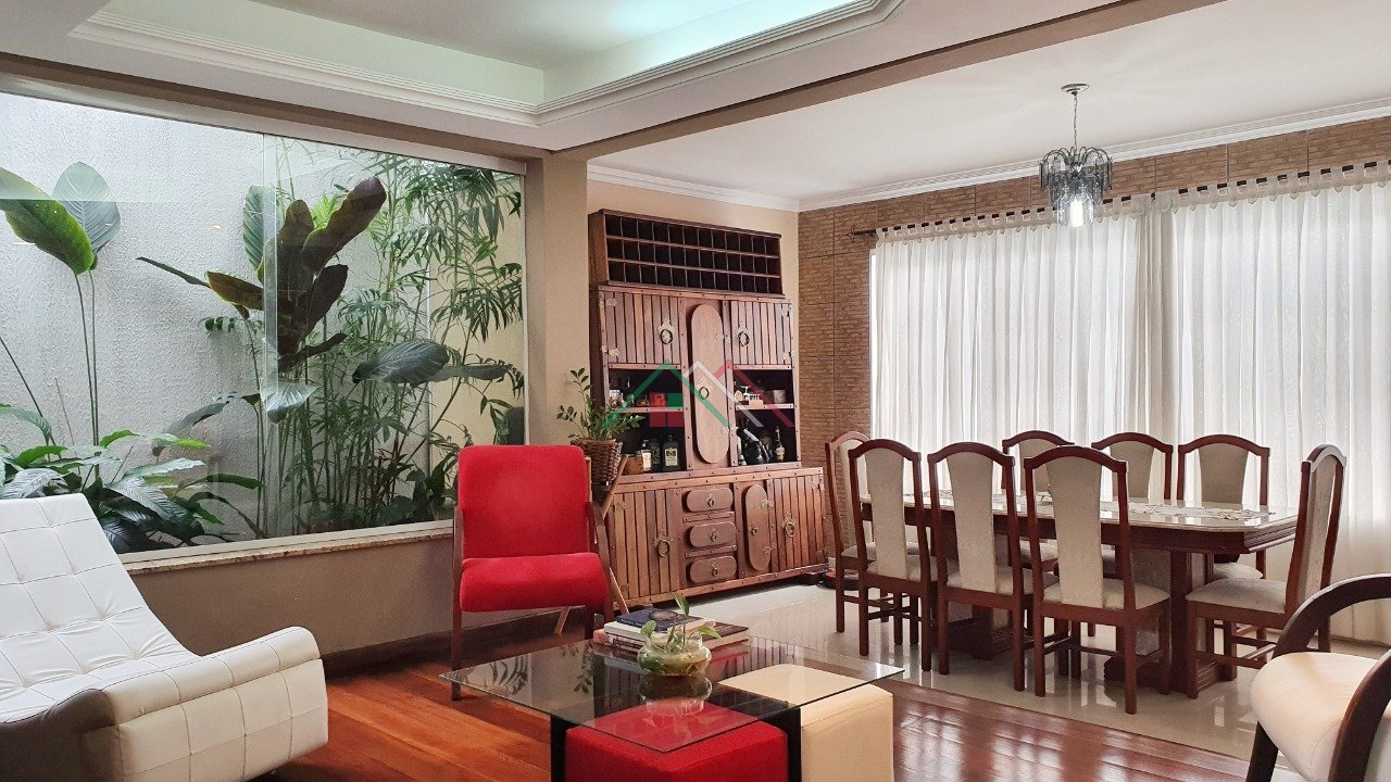 1º Pavimento: Living para dois ambientes com lareira, jardim de inverno, gabinete, copa cozinha, lavabo. Pátio com piscina e quiosque com forno para pizza e churrasqueira. Garagem com suíte.