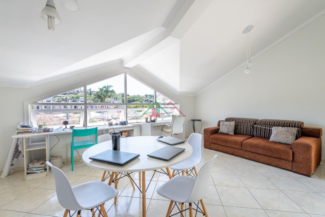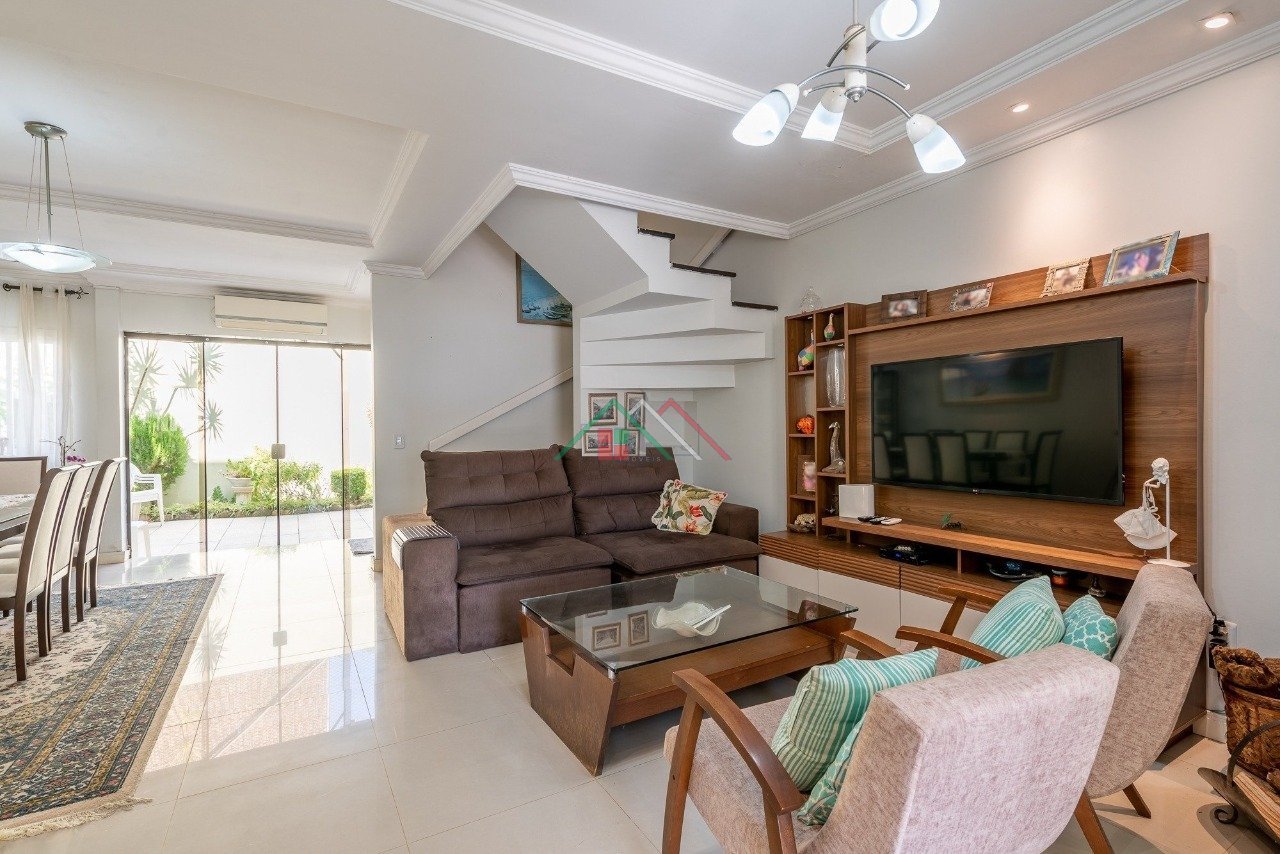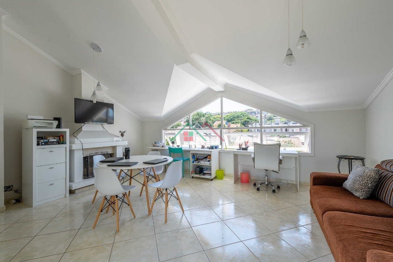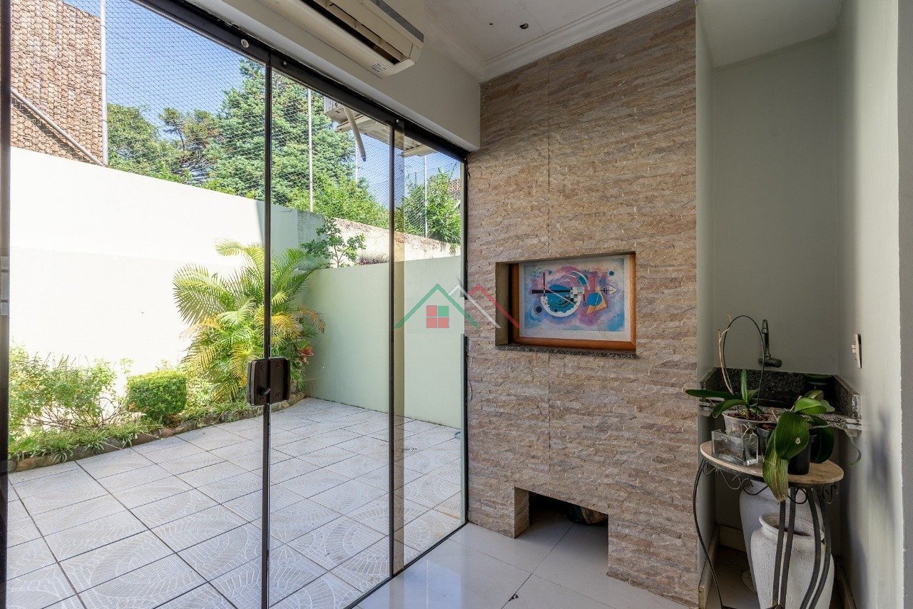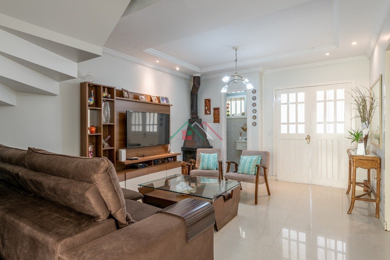 Piso térreo: Living para 2 ambientes, lareira, lavabo, cozinha americana mobiliada, lavanderia coberta, churrasqueira e pátio.