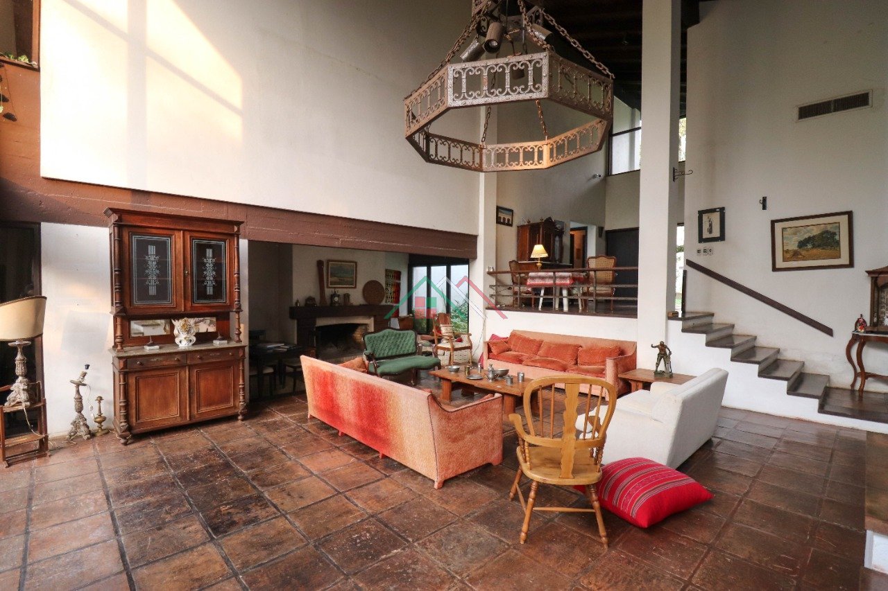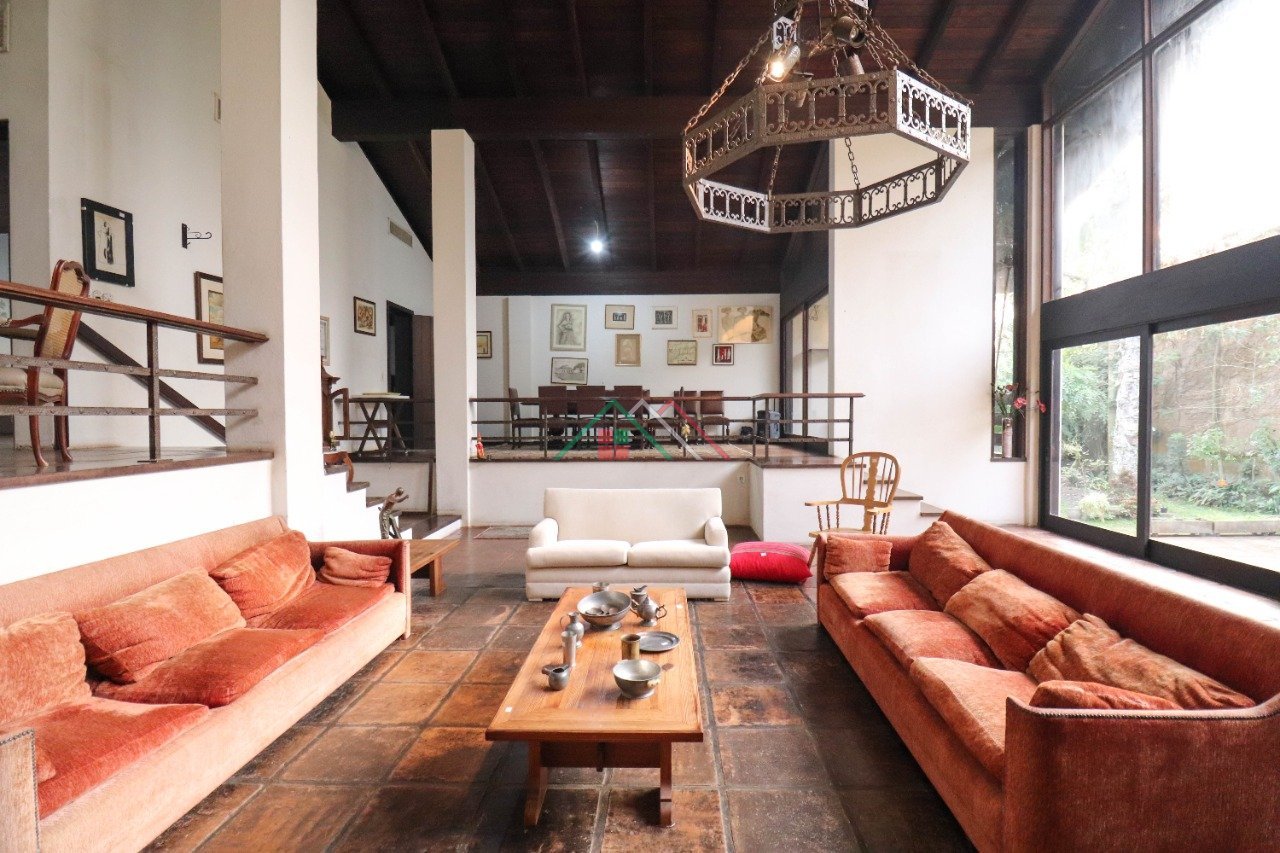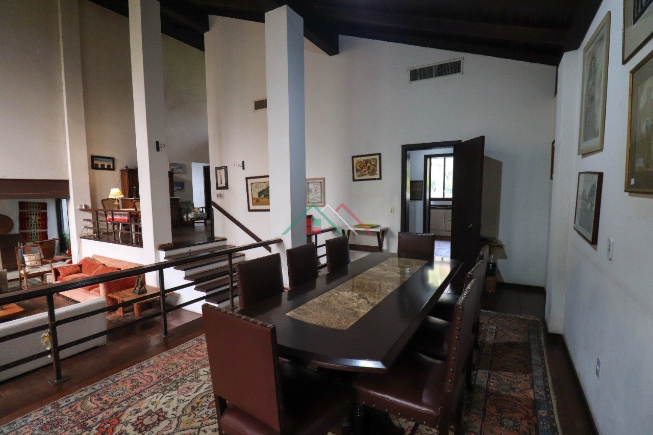 Hall de entrada com lavabo, um patamar abaixo living para três ambientes com lareira, sala de estar e jantar com amplas janelas para o pátio com pé direito alto.