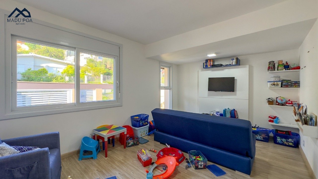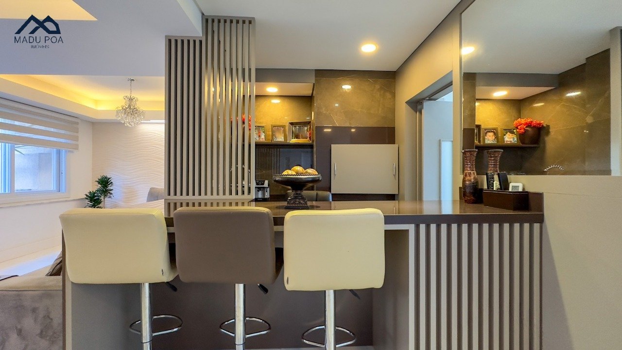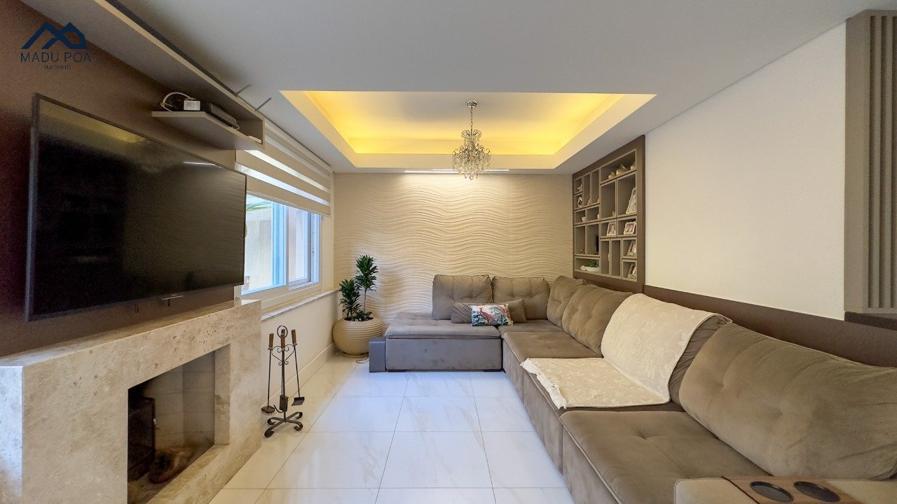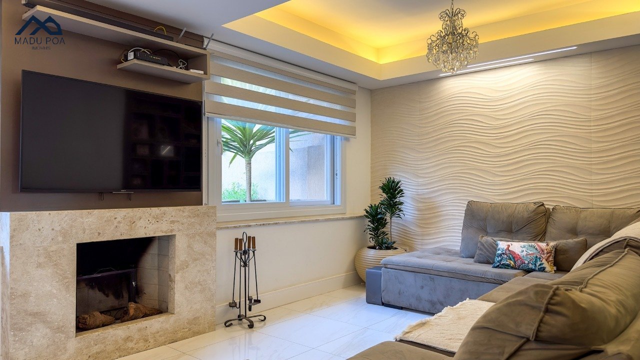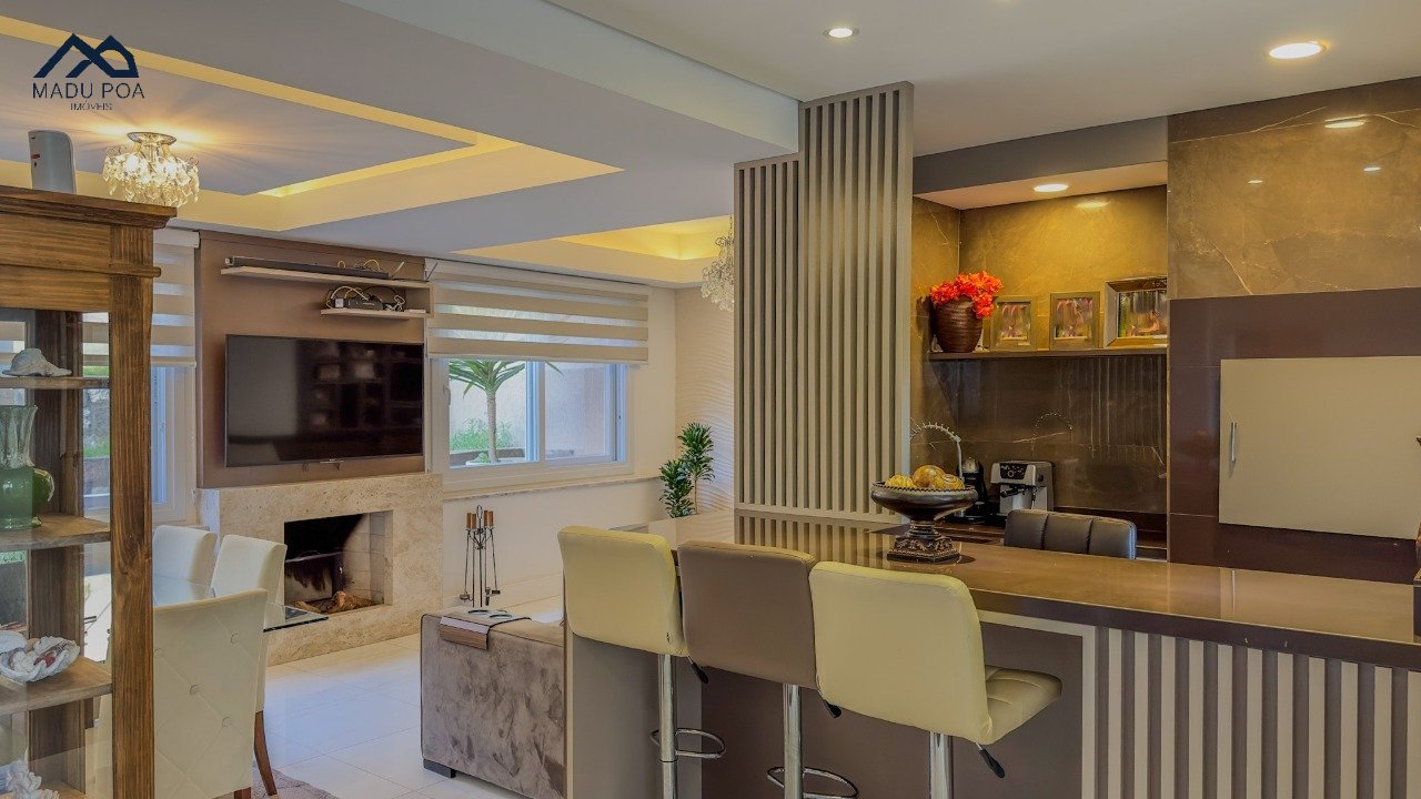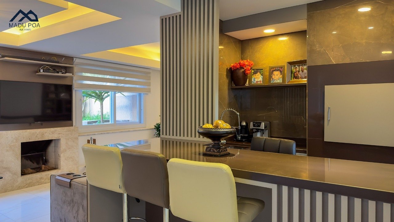 No 1º pavimento: hall, living para 03 ambientes, sendo 01 deles com churrasqueira, lareira, lavabo, copa-cozinha montada, área de serviço, despensa, garagem coberta para 04 carros e pátio bem amplo.