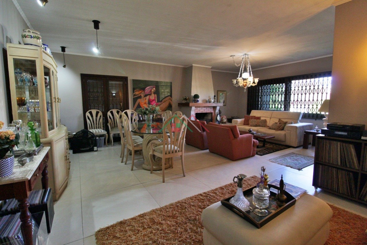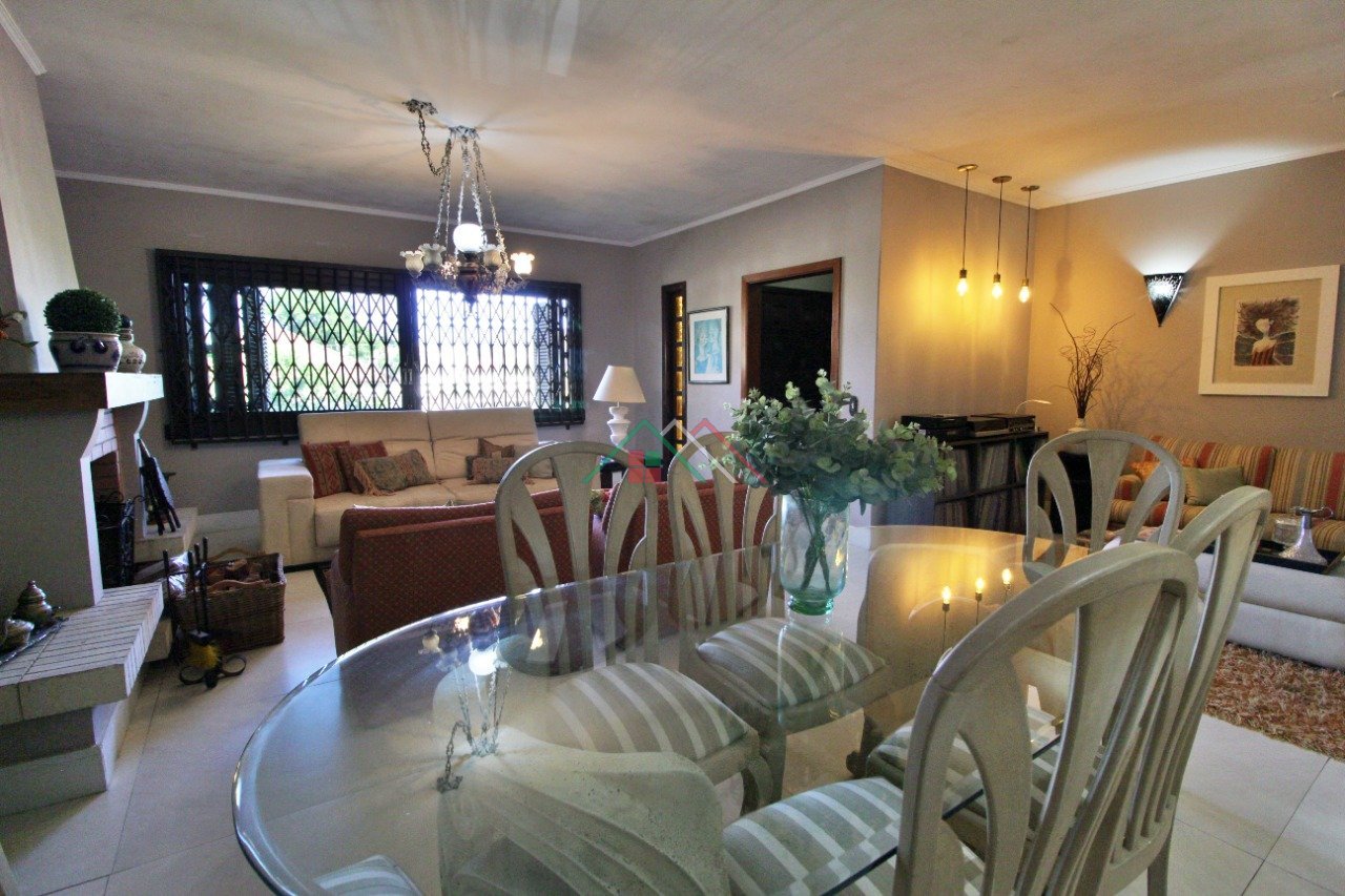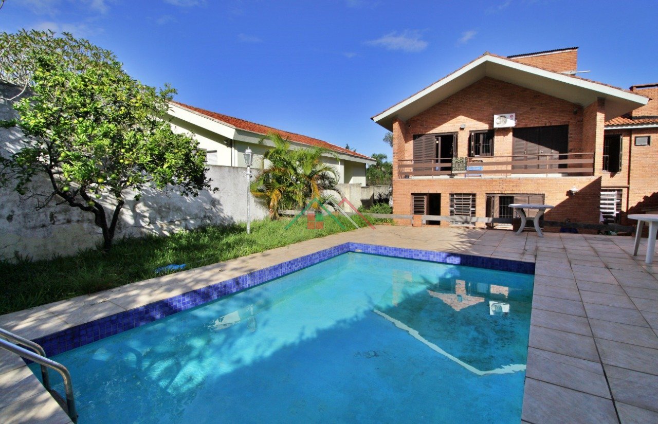 1° PAVIMENTO: Amplo living para três ambientes com lareira, lavabo, cozinha com armários embutidos, lavanderia, garagem coberta para três carros e pátio com piscina.