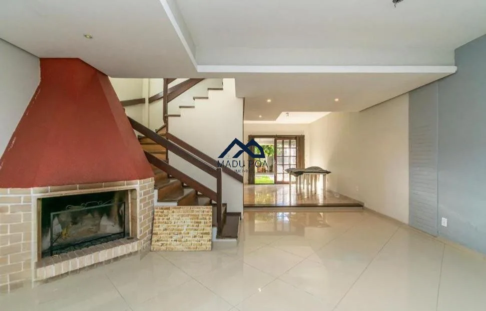 Living para dois ambientes, lareira, lavabo, cozinha americana com móveis planejados, espaço gourmet, área de serviço, banheiro e pátio com arvores frutíferas.
