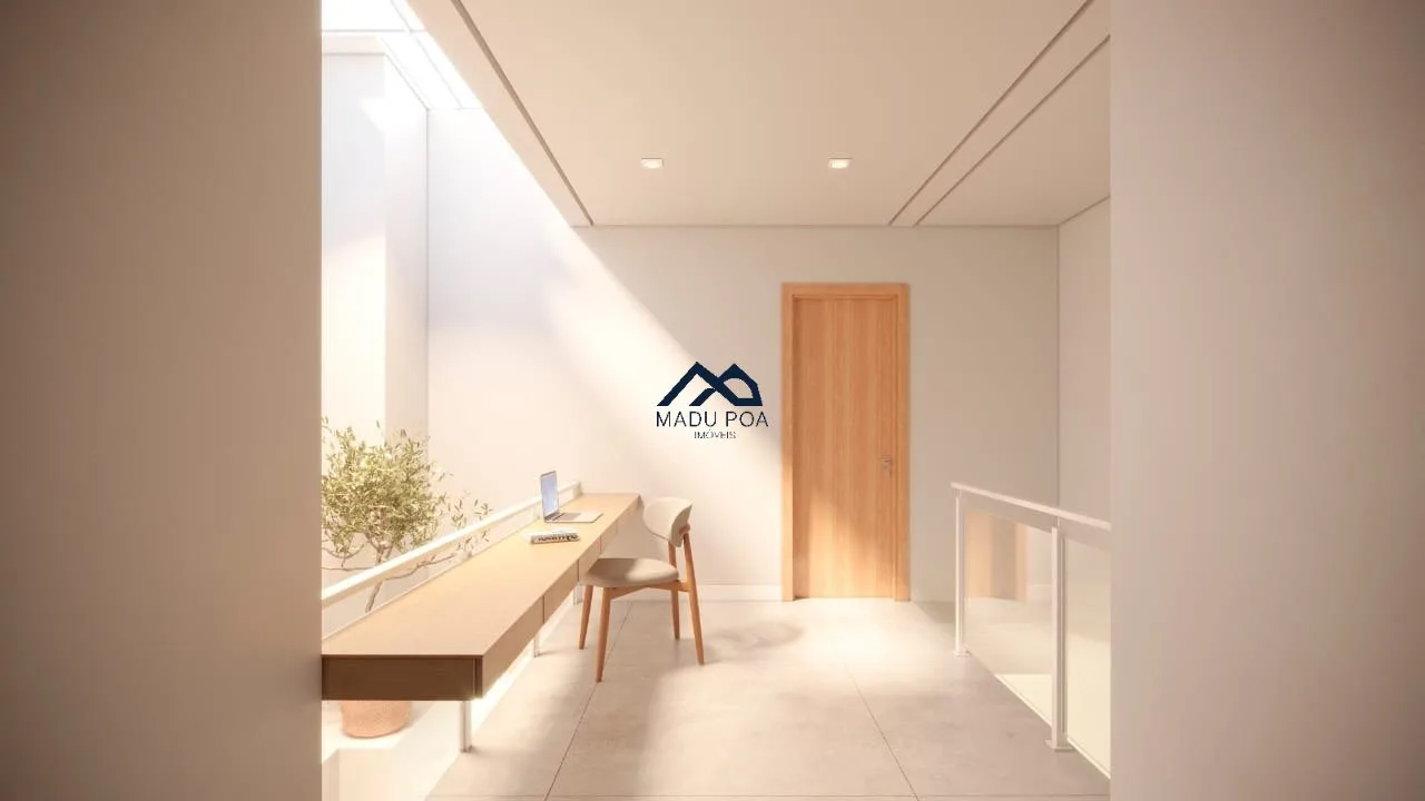 2º PAVIMENTO: Mezanino que possibilita área de convivência, escritório, um ótimo espaço multiuso com acesso as três suítes, sendo a principal com janela ampla que proporciona excelente iluminação e com vista perene para o lindo pátio.